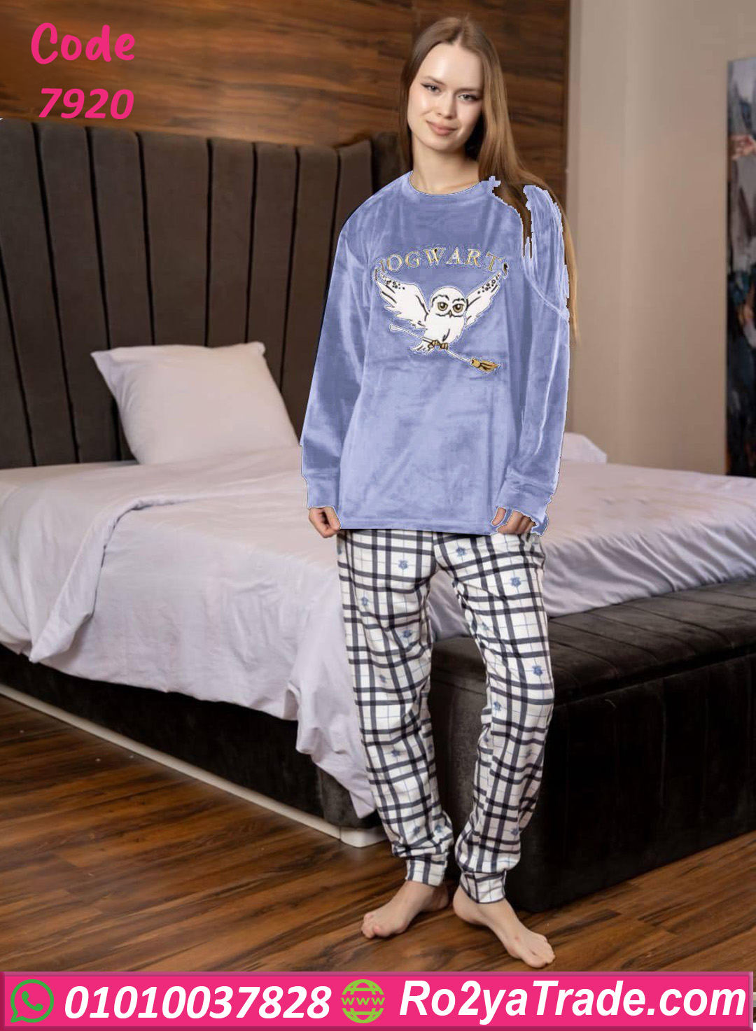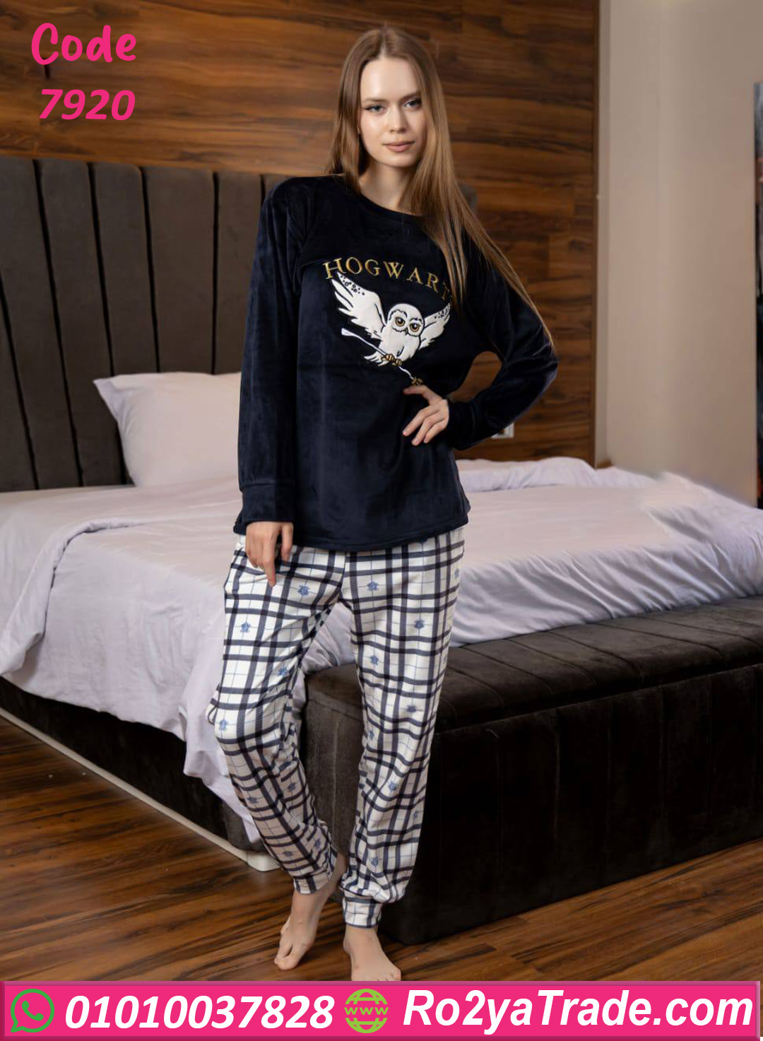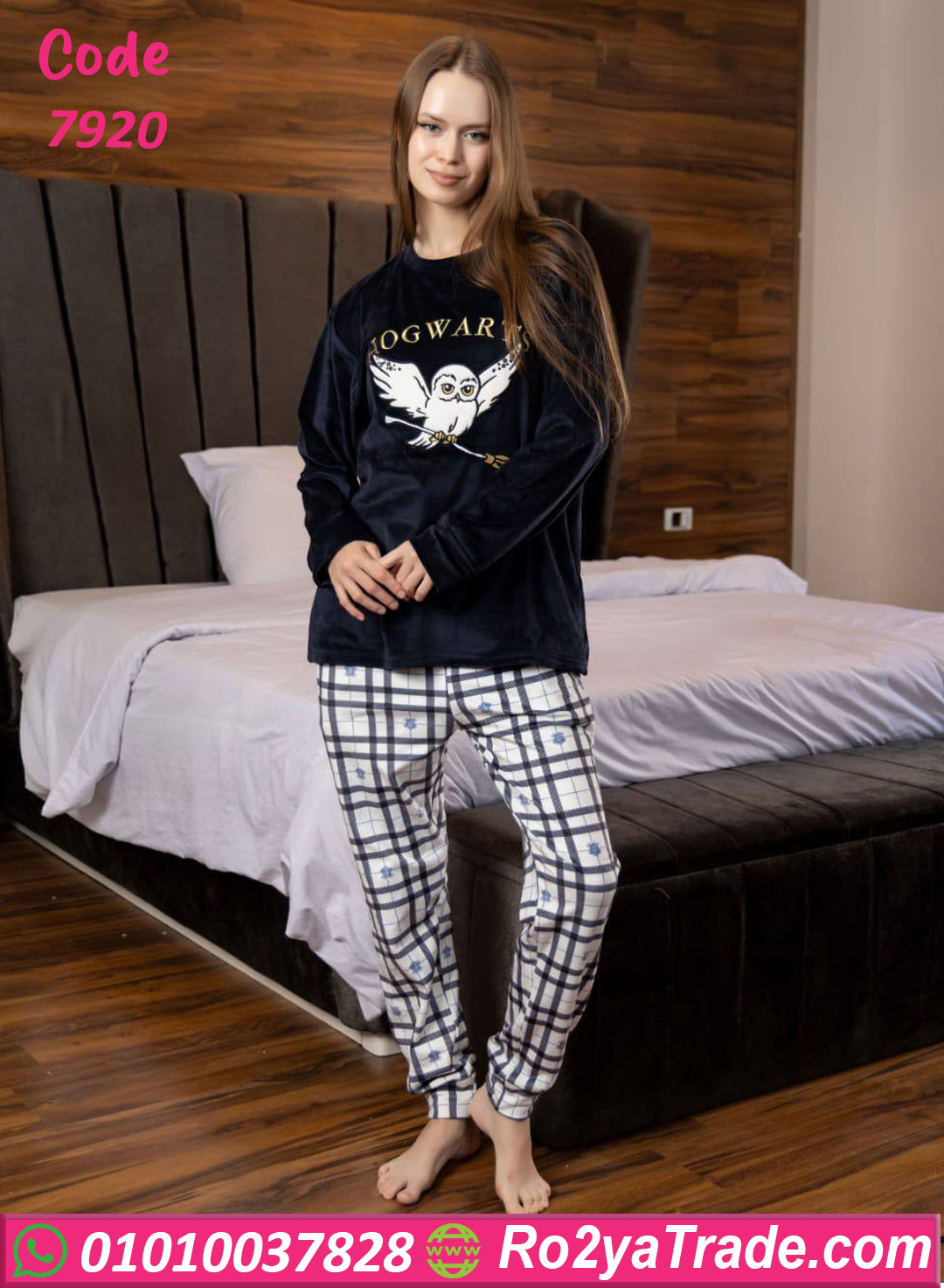 بيجامة شتوي بخامة قطيفة سوفت على الجسم، تمنحك الدفا والراحة مع شكل شبابي جميل. العلوي مطبوع عليه تصميم Hogwarts مع بومة هيدويچ اللطيفة لعشاق عالم السحرة!