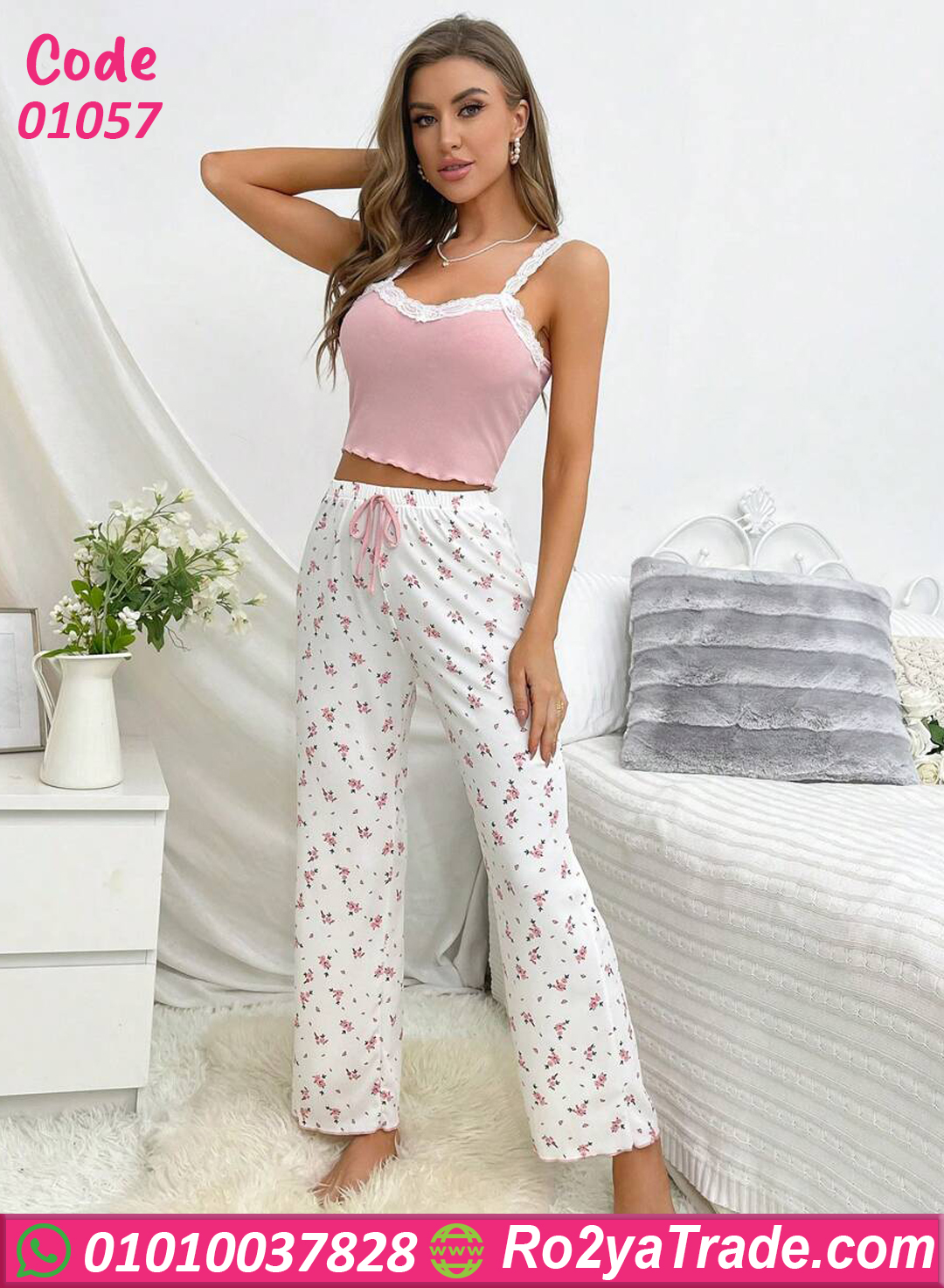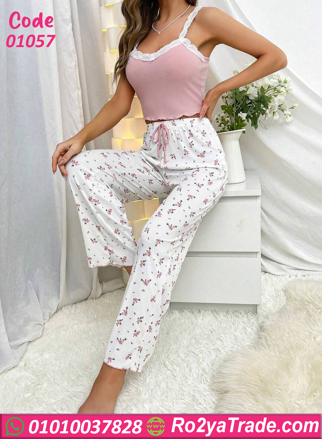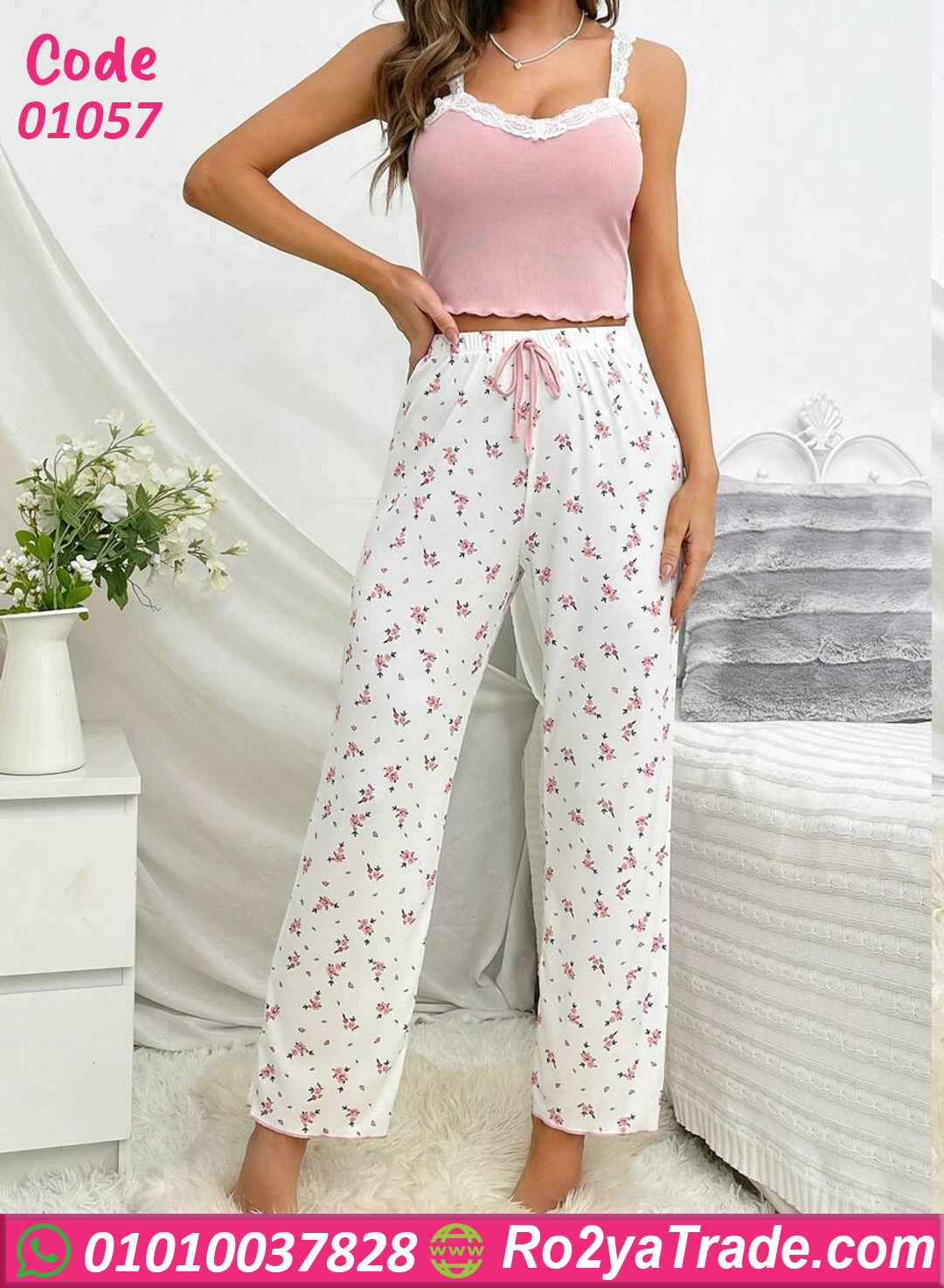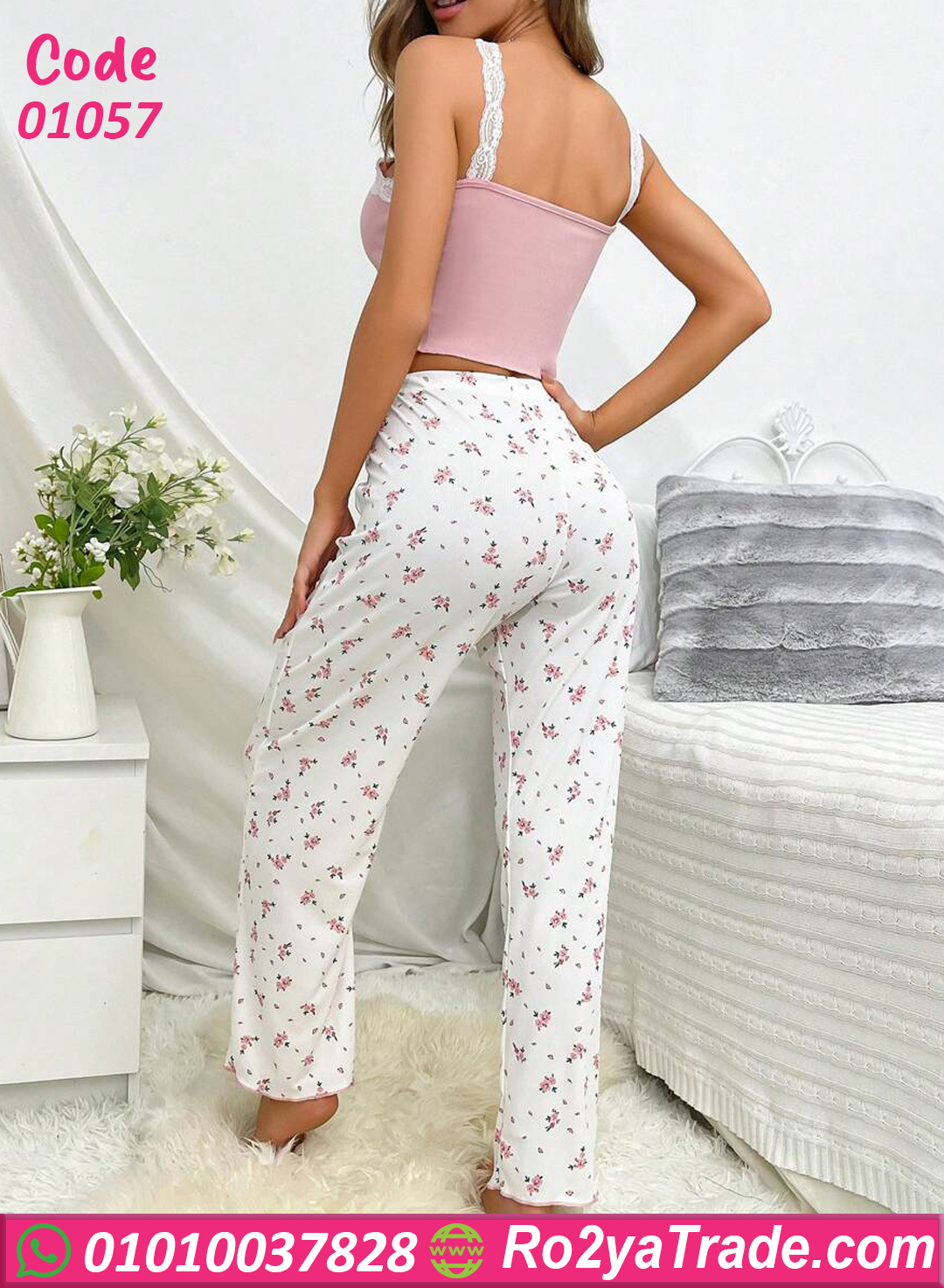 التيشرت كت بحمالات دانتيل على الرقبة بتدي شكل أنوثي لطيف وبستايل بناتي مبهج، والبنطلون طويل بقصة مستقيمة وطباعة ورد ناعمة مناسبة لكل الأذواق.