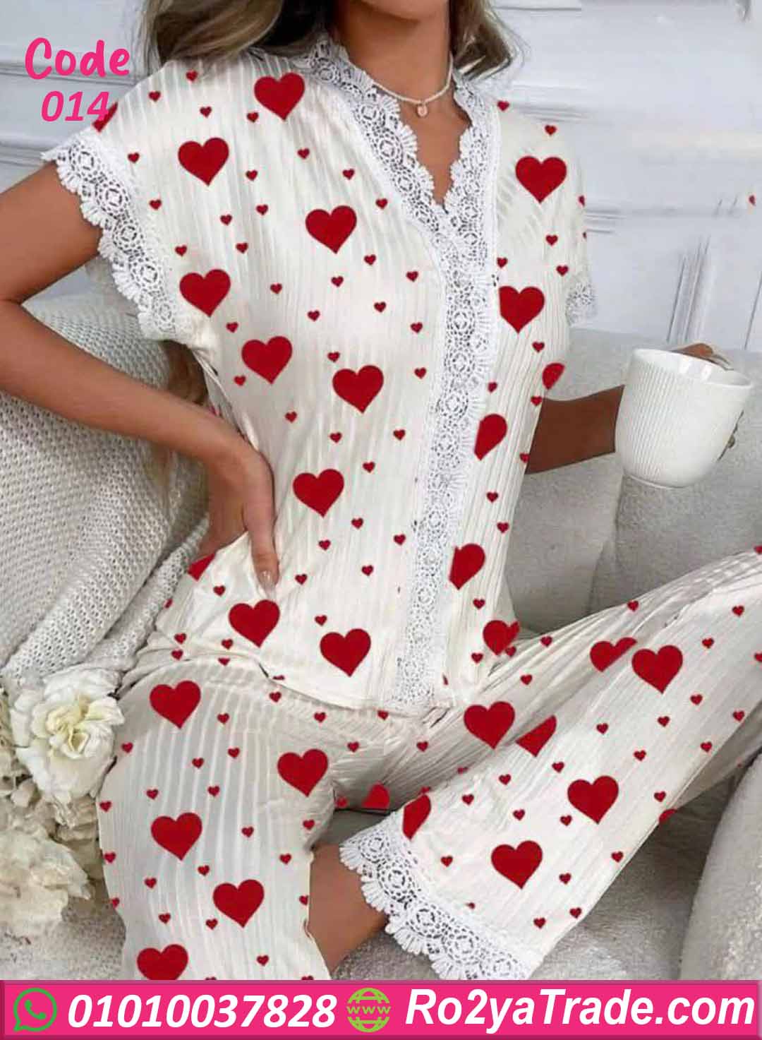 بيجامة صيفي حريمي قطن بطبعة قلوب ودانتيل ناعم – كود 014