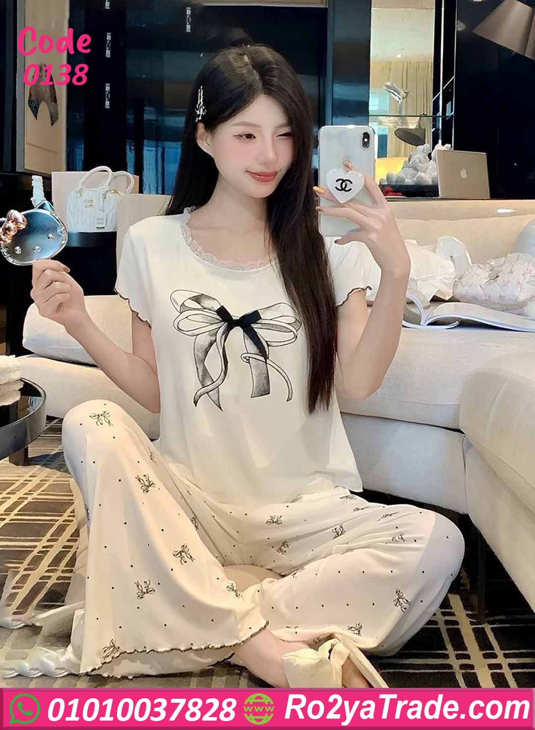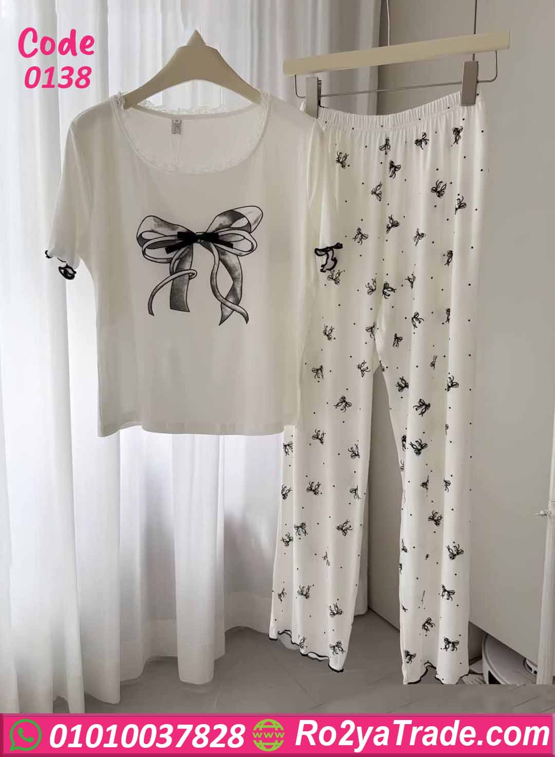 بيجامة حريمي صيفي بتصميم مريح وأنيق مكونة من تيشيرت بنقشة فيونكة جذابة مع بنطلون واسع يمنحك إطلالة أنثوية لطيفة داخل المنزل.