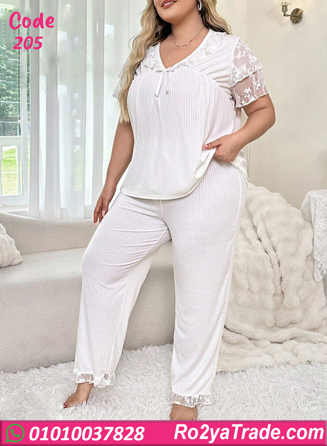 خامة مضلعة ناعمة على الجسم وخفيفة في اللبس، بتدي إحساس بالراحة طول اليوم. تصميم أنيق بلمسة دانتيل رقيقة على الصدر والأكمام يضيف شكل ناعم وشيك، مناسب للبيت والراحة اليومية.