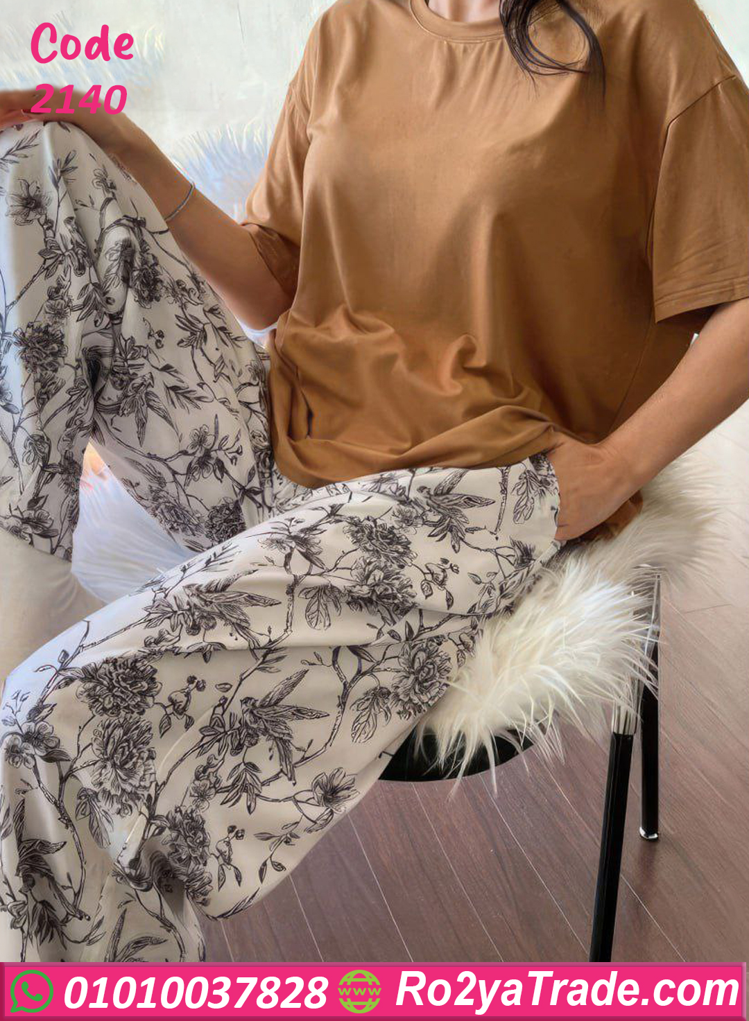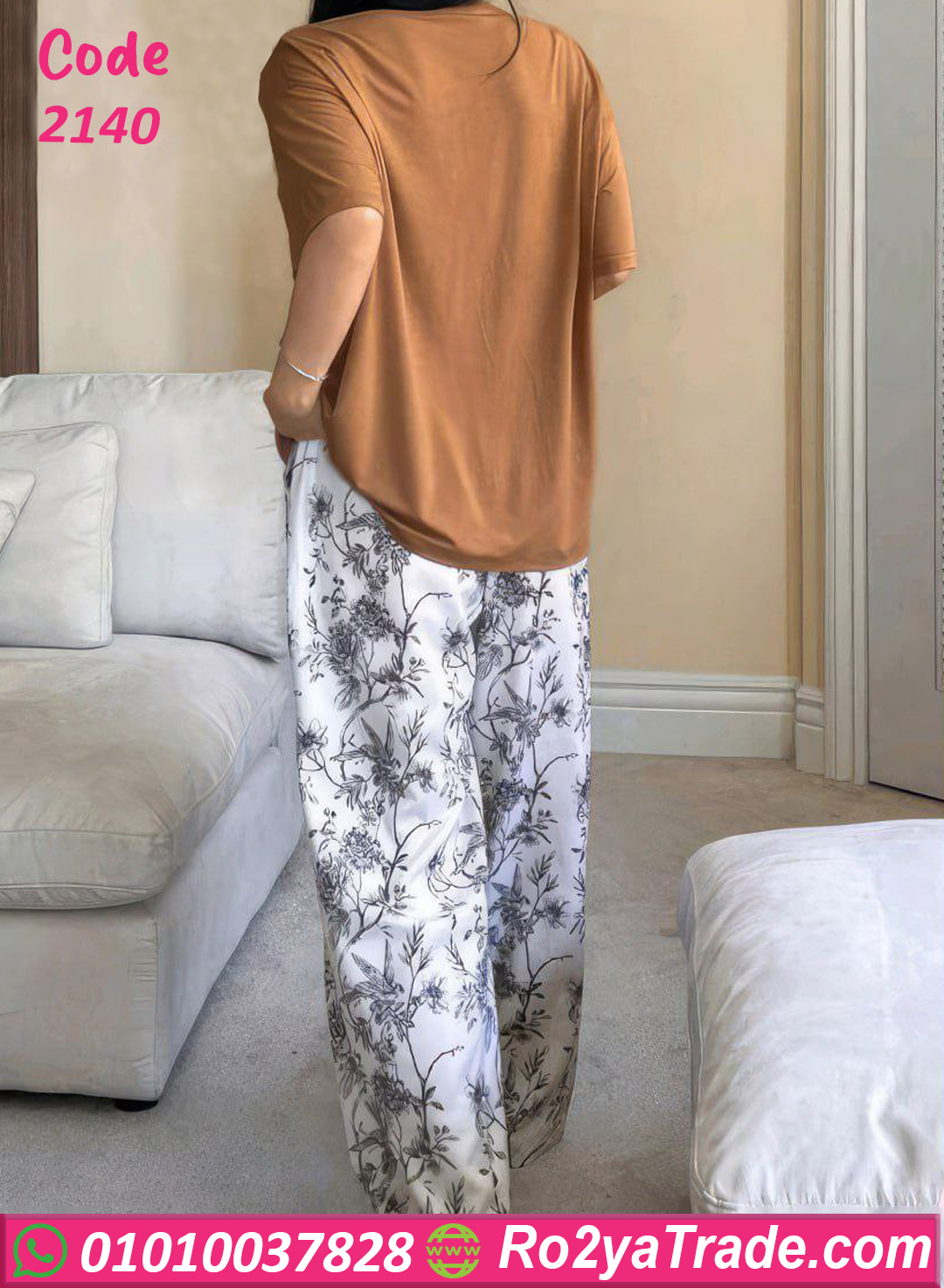 البيجامة دي من القطع اللي بتديك إحساس بالراحة والأناقة في كل وقت 💛 التيشيرت لونه بني كلاسيك راقي، والخامة ناعمة على الجسم بتخليكِ مرتاحة طول اليوم. البنطلون أبيض بنقشة ورد أسود رقيقة تضيف لمسة أنوثة ناعمة، تصميم واسع ومريح مناسب للصيف والجو الحر. تقدري تلبسيها في البيت أو في المصيف، خامتها ناعمة جدًا وسهلة الغسيل ومش بتكرمش. اختيار عملي وأنيق يخليكي شيك حتى في أوقات الراحة 🌸