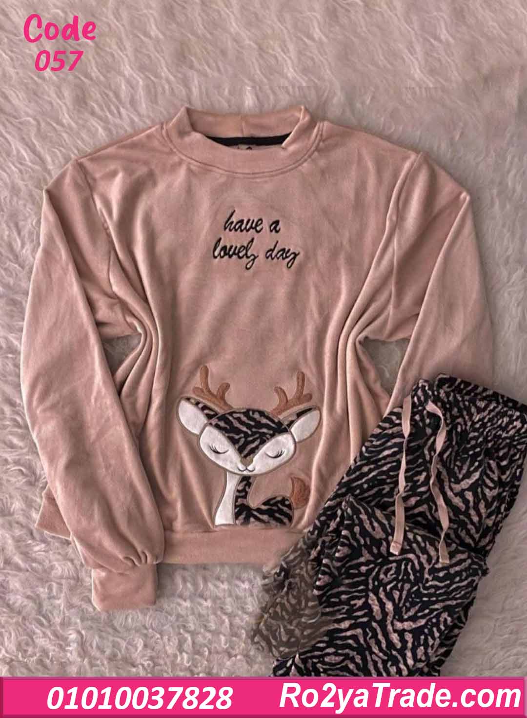 بيجامة غزالة شتوي كود 057 تصميم ناعم وأنثوي مناسب لأجواء الشتاء الدافية في البيت. الطقم مكون من قطعتين: سويت شيرت بلون بيج هادي عليه تطريز “have a lovely day” مع رسمة غزالة كيوت في الجزء الأمامي، وبنطلون بنقشة عصرية متناسقة مع ألوان البلوزة، وده بيدي شكل متكامل وشيك.