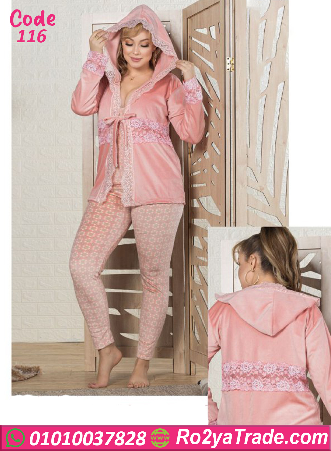 بيجامة شتوي ناعمة جدًا من خامة فرو دافئة وجودة ممتازة، بتصميم أنثوي ناعم فيه روب بغطاء للرأس وكشكشة من الدانتيل تضيف لمسة رُقيّ وشياكة. البنطلون مطبوع برسومات بسيطة وجذابة، والخامة مرنة ومريحة في اللبس ومناسبة لكل حركة في البيت. الموديل مثالي للشتا سواء للبيت أو كهداية شيك ومميزة. متوفرة بألوان هادية وجذابة ، ومناسبة لكل الأذواق.