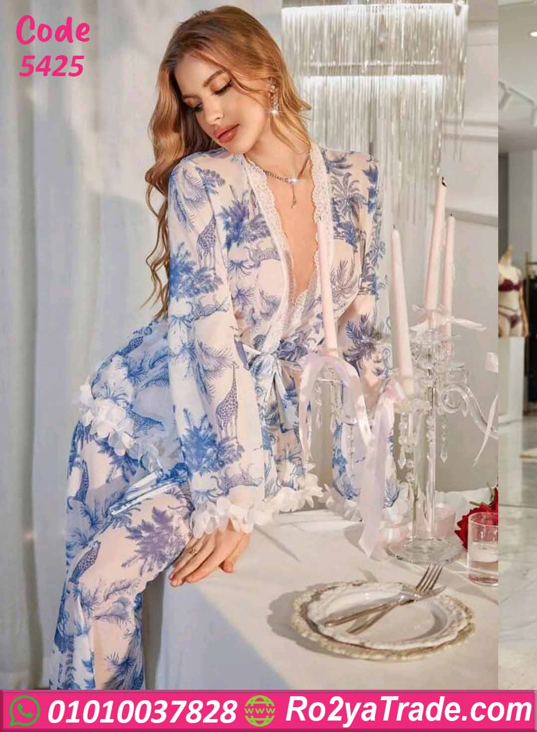 التصميم مكون من روب خفيف برباط على الوسط مزين بتفاصيل دانتيل عند الأكمام والحافة، مع بنطلون واسع بطبعة ورود زرقاء على أرضية فاتحة بيدي إحساس بالهدوء والرقي.