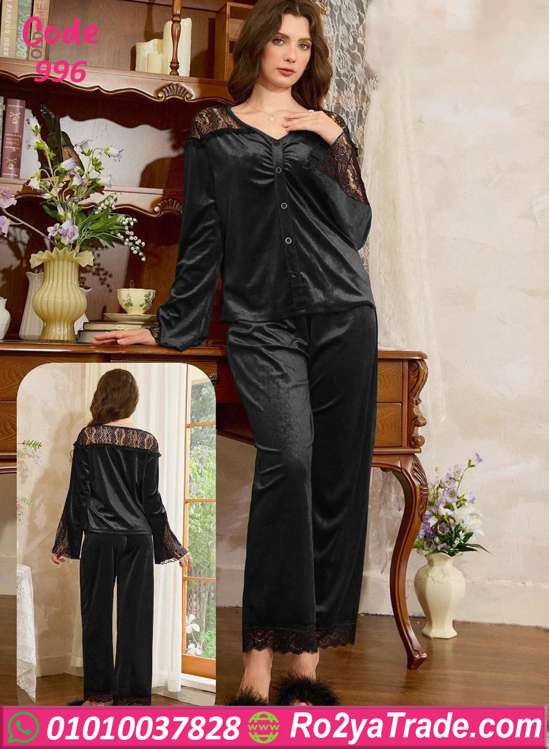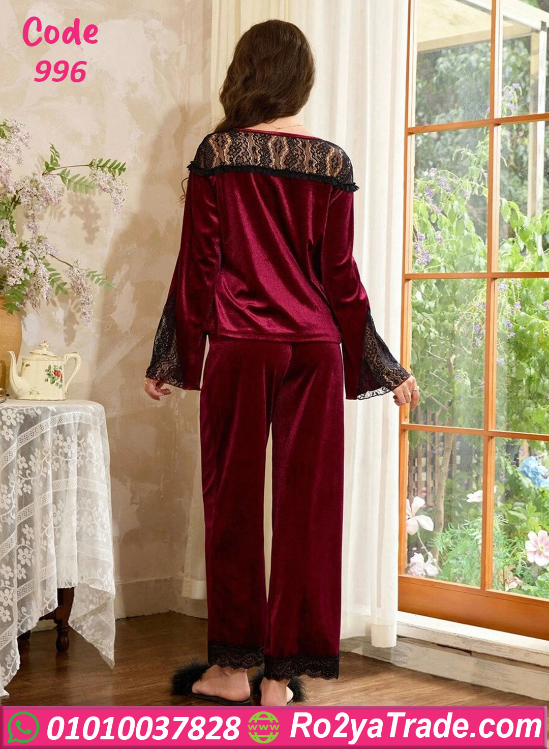 بيجامة شتوي فخمة بخامة قطيفة ناعمة جدًا بتدي دفء وأناقة في نفس الوقت، بتصميم مميز بلمسات دانتيل رقيقة على الأكتاف وحواف الكم والبنطلون،