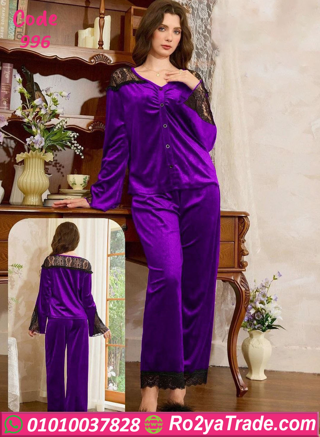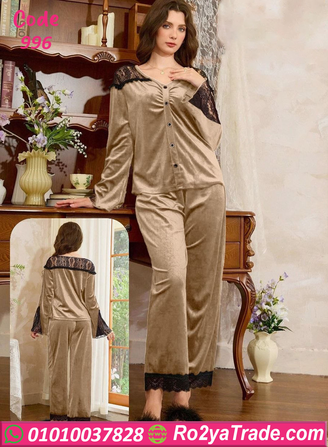 بيجامة شتوي تحفة من القطيفة الناعمة جدا بتصميم أنيق بلمسة دانتيل على الأكتاف والأكمام، خامة مريحة وسهلة اللبس طول اليوم.