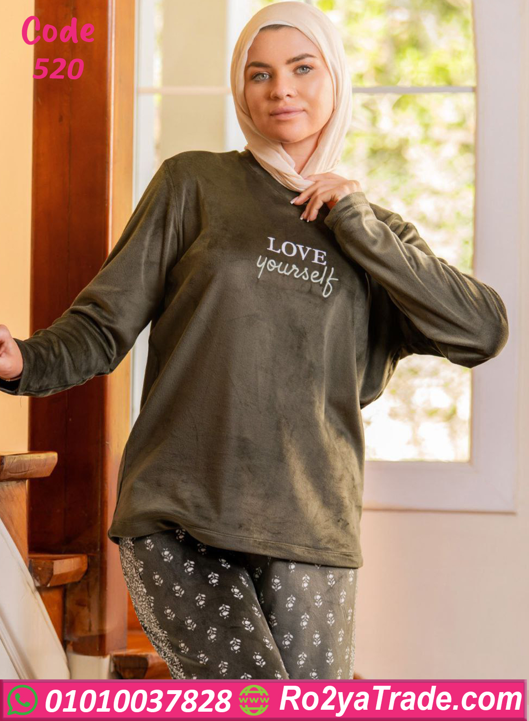 البلوزة لون زيتي هادي وعليها عبارة Love Yourself بتدي طابع رومانسي وشيك 💕 البنطلون منقوش نقشات بسيطة وجذابة وبيبقى مريح جدًا في اللبس والقعدة في البيت 💯 مناسبة للنوم، الاستقبال، أو استرخاء آخر اليوم 🔥 الخامة مش بتكلكع وسهلة الغسيل 👏 كود المنتج: 520