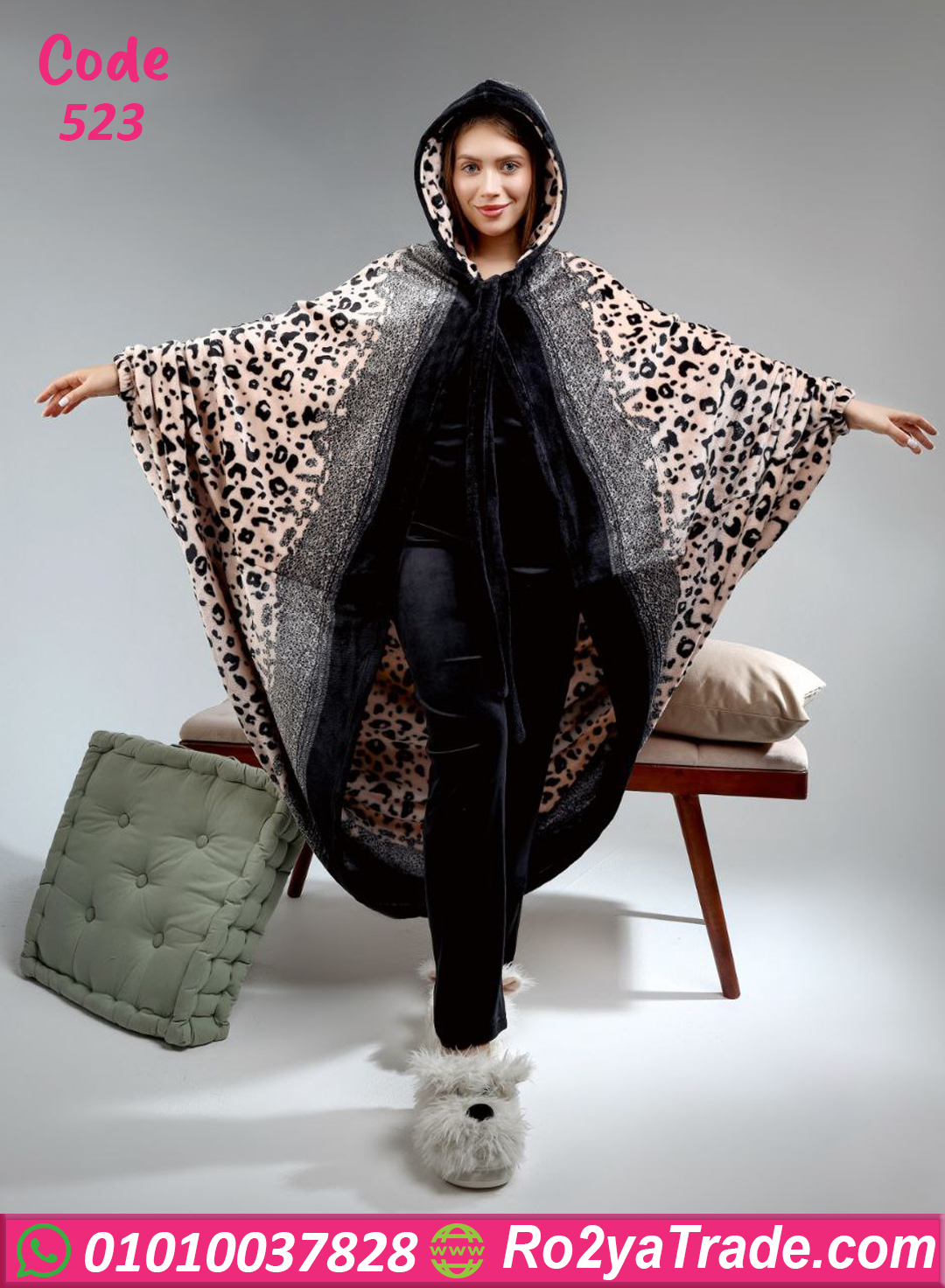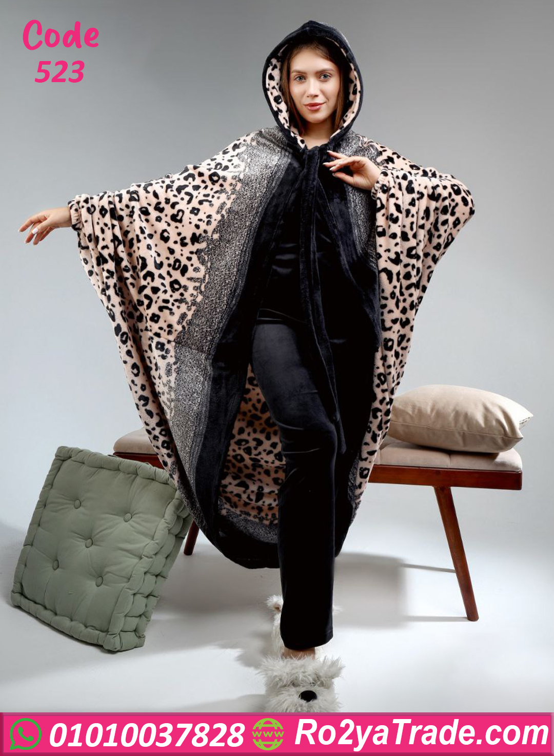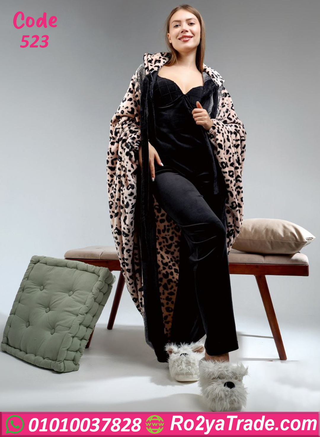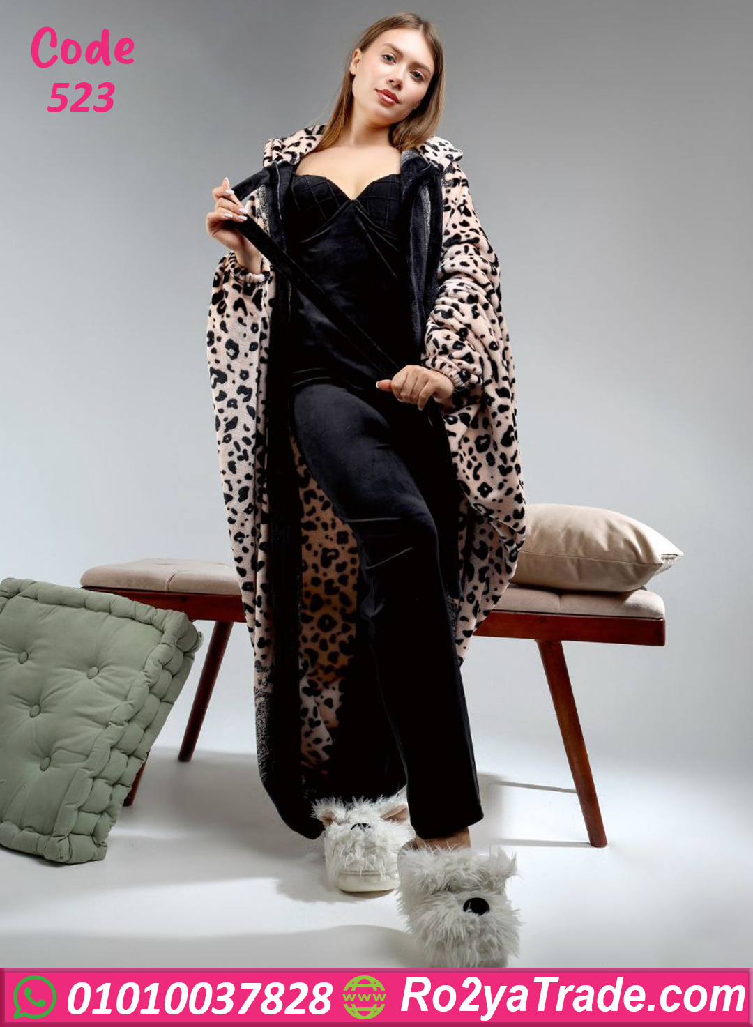 التصميم مكوّن من طقم داخلي باللون الأسود مع جاكيت طويل بنقشة ليوبارد أنيقة تضيف لمسة أنوثة وجاذبية فريدة. الموديل عملي جدًا ومريح في اللبس،