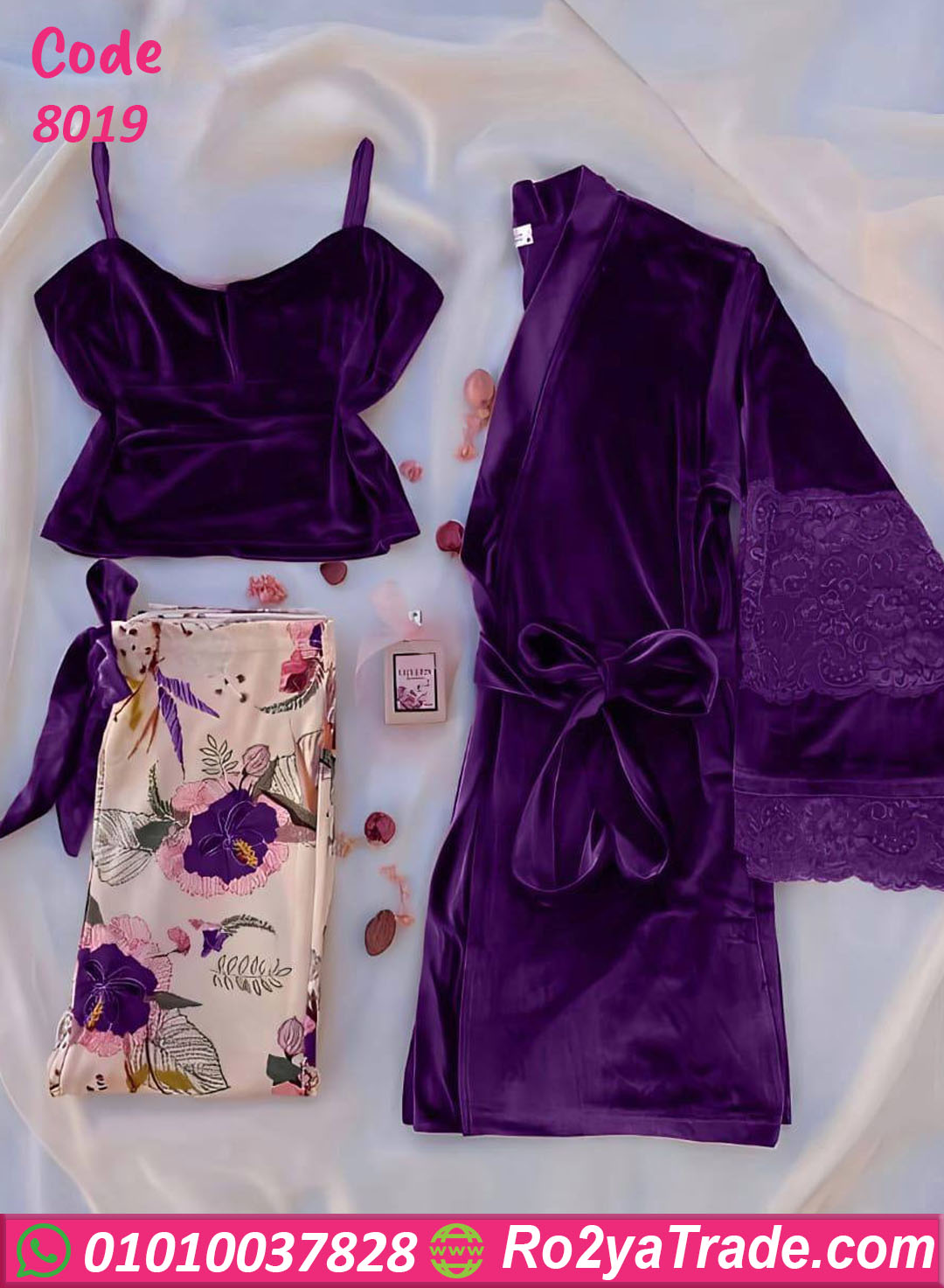 الخامة ناعمة ودافئة بتدي إحساس فخم على الجسم، والتصميم شيك جدًا فيه توب بكتف رفيع وروب بنفس الخامة، مع بنطلون مريح بيكمّل اللوك الأنيق.