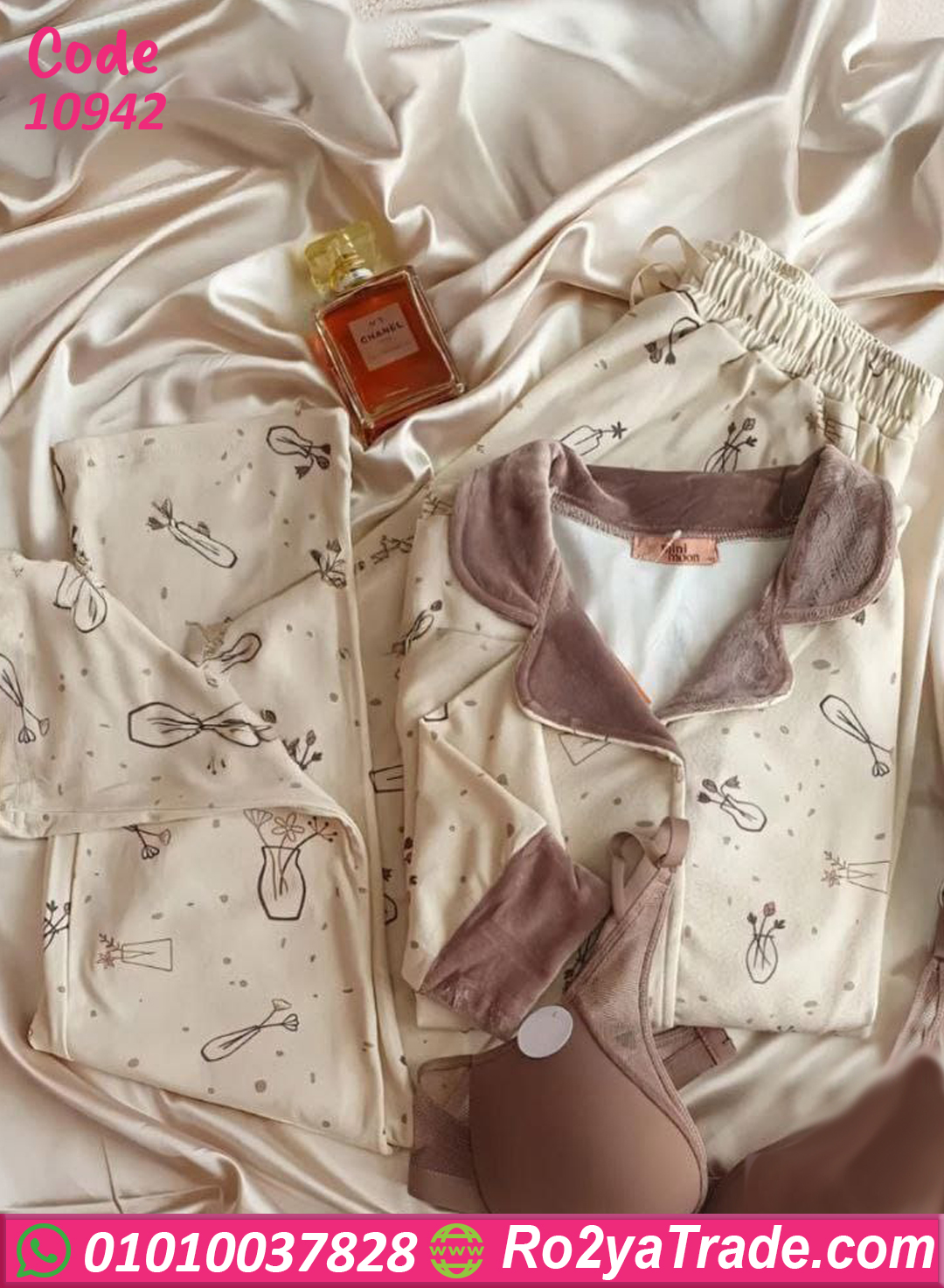 بيجامة قطيفة ناعمة بتصميم أنثوي جذاب، فيها بلوزة بكول كلاسيك وأكمام طويلة بلون متناسق مع البنطلون اللي عليه نقشة خفيفة بتدي إحساس بالرقة والدفا في نفس الوقت 🩷