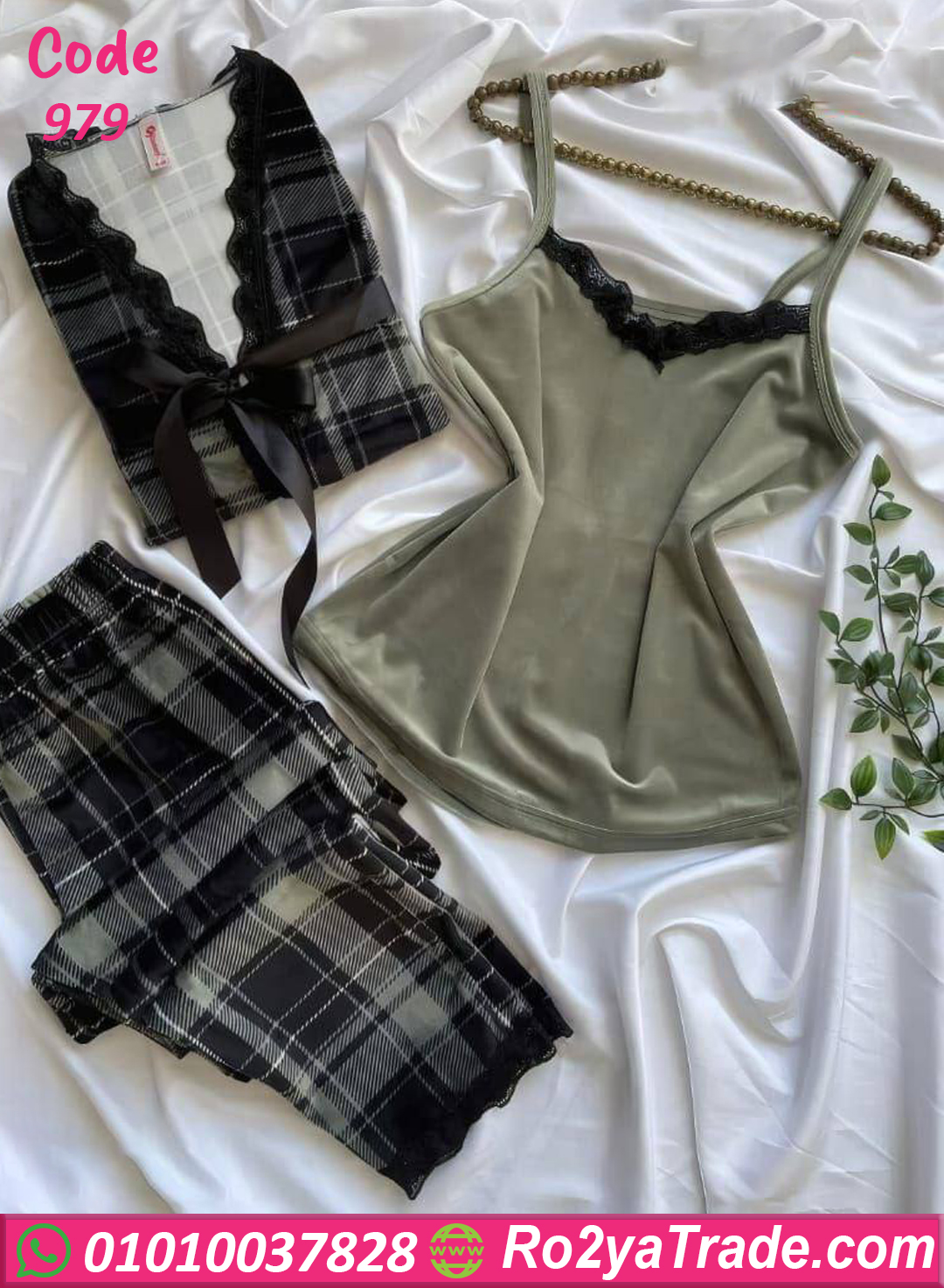 بيجامة قطيفة 3 قطع كارو أنيقة – كود 979