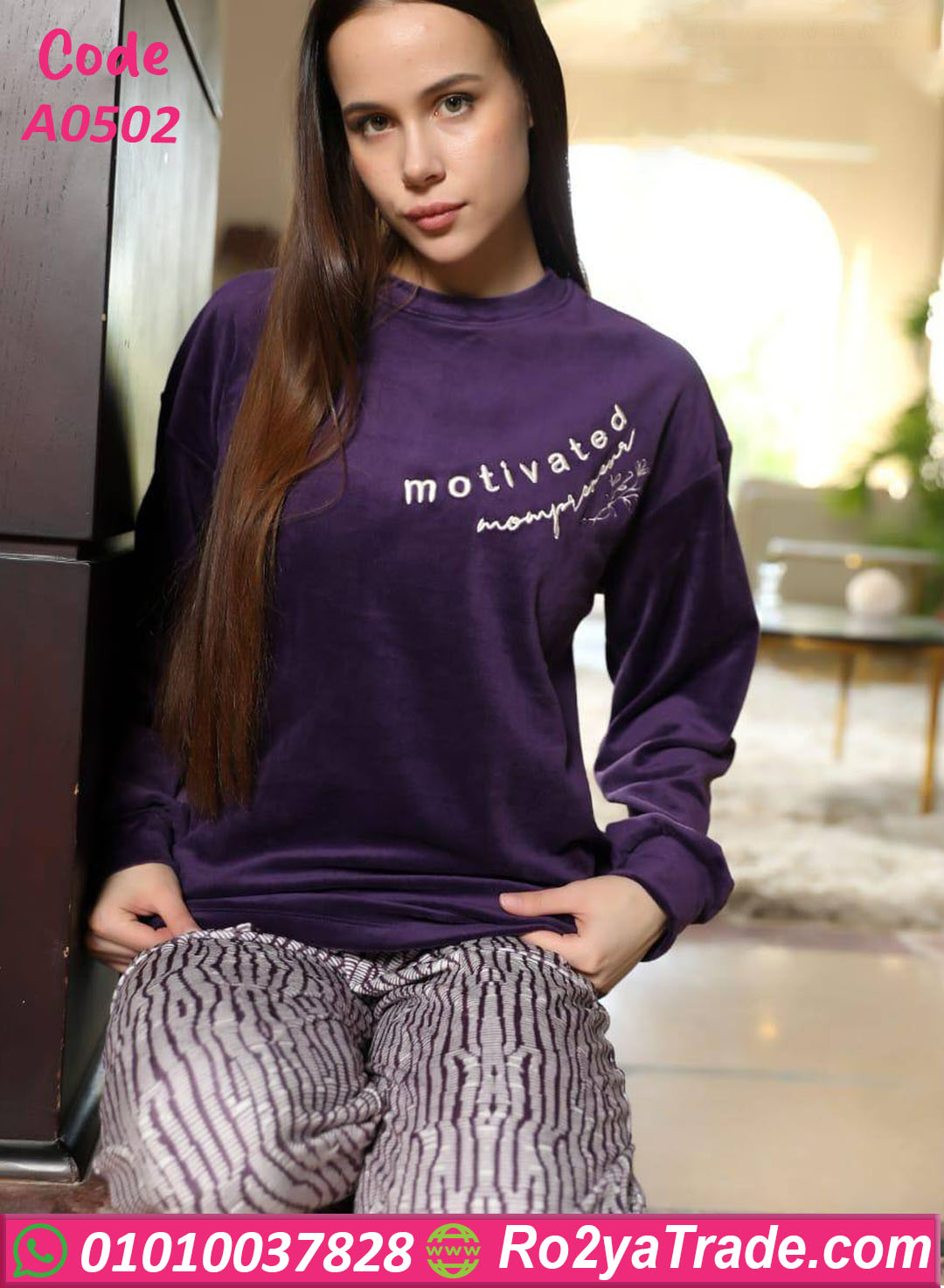 بيجامة قطيفة حريمي شتوي بخامة ناعمة ومريحة جدًا 💜، بتصميم بسيط وأنثوي مكتوب عليه “motivated”، متوفرة بألوان أنيقة.