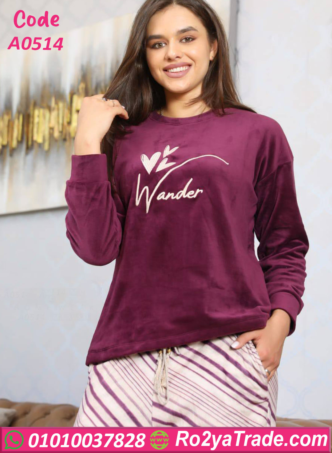 ابدئي شتاءك بأناقة ودفا مع بيجامة كود A0514 من Coco Home Wear 💫 البيجامة بخامة قطيفة ناعمة ومريحة جدًا على الجسم، البلوزة لون موف ملوكي أنيق مطبوع عليها كلمة “Wander” بخط أنثوي بسيط، والبنطلون بخطوط عريضة باللون البيچ × الموف الفاتح. ستايلها شيك ومودرن ومناسب للبنات اللي بتحب تكون أنيقة في البيت دايمًا. الخامة دافية جدًا ومطاطة، بتدي حرية حركة وراحة طول اليوم، ومثالية لأجواء الشتاء الباردة ☕❄️