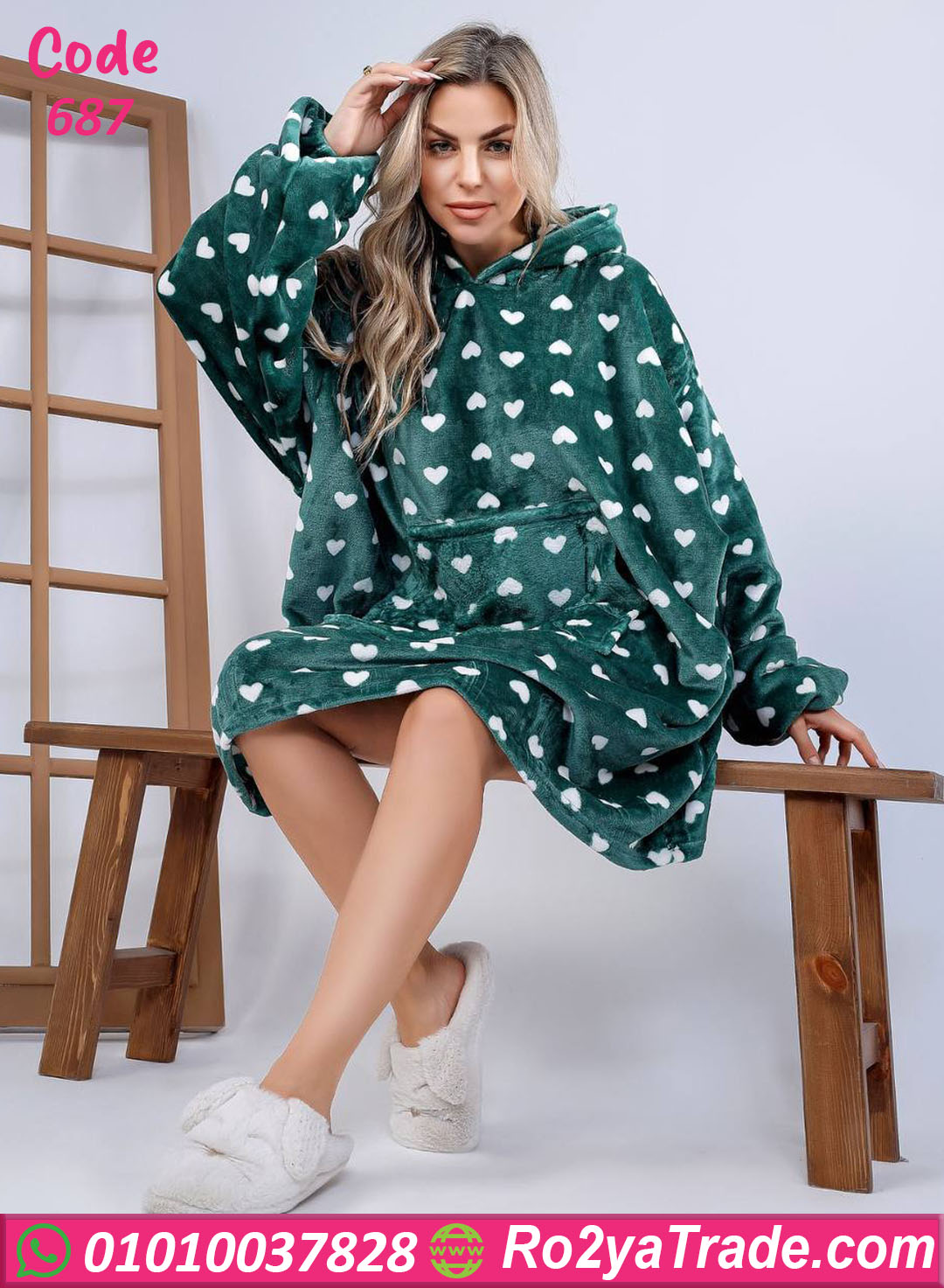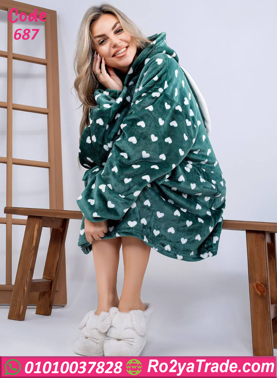 الخامة قطيفة فخمة ناعمة على الجسم، بلون زيتي مميز مع نقشة القلوب اللي بتدي إحساس بالأنوثة والدفا.