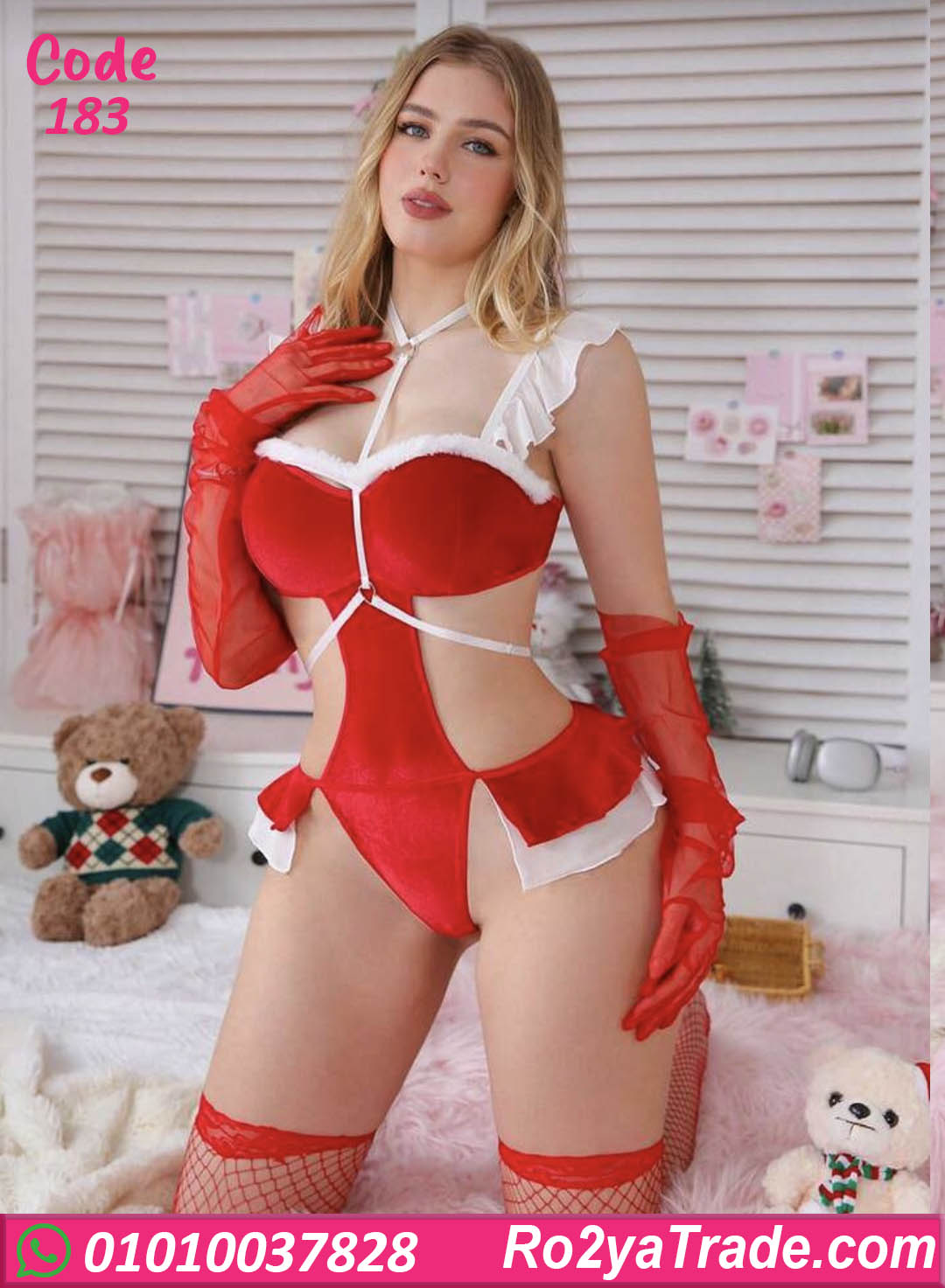 لانجري تنكري شيك وجريء مستوحى من شكل سانتا كلوز، تصميم أنيق يبرز الأنوثة ويضيف لمسة مثيرة ومميزة، مناسب للسهرات الخاصة والمناسبات المميزة.