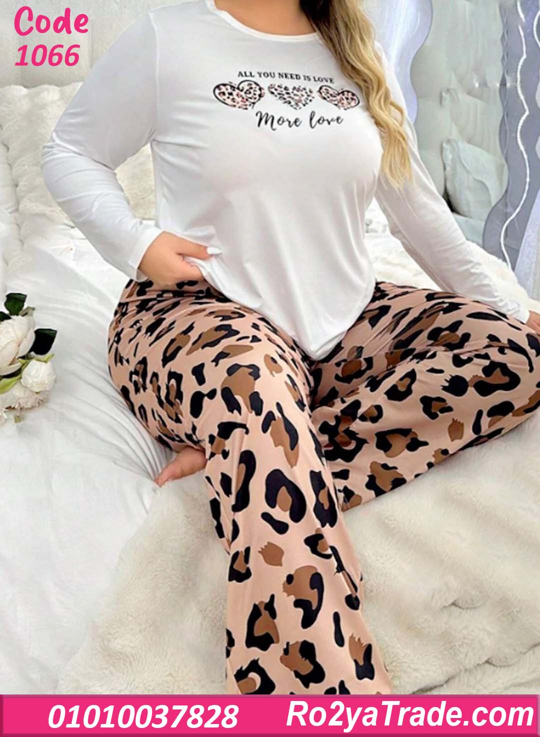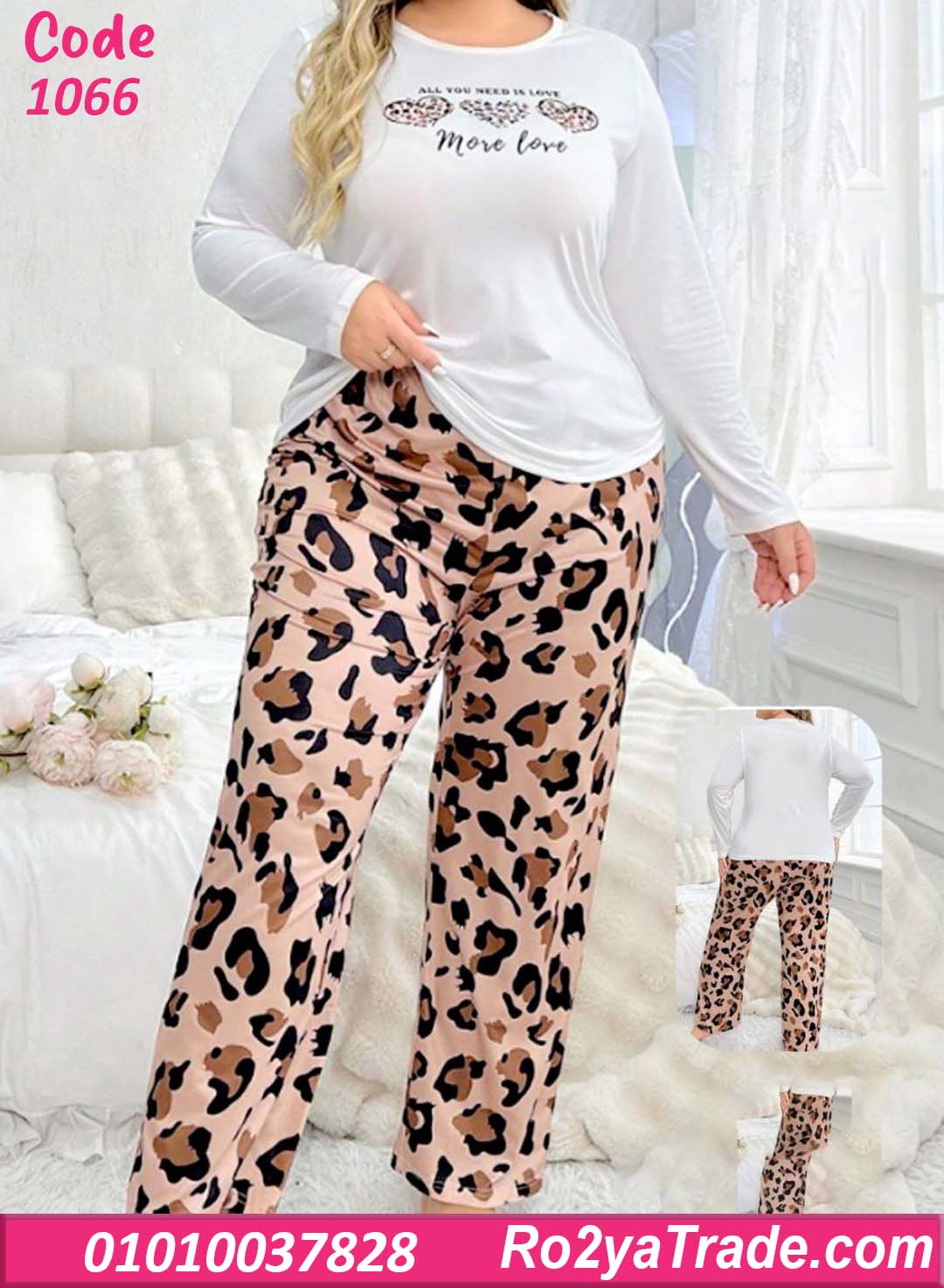بيجامة حريمي بيج سايز بتصميم عصري يجمع بين الراحة والأناقة مع بنطلون بنقشة ليوبارد مميزة.