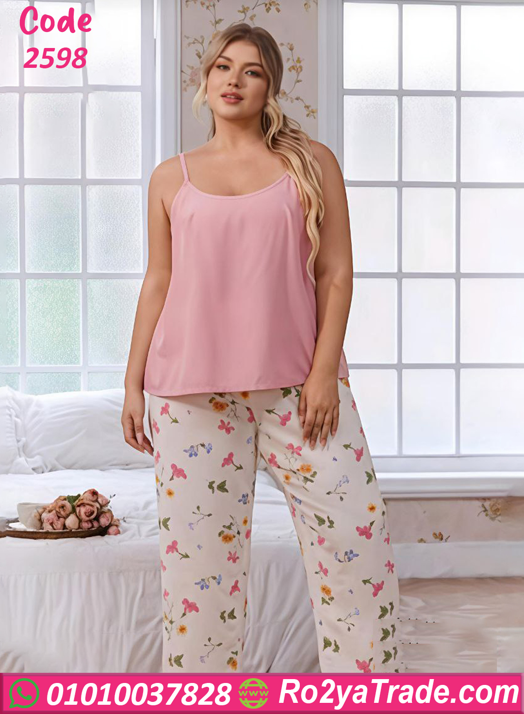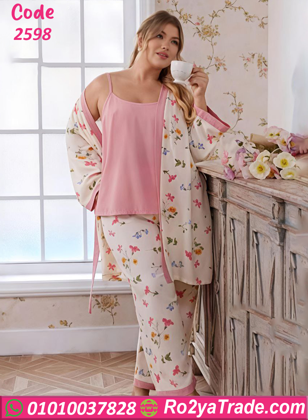بيجامة حريمي أنيقة مكونة من 3 قطع بتصميم ورد رقيق يمنحك إطلالة ناعمة ومريحة داخل المنزل مع لمسة أنثوية جذابة.
