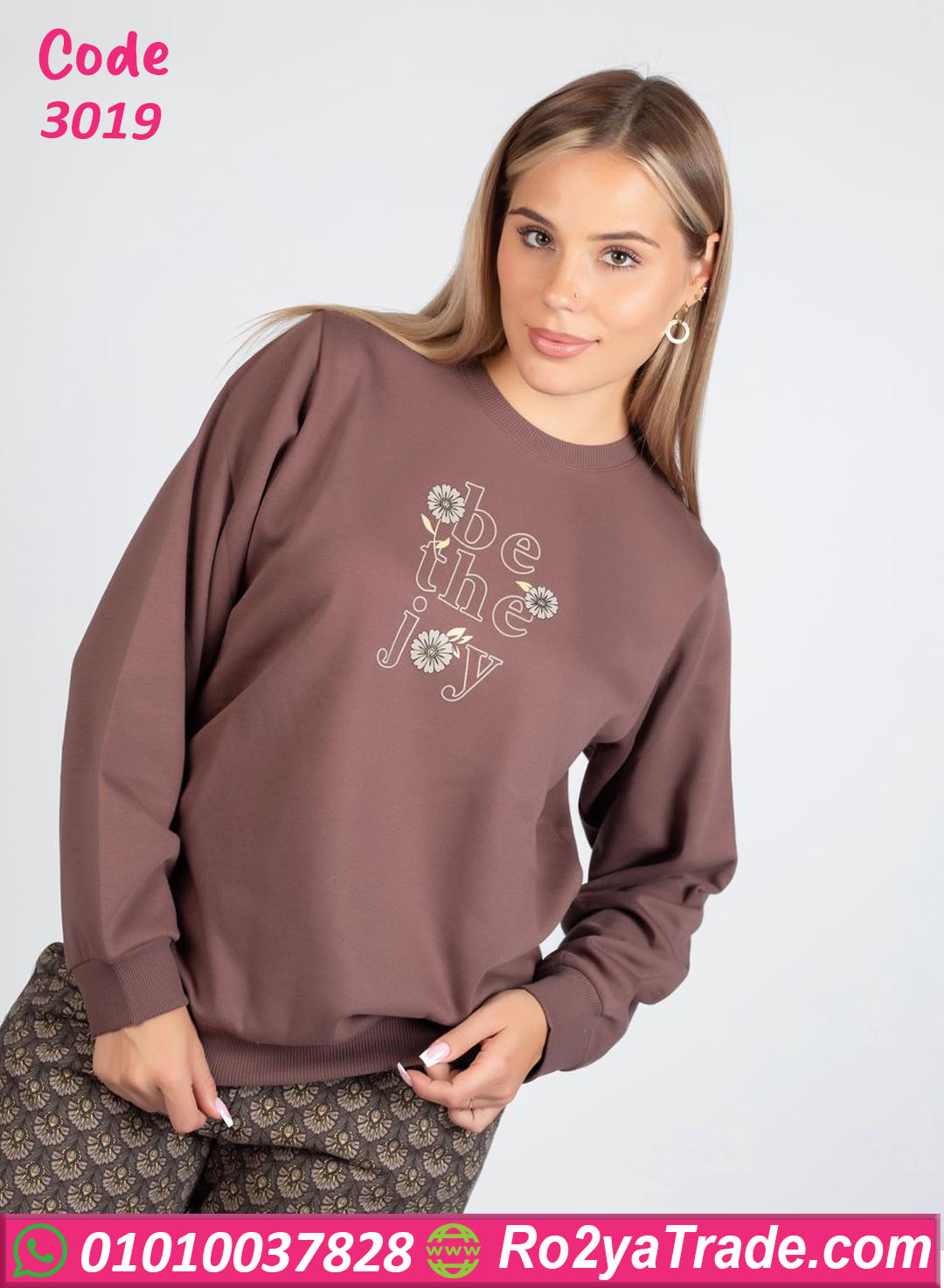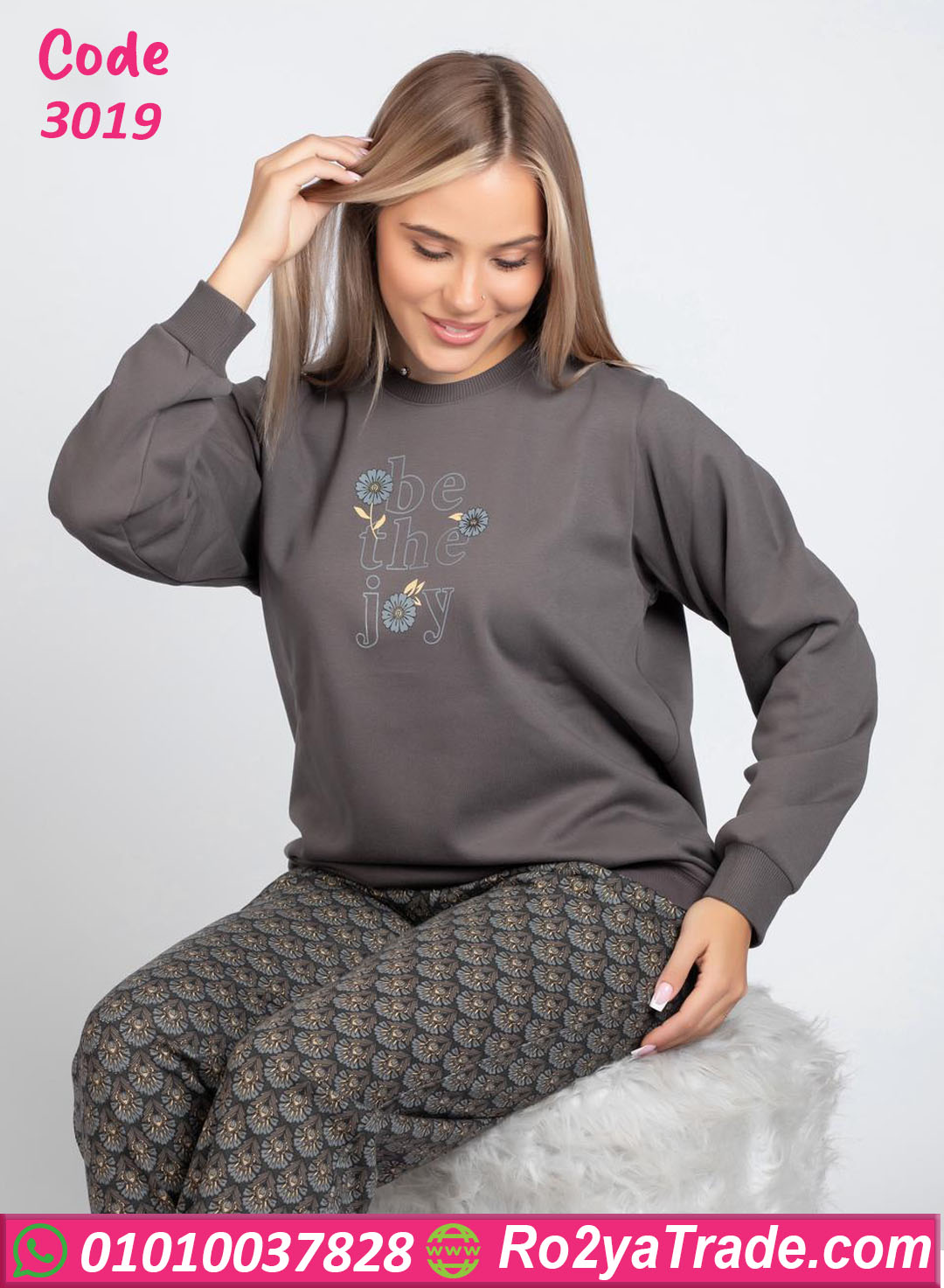 الخامة قطن دافئة على الجسم، البلوزة بلون موف غامق مطبوع عليها جملة “Be The Joy” بشكل ناعم مع ورود صغيرة تضيف لمسة رِقة. البنطلون منقوش بنقشة مزخرفة شيك جدًا ومتناسقة مع البلوزة.
