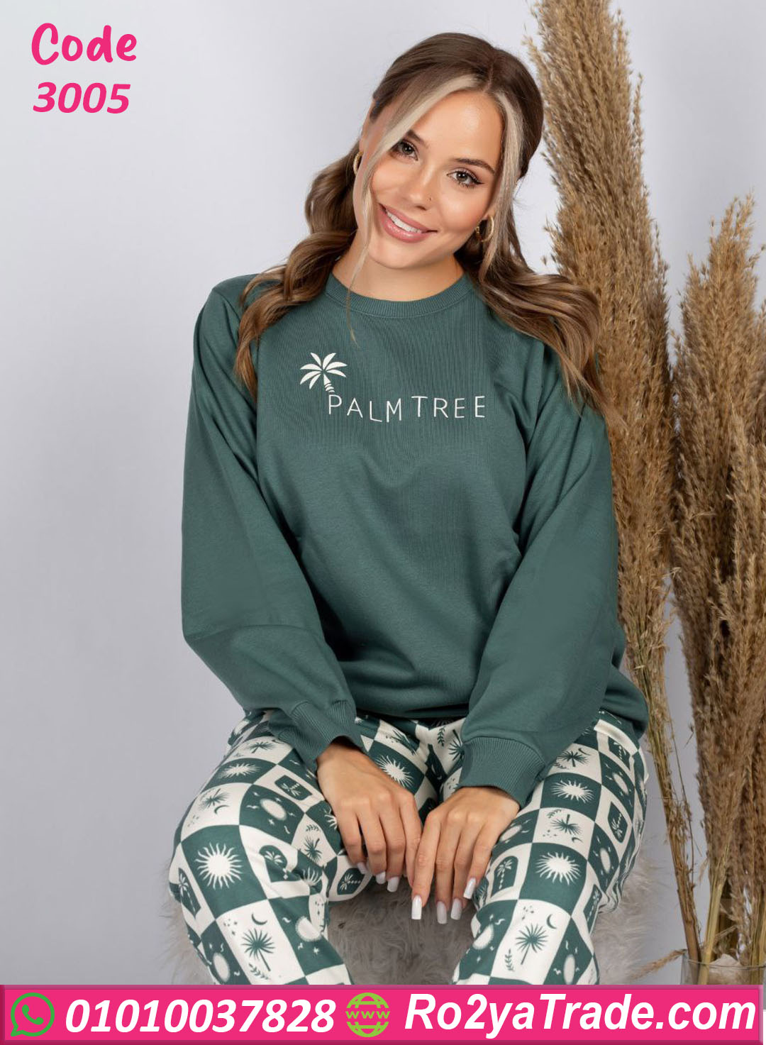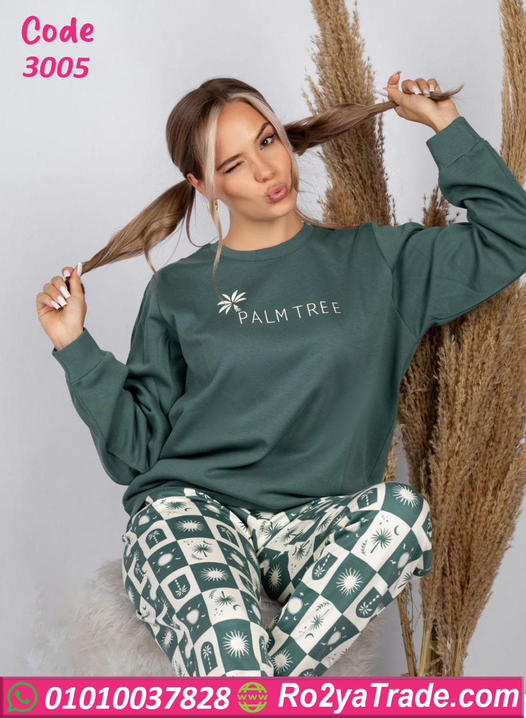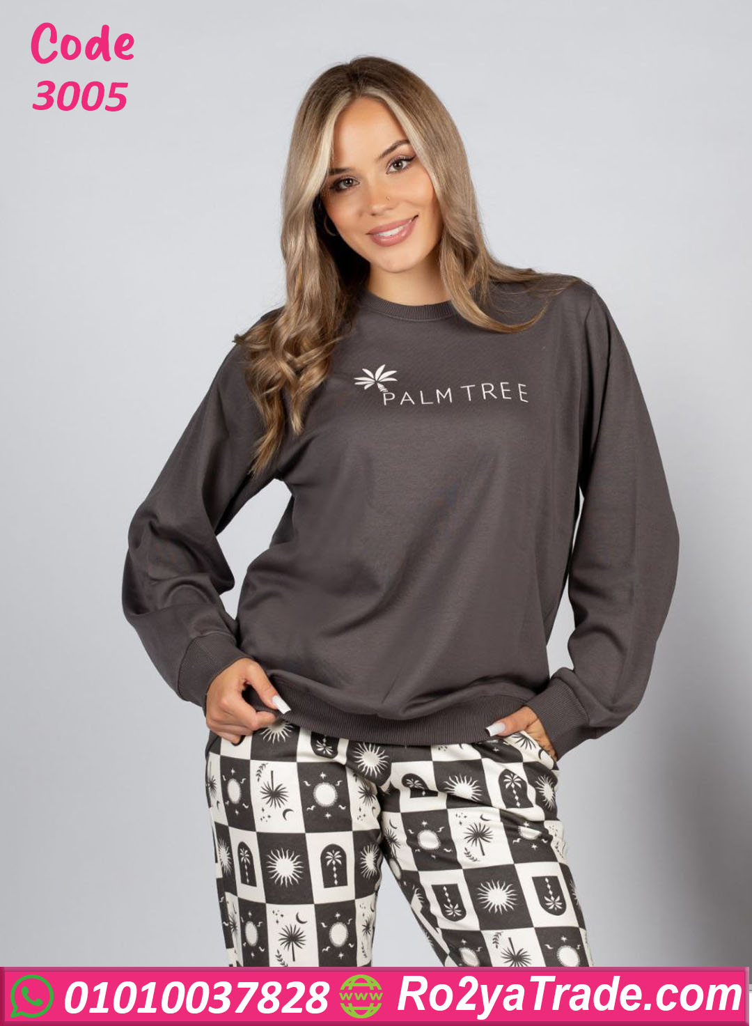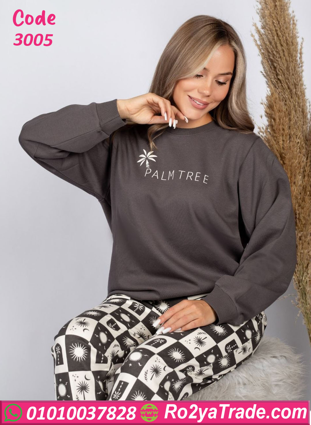 الترنج مكون من سويت شيرت سادة عليه كتابة PALM TREE وبنطلون عليه نقشة مربعات أنيقة بتدي شكل عصري جذاب 👌
