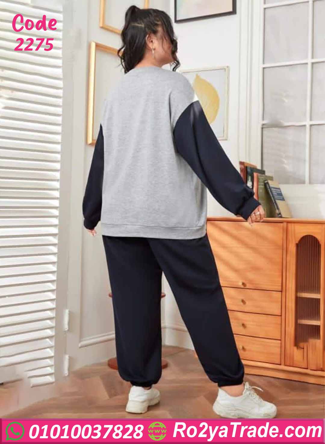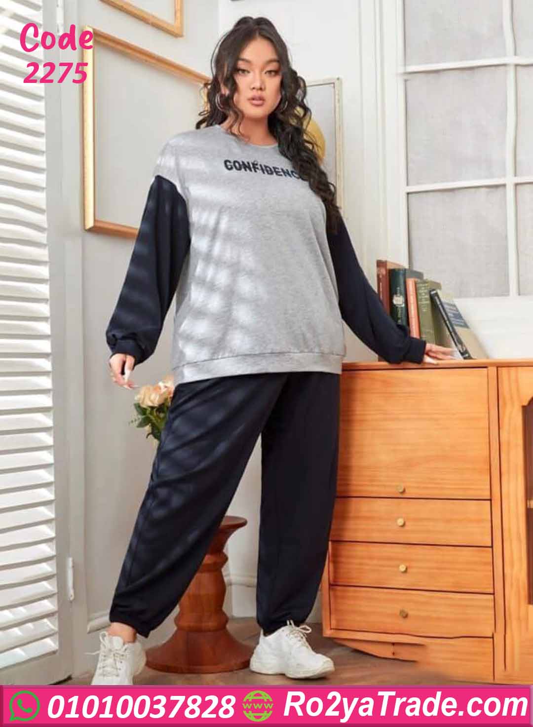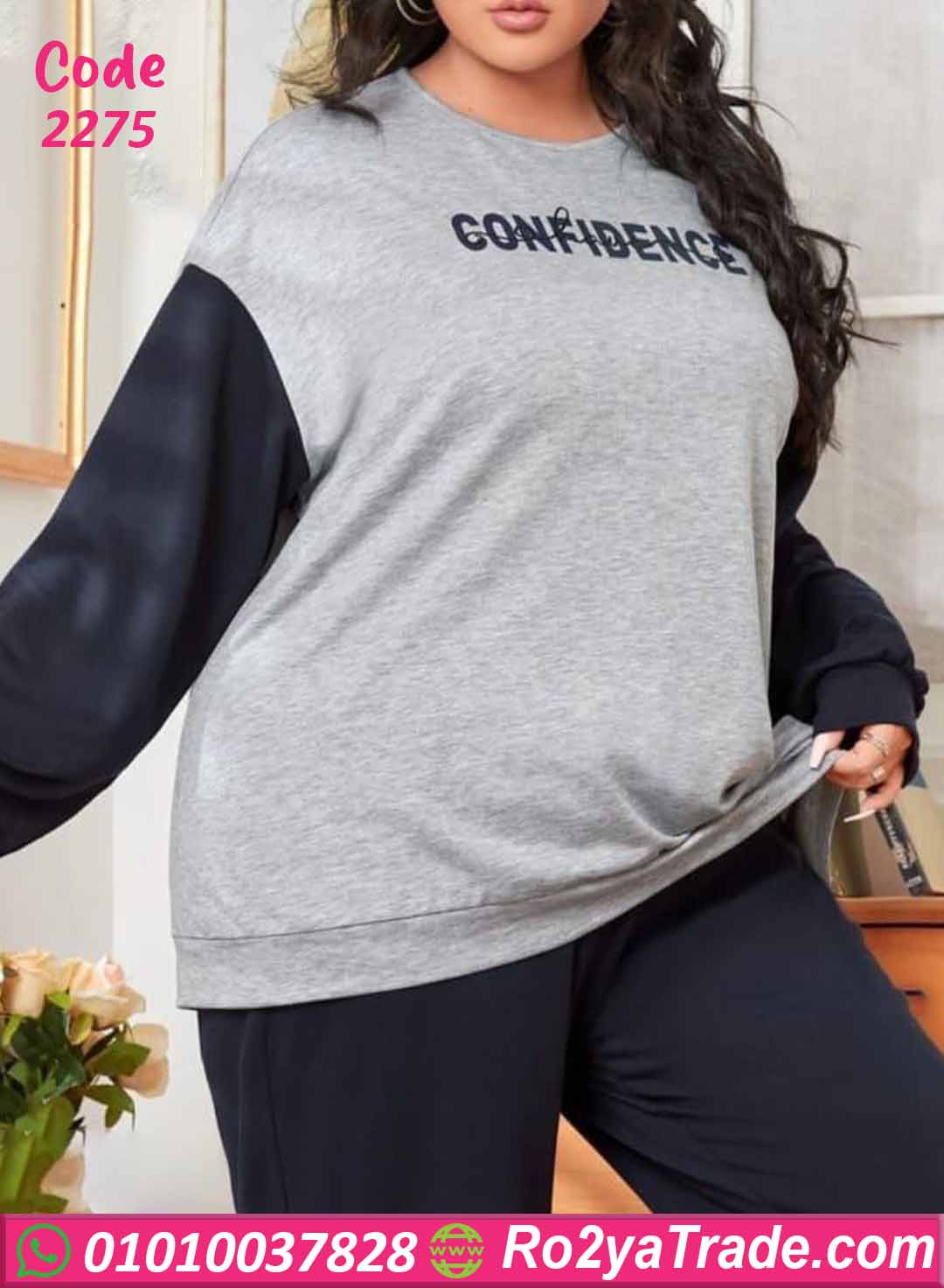 للمقاسات الكبيرة. يتكون من سويت شيرت رمادي بكم كحلي مطبوع عليه كلمة Confidence، مع بنطال كحلي