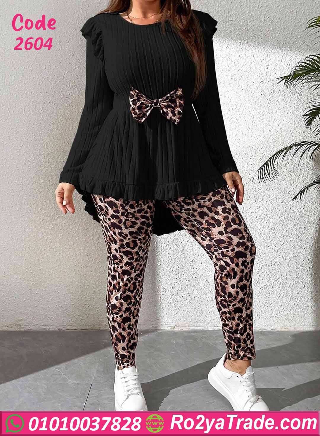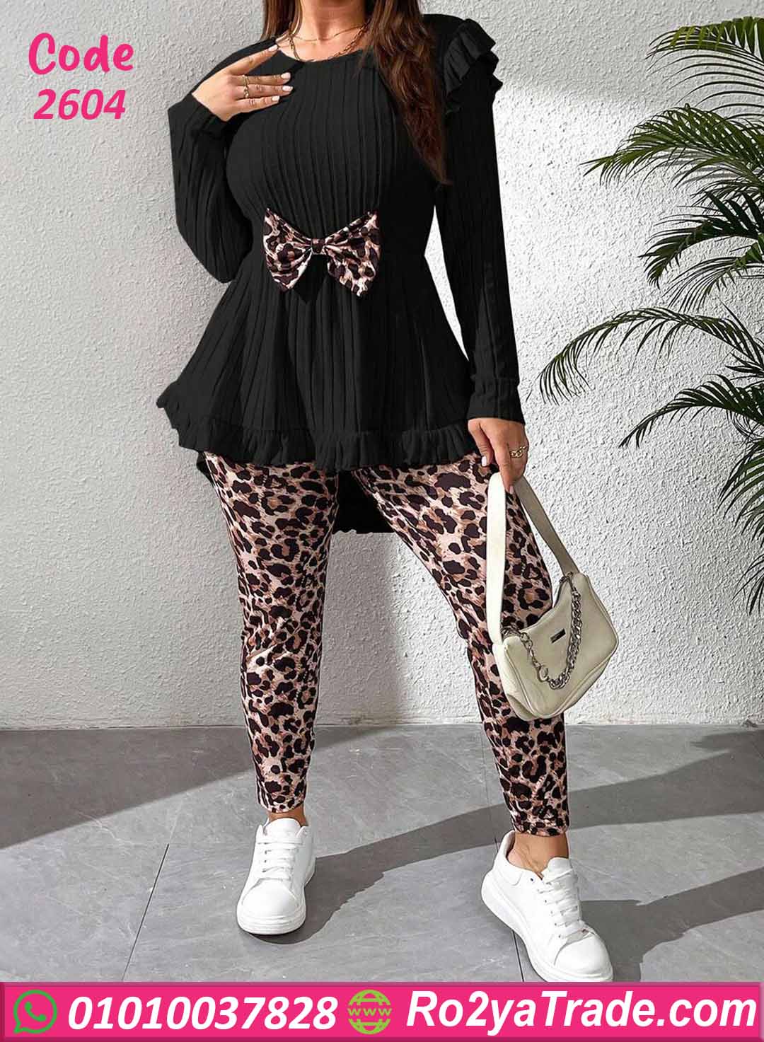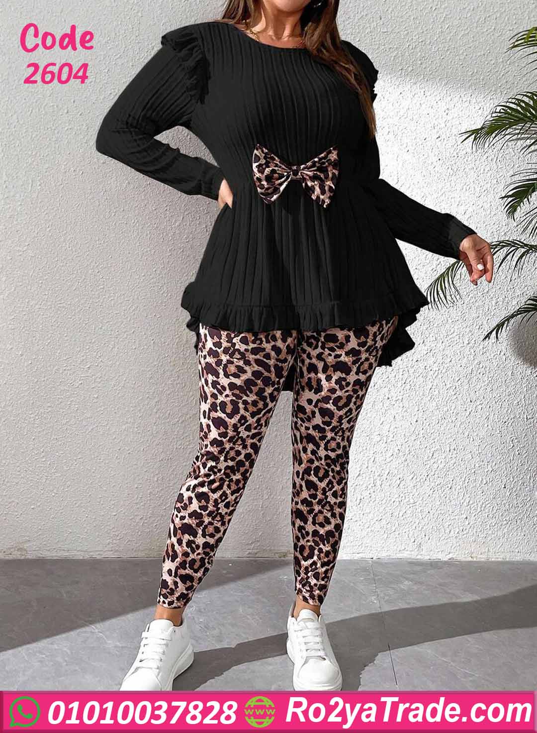 ترنج نسائي شتوي – كود 2604 من ماركة Lara مصنوع من خامة شتوية ناعمة ومريحة على البشرة. يتميز ببلوزة سوداء مضلعة بقصة واسعة مع كشكشة ناعمة عند الحافة ولمسة فيونكة ليوبارد جذابة في المنتصف، مع بنطال ليوبارد مطبوع يمنح الطقم طابع أنيق وجريء في نفس الوقت.