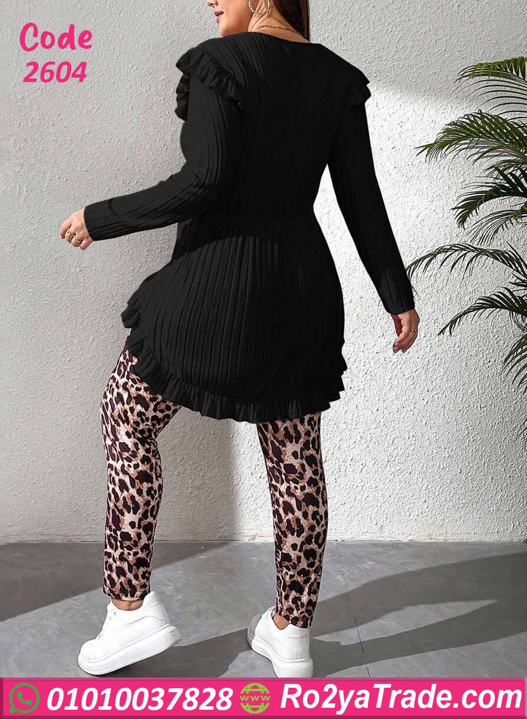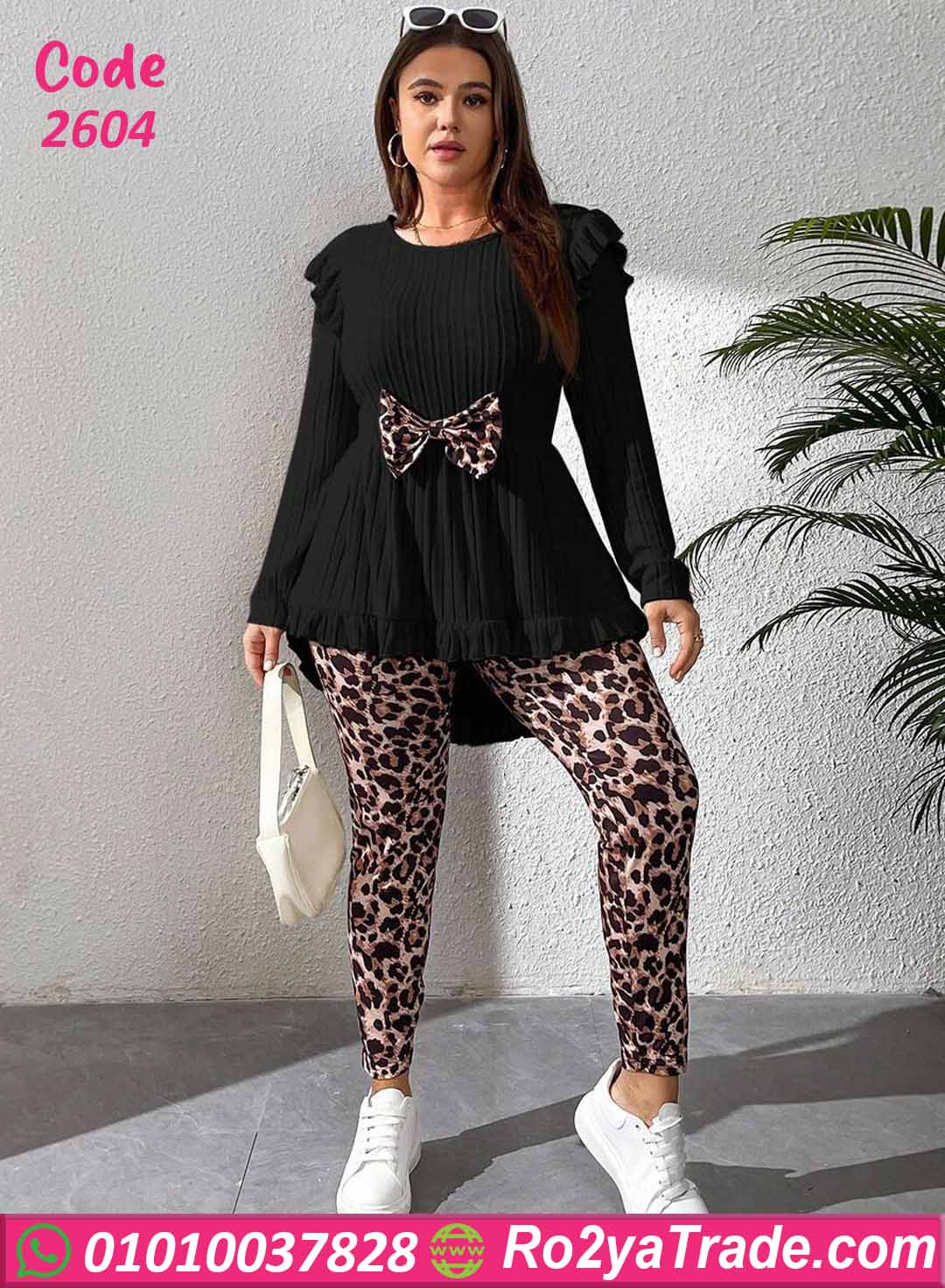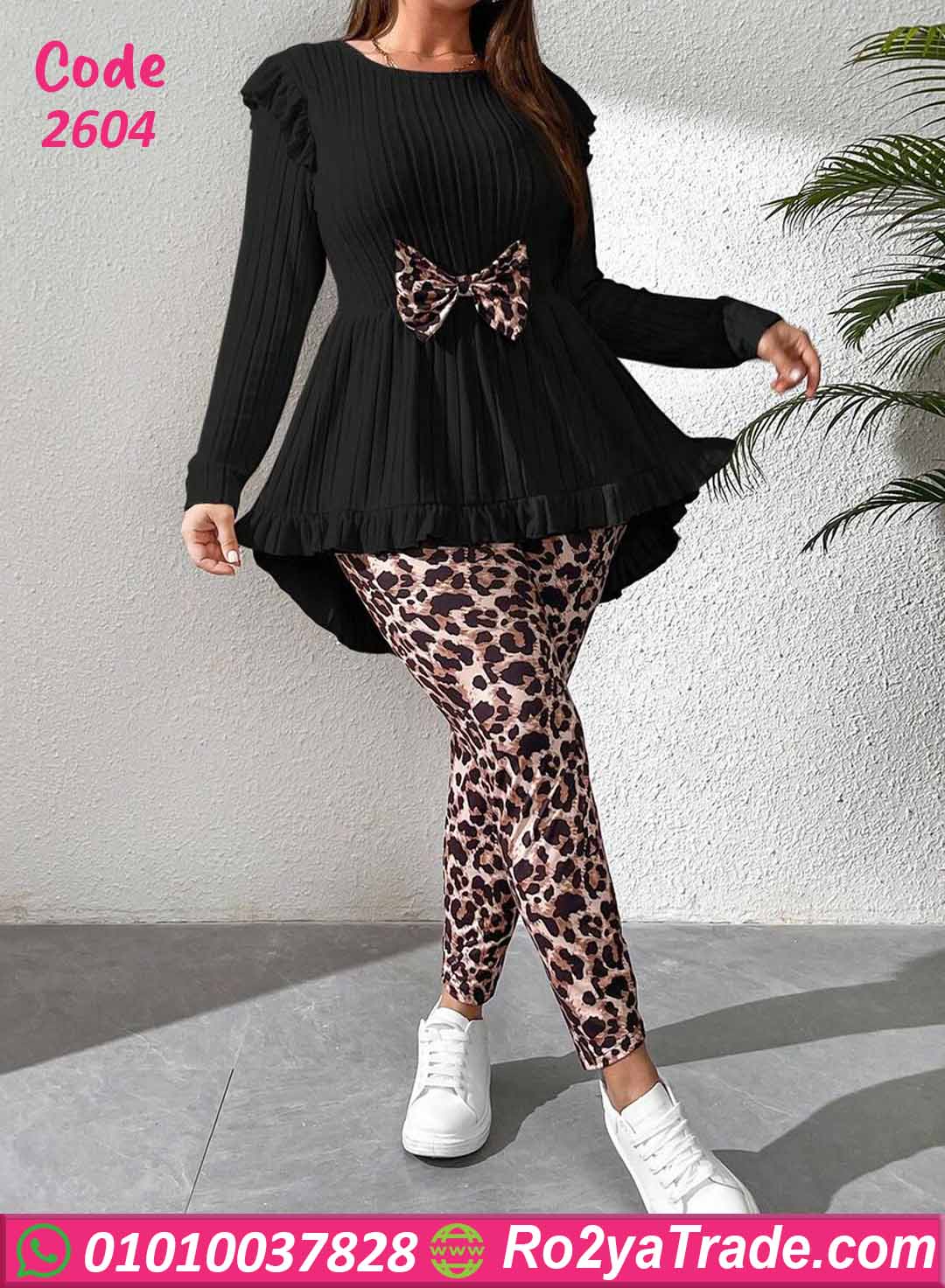 ترنج نسائي شتوي – كود 2604 من ماركة Lara مصنوع من خامة شتوية ناعمة ومريحة على البشرة. يتميز ببلوزة سوداء مضلعة بقصة واسعة مع كشكشة ناعمة عند الحافة ولمسة فيونكة ليوبارد جذابة في المنتصف، مع بنطال ليوبارد مطبوع يمنح الطقم طابع أنيق وجريء في نفس الوقت.