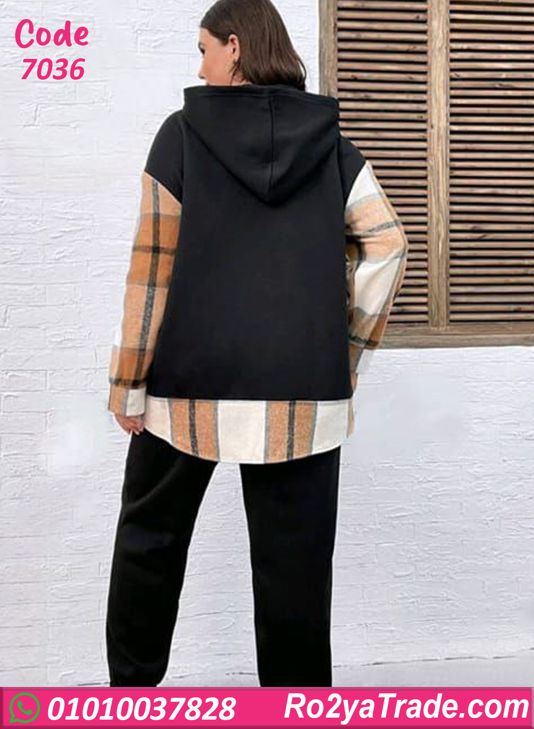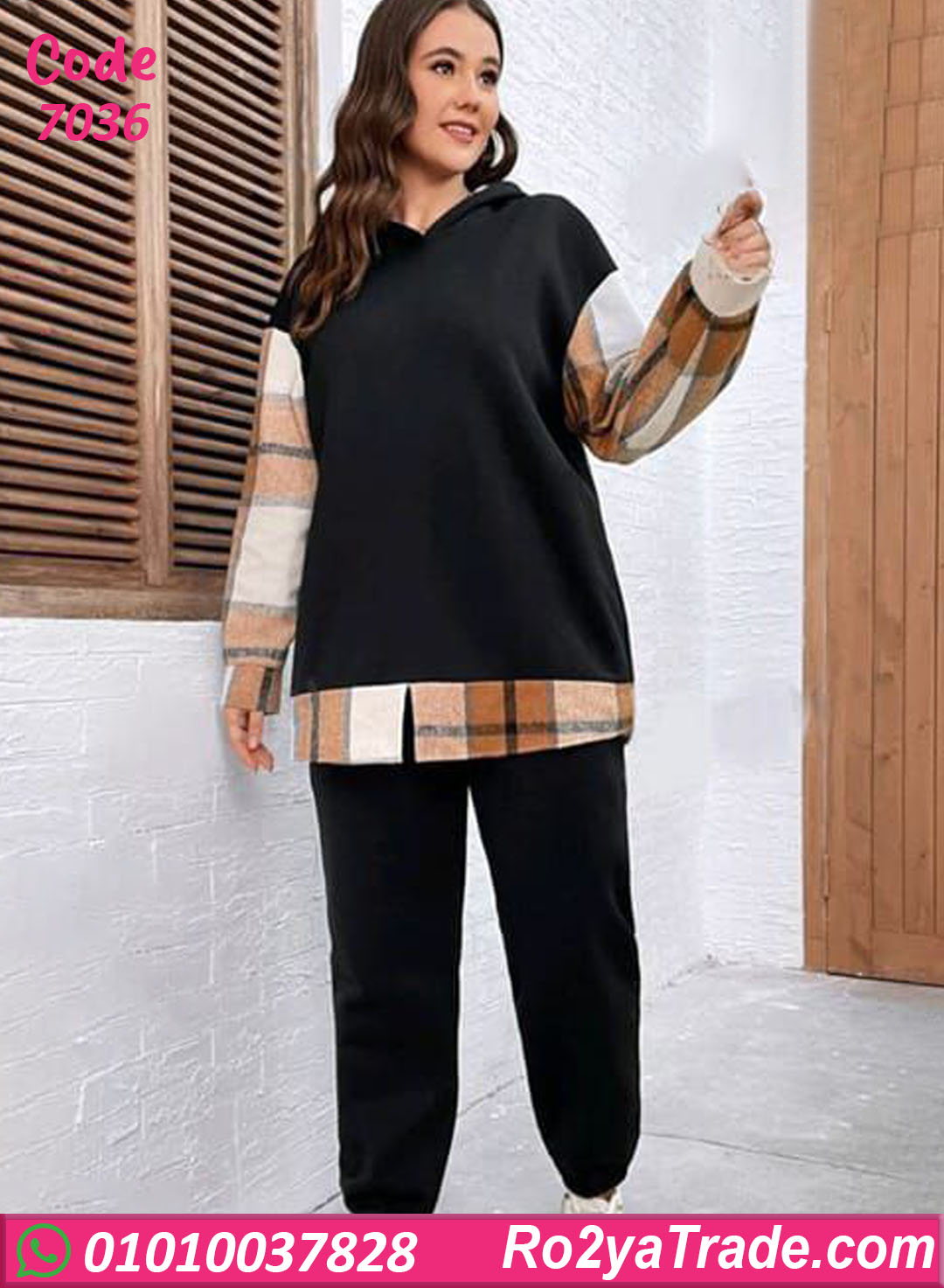 مكوّن من سويت شيرت سادة بكم كاروهات وبنطلون سادة بقصة مريحة، خامة دافية وناعمة جدًا، مناسب للخروج والبيت في أيام الشتا.