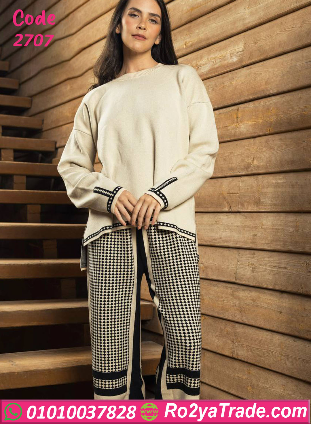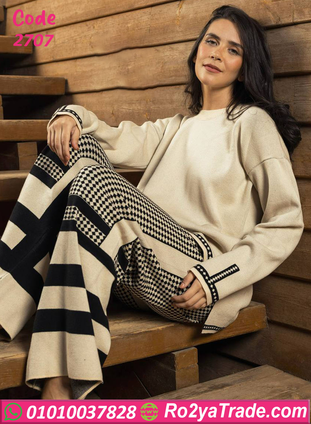 والبنطلون عليه نقشة كاروهات عريضة بخطوط هندسية جذابة بتدي شكل مودرن وأنيق. الترنج ده بيجمع بين البساطة والفخامة،