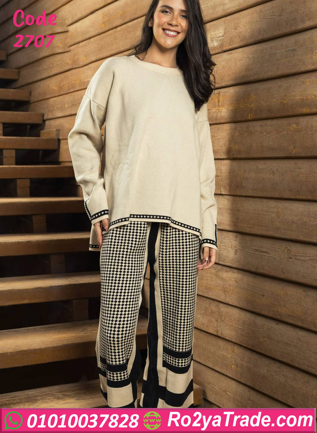 مصنوع من خامة تريكو فخمة ودافئة جدًا على الجسم، مناسبة للأيام الباردة. الجزء العلوي بلون سادة (بيچ أو أسود) بتصميم واسع مريح،