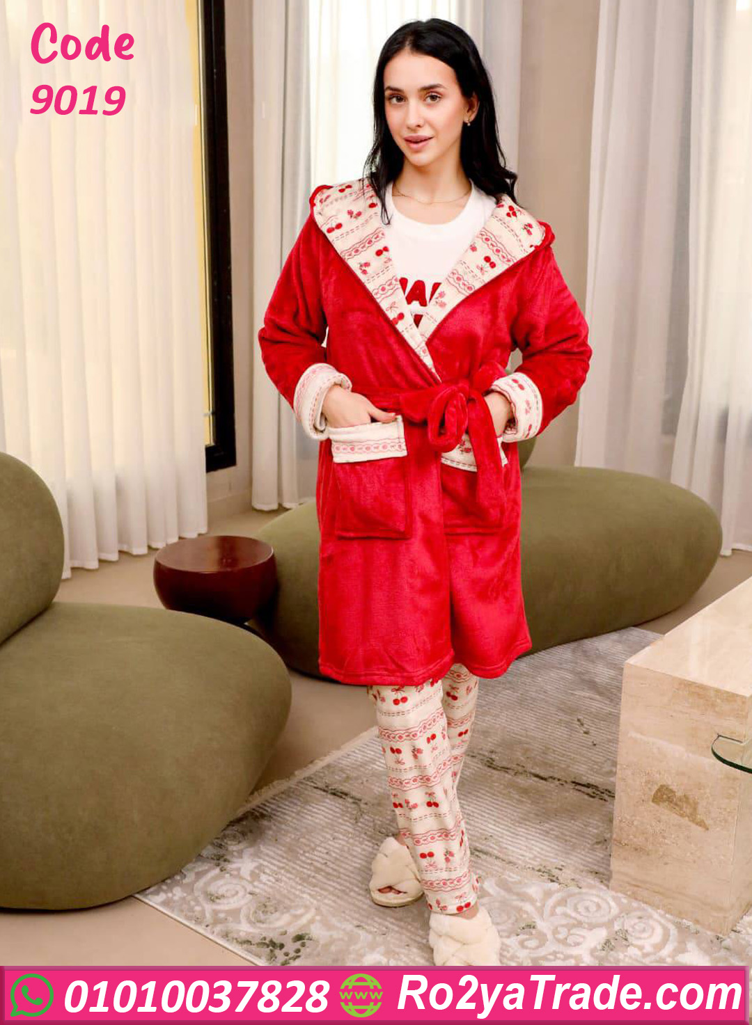 الروب بتصميم هودي علشان يحافظ على دفء راسك ورقبتك، وكمان عليه تطعيمات من نفس نقشة البنطلون بتدي تناسق راقي لشكل الطقم. ومع وجود الحزام تقدري تتحكّمي في القَفلة حسب راحتك، بالإضافة لجيوب جانبية عملية.
