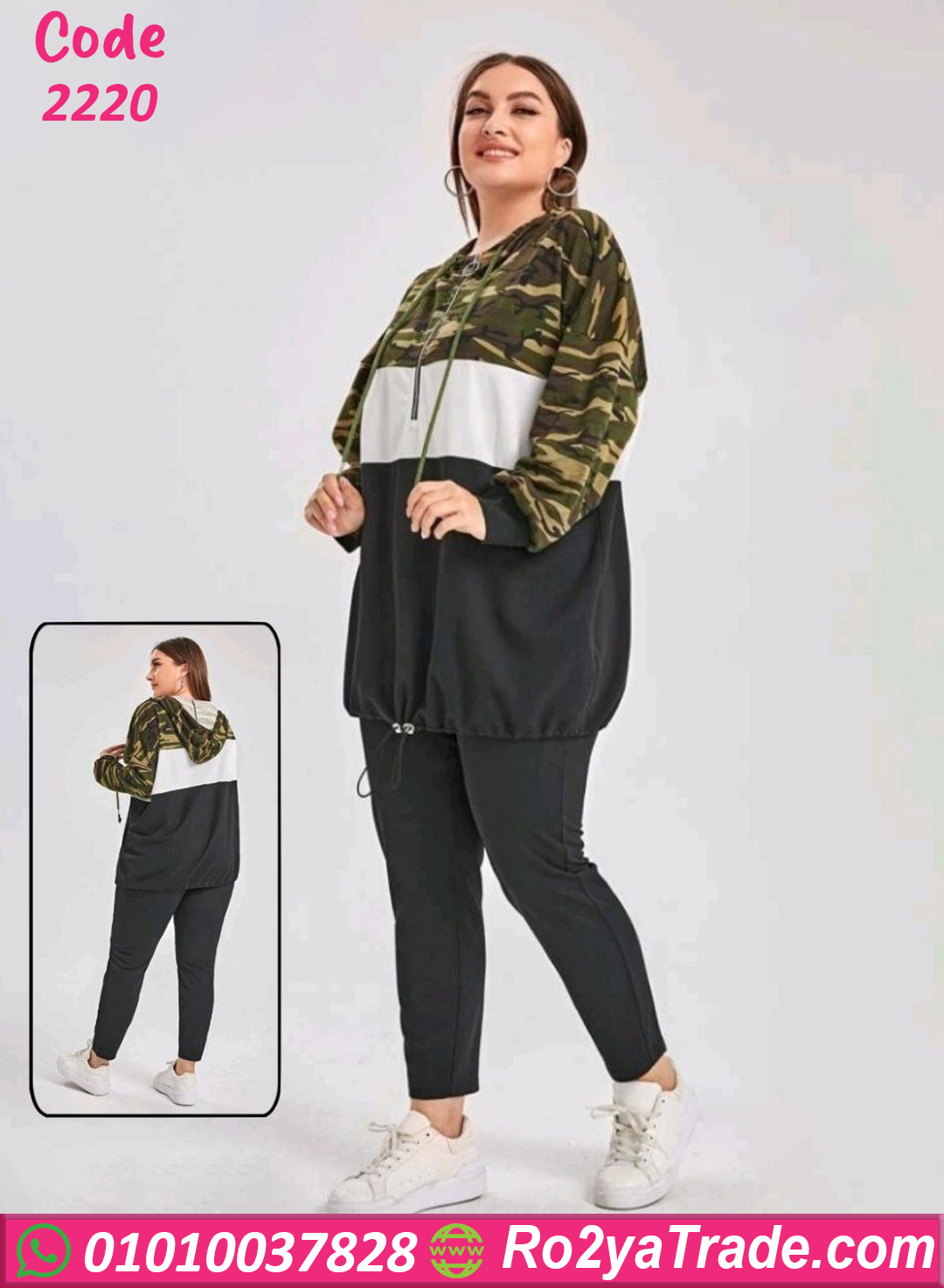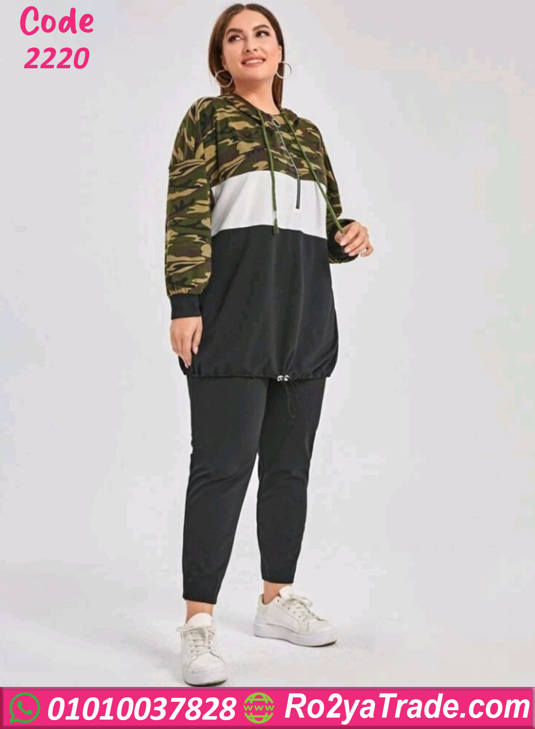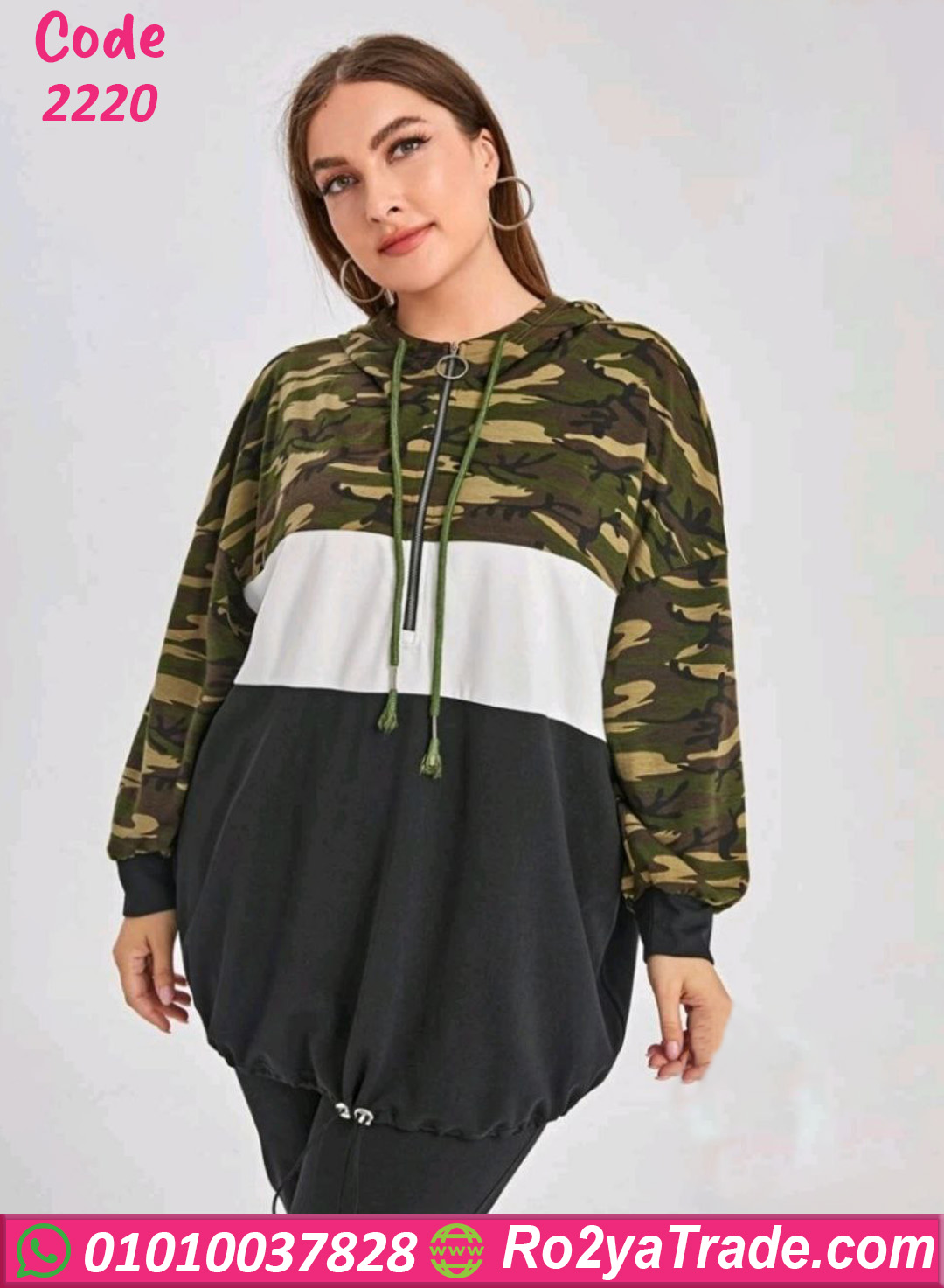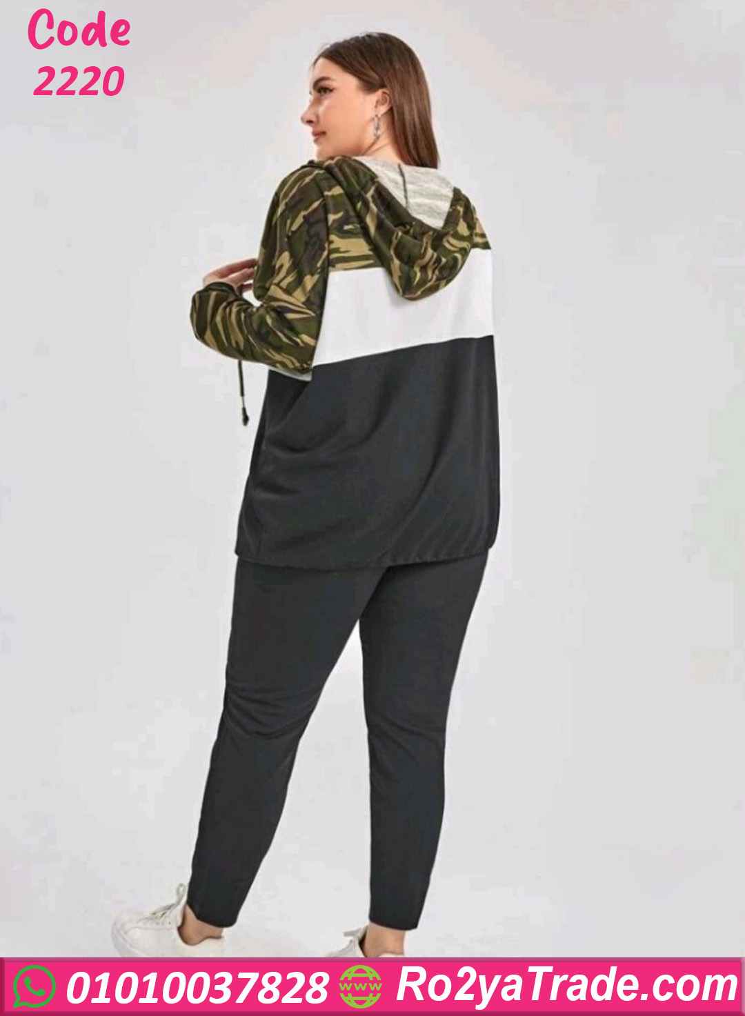 القطعة الأولى عبارة عن بلوزة هودي بأكمام طويلة مع تصميم عصري يجمع بين أكثر من لون مع نقشة الكاموفلاج العصرية في الجزء العلوي،