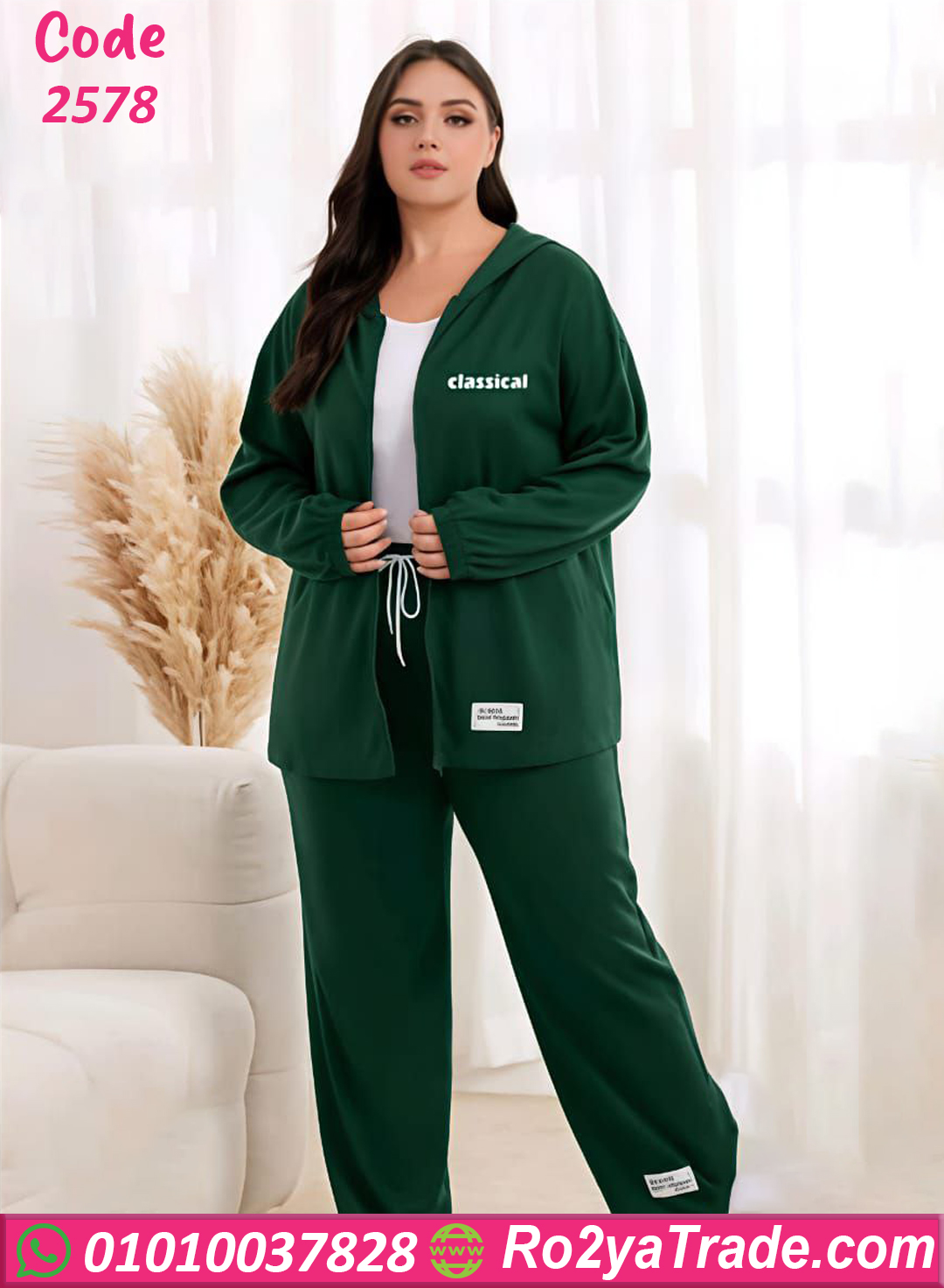 ترنج حريمي شتوي مكون من ثلاث قطع (جاكيت بغطاء رأس – تيشيرت داخلي – بنطلون) مصنوع من خامة قطنية ناعمة ومريحة تمنحك إحساس بالدفء والراحة طوال اليوم. يتميز التصميم بقصة مريحة تناسب الاستخدام اليومي.