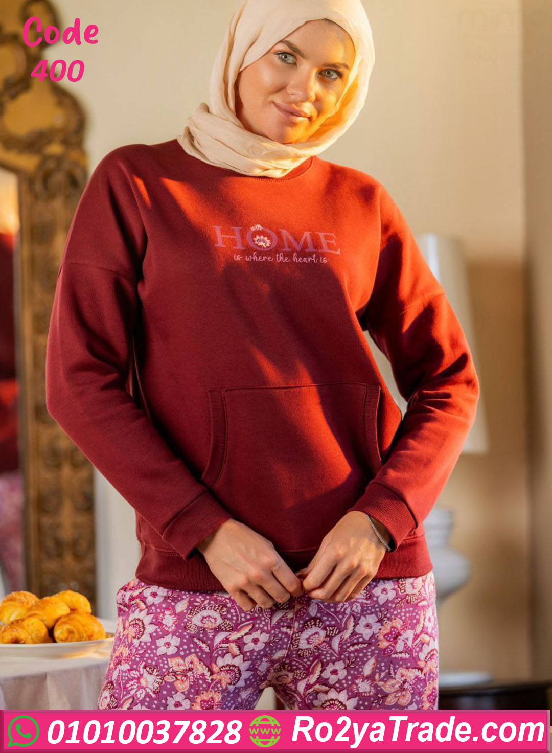 البلوزة لونها نبيتي مطرزة بكلمة HOME is where the heart is والبنطلون عليه نقشة فلاور ستايل شتوي شيك.