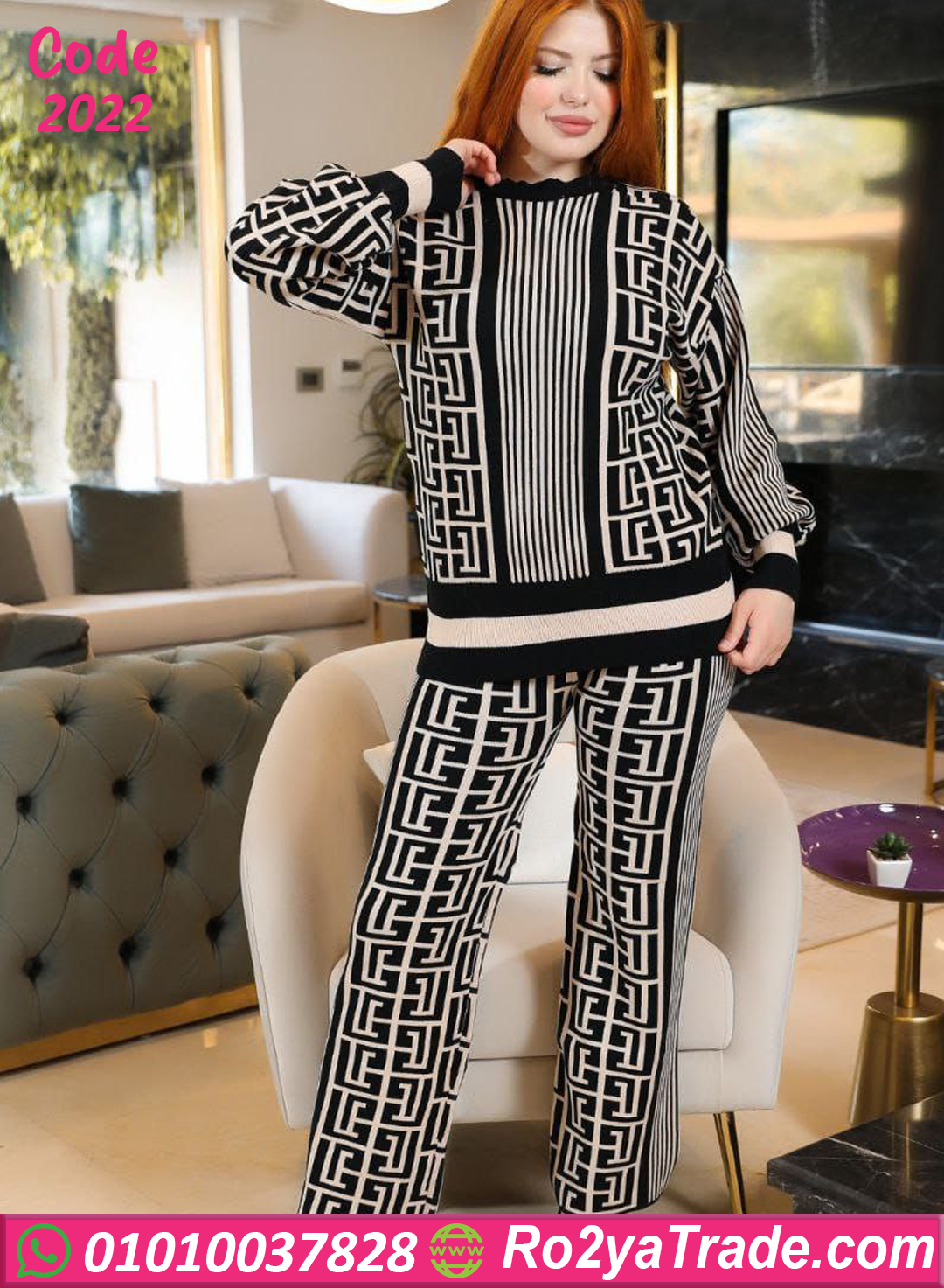 البلوفر مقفول من فوق بياقة دائرية مع بنطلون بنفس النقشة اللي بتكمل بعض بشكل مثالي، تقدر تلبسيه في البيت أو الخروج الكاجوال ويخليكي دايمًا ستايلش ومريحة في كل حركة 💫