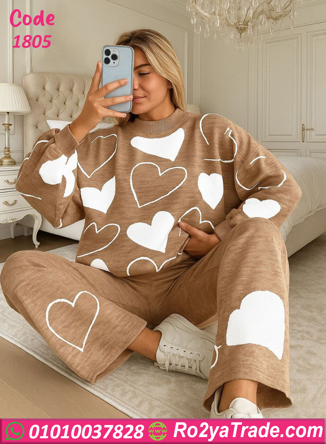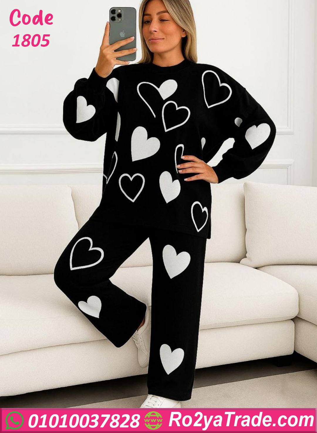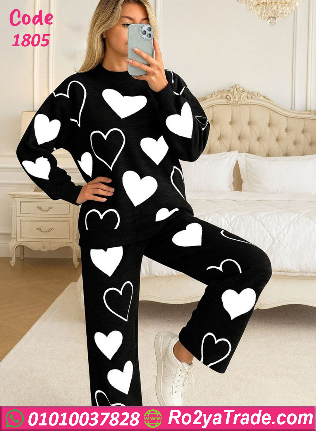 مصنوع من خامة ناعمة وسميكة بتدي دفء وأناقة في نفس الوقت، تصميمه مزين بقلوب كبيرة بتدي شكل جذاب ومميز. البنطلون واسع ومريح والتيشيرت بقَصّة عملية بتناسب كل الأذواق. مناسب للبيت، وللخروج الكاجوال في الشتاء.