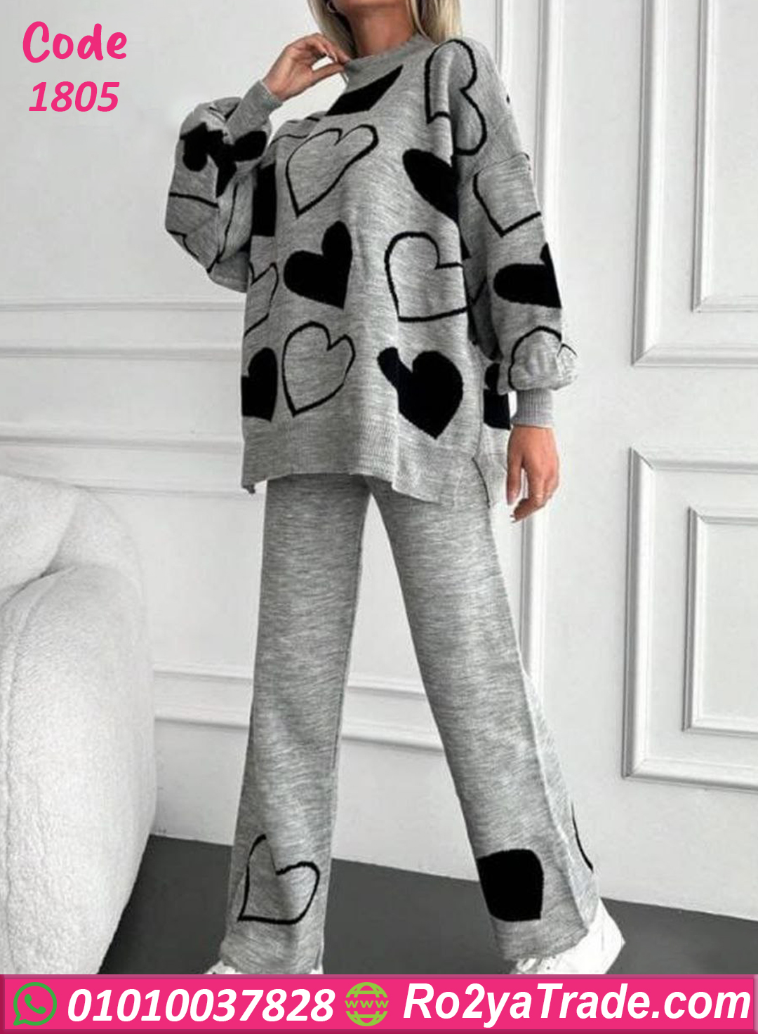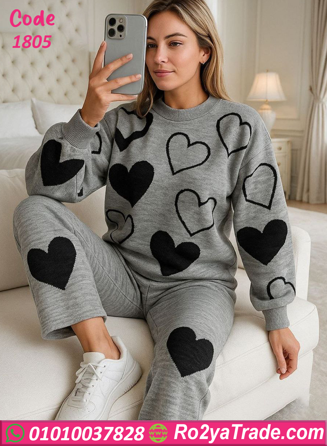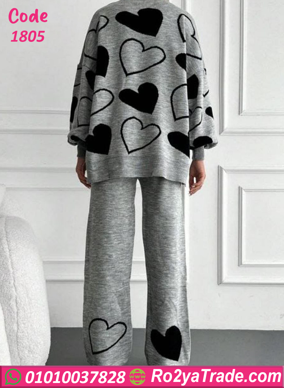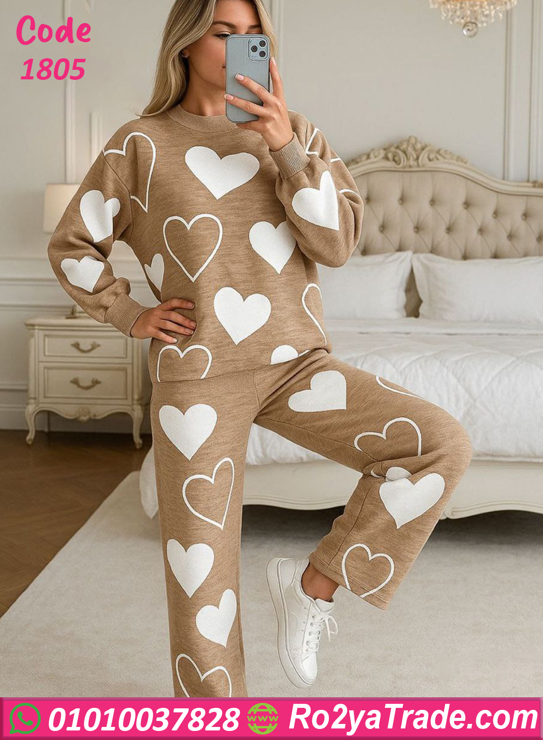 مصنوع من خامة ناعمة وسميكة بتدي دفء وأناقة في نفس الوقت، تصميمه مزين بقلوب كبيرة بتدي شكل جذاب ومميز. البنطلون واسع ومريح والتيشيرت بقَصّة عملية بتناسب كل الأذواق. مناسب للبيت، وللخروج الكاجوال في الشتاء.