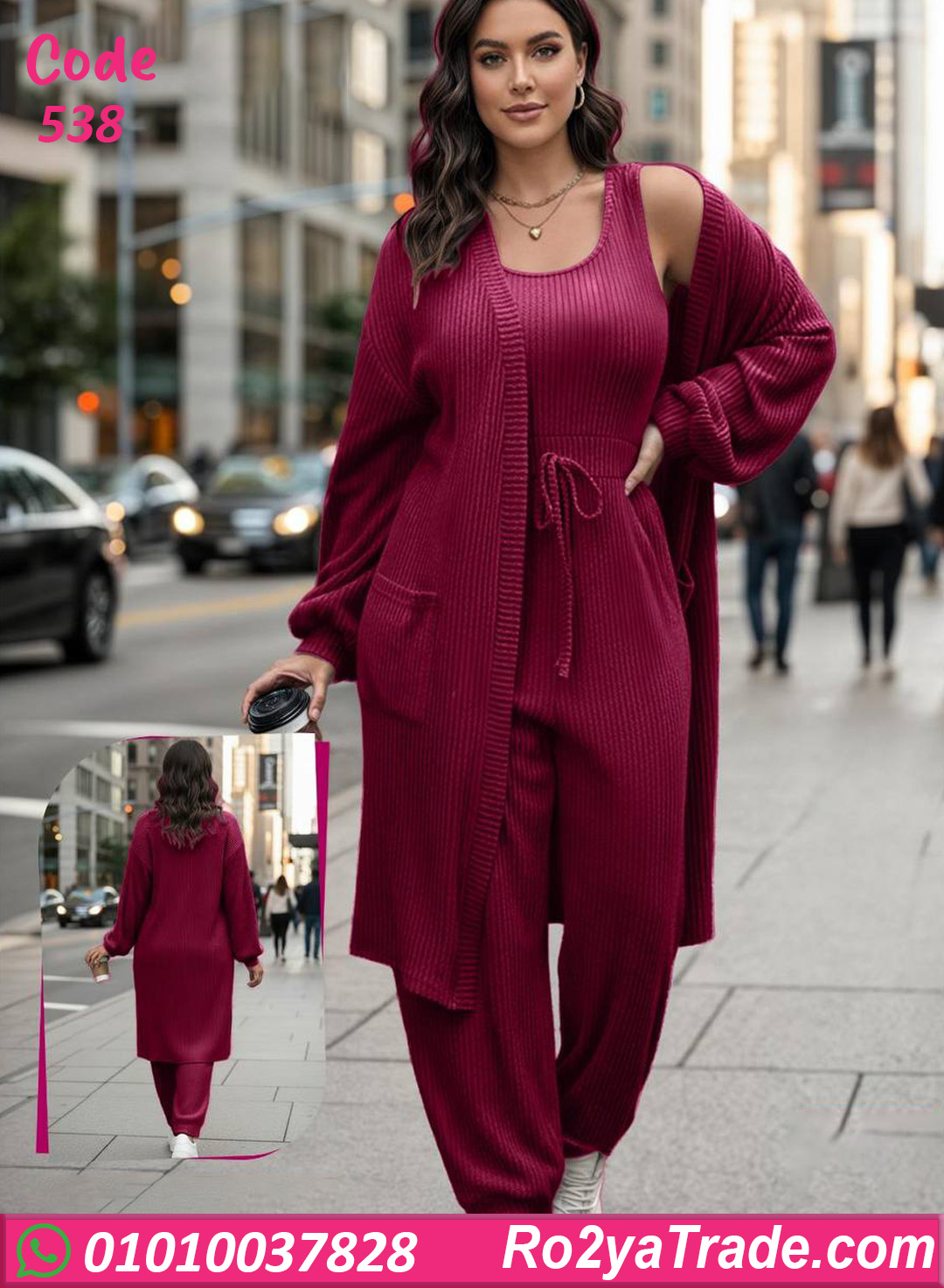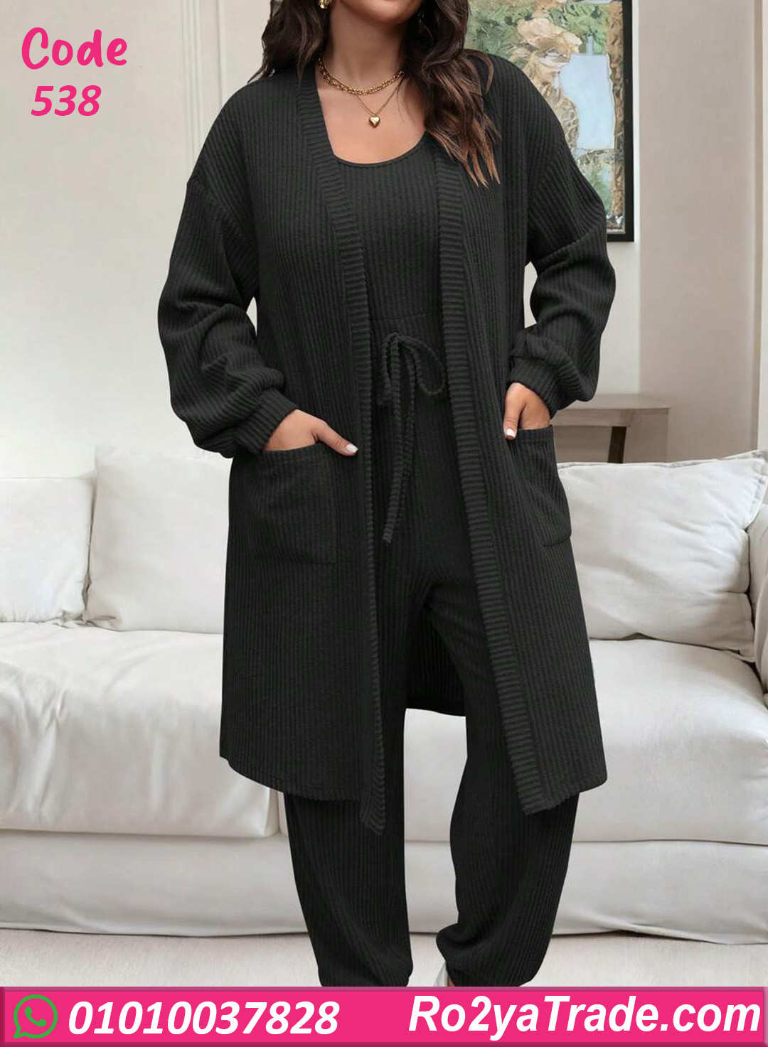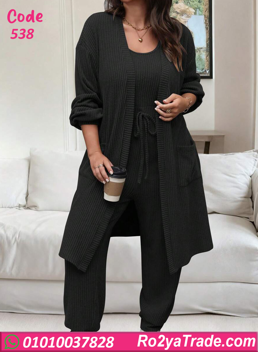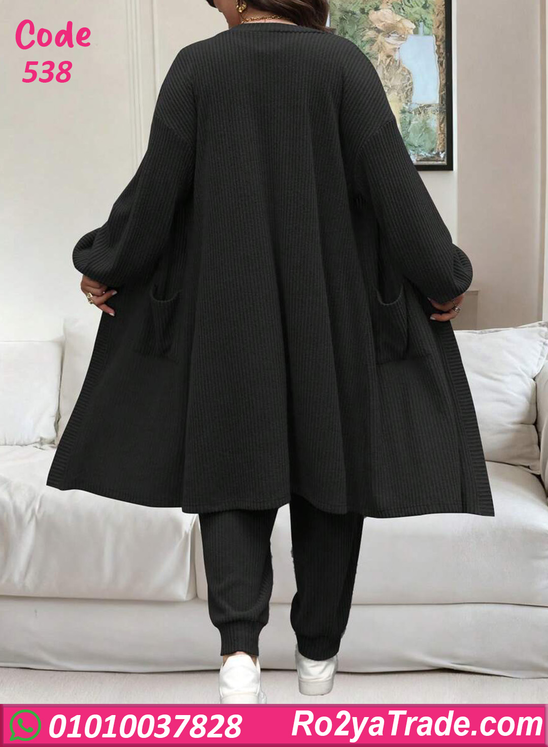 ترنج شتوي حريمي خامته مضلعة ناعمة وتقيلة بيدي إحساس بالدفا والراحة طول اليوم. التصميم مكوّن من قطعتين مع كارديجان عملي بجيوب