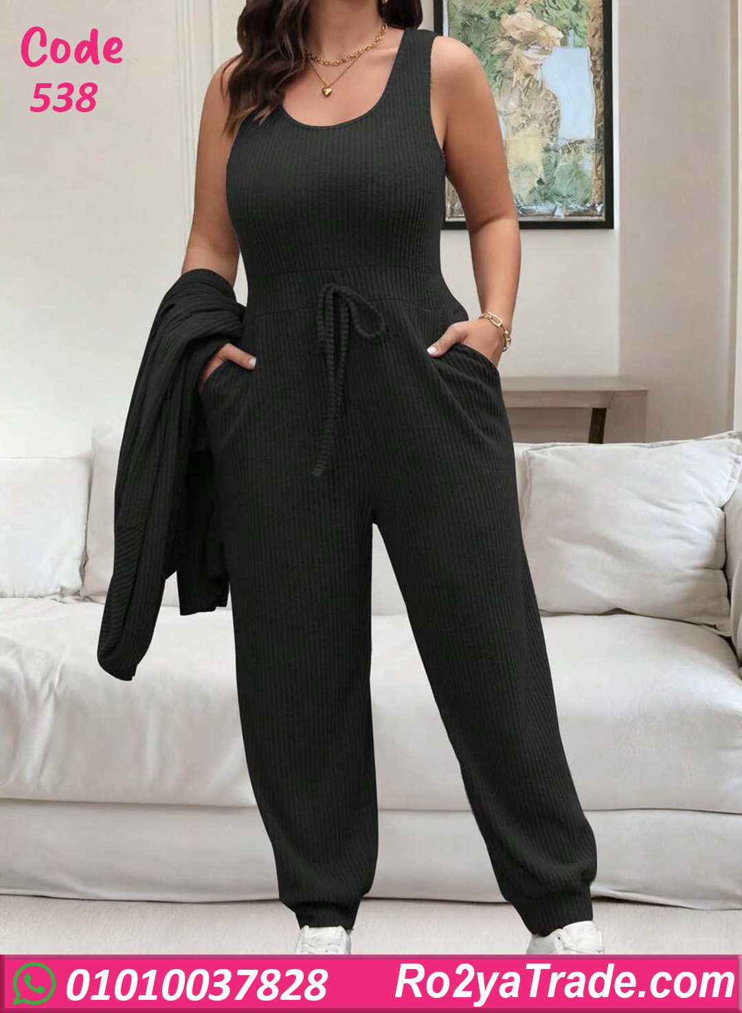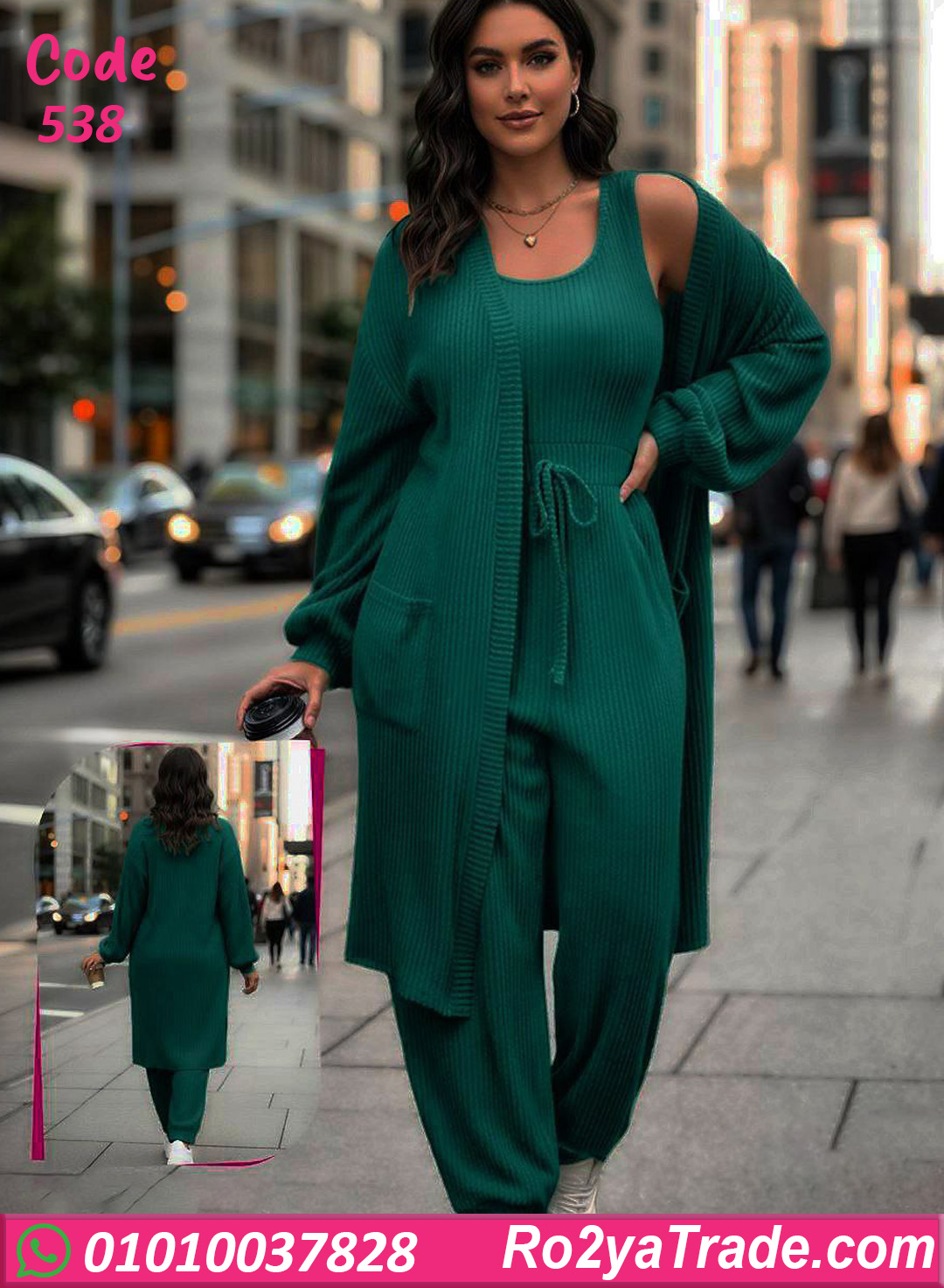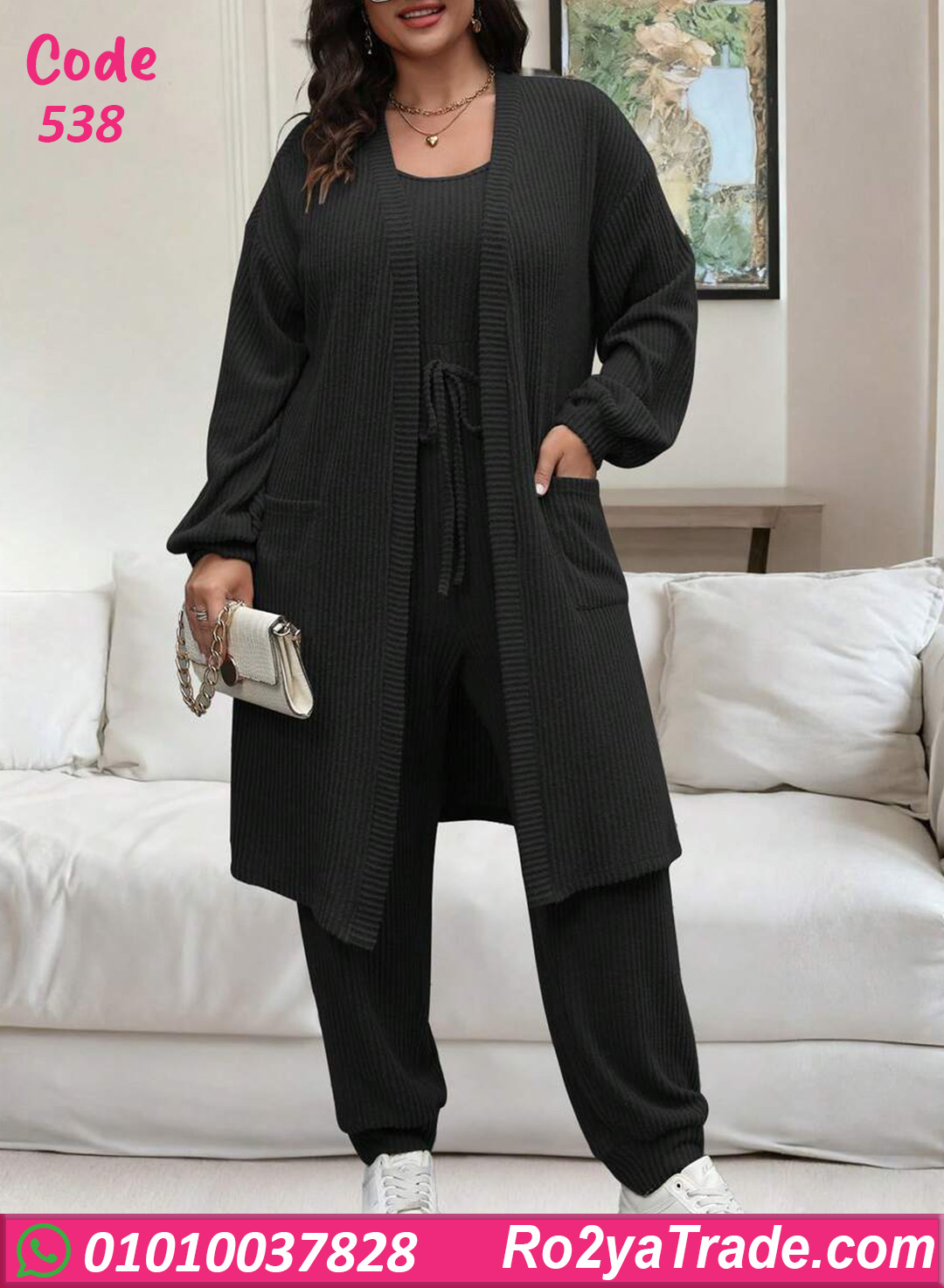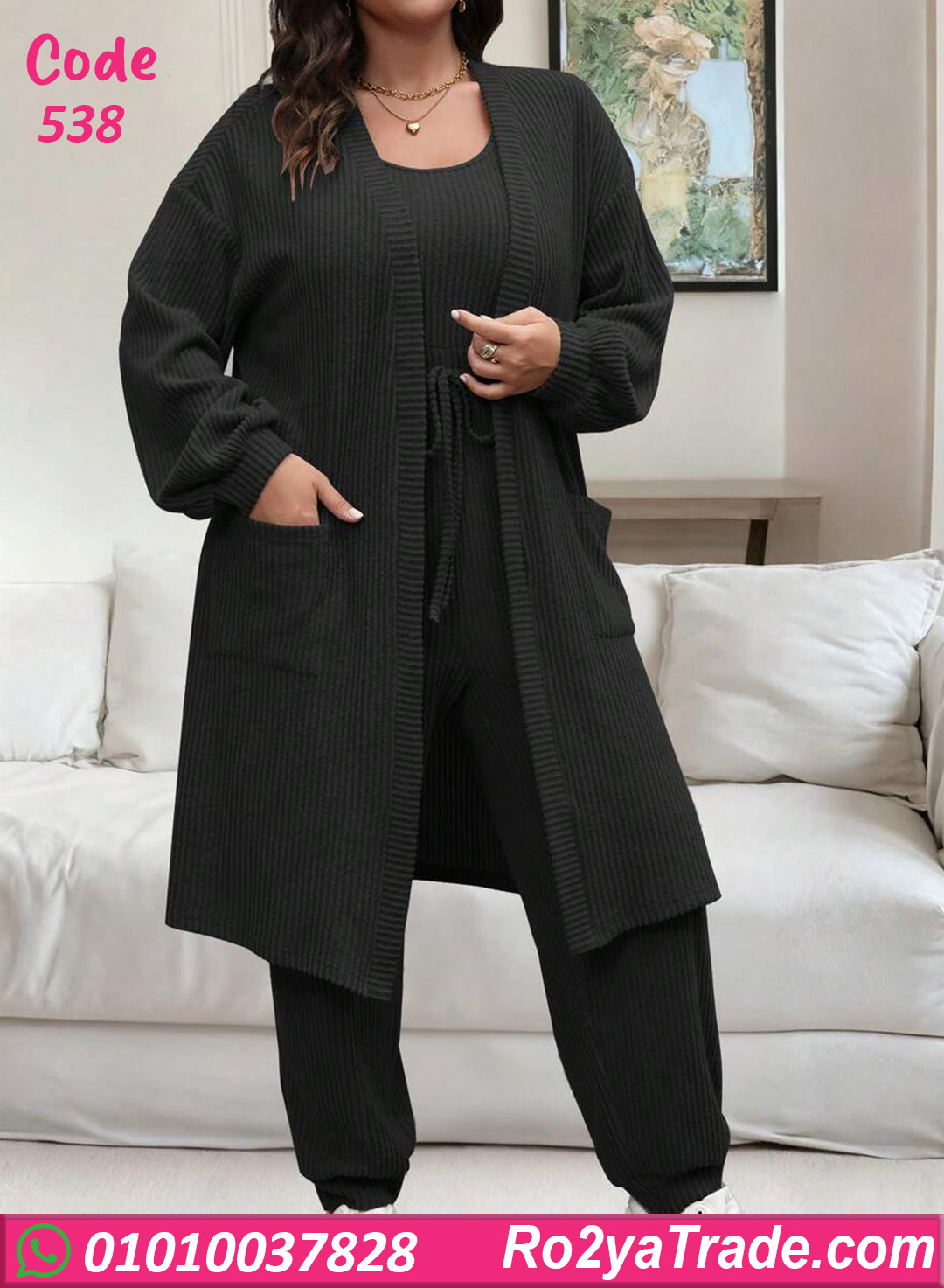 ترنج شتوي حريمي خامته مضلعة ناعمة وتقيلة بيدي إحساس بالدفا والراحة طول اليوم. التصميم مكوّن من قطعتين مع كارديجان عملي بجيوب