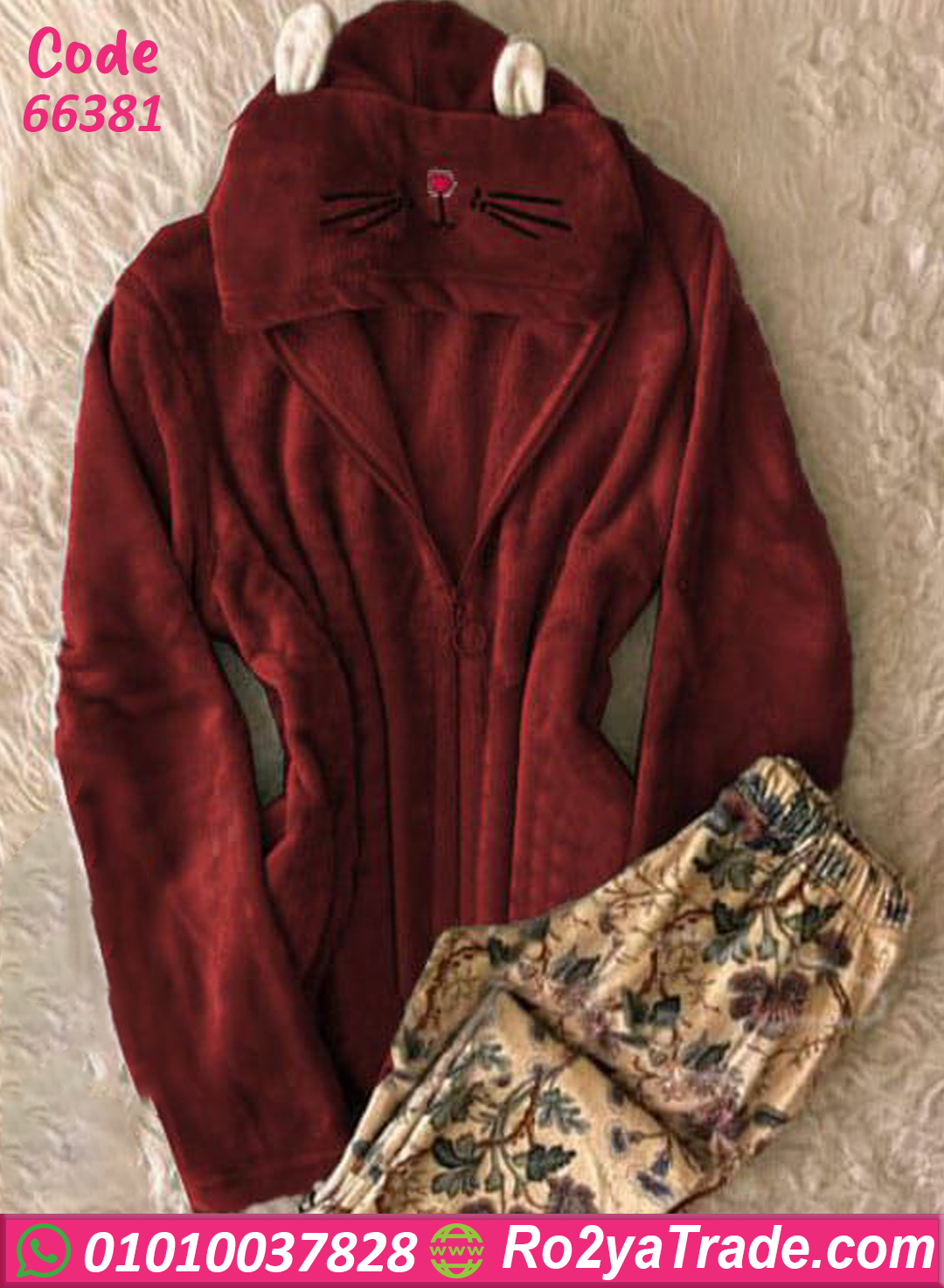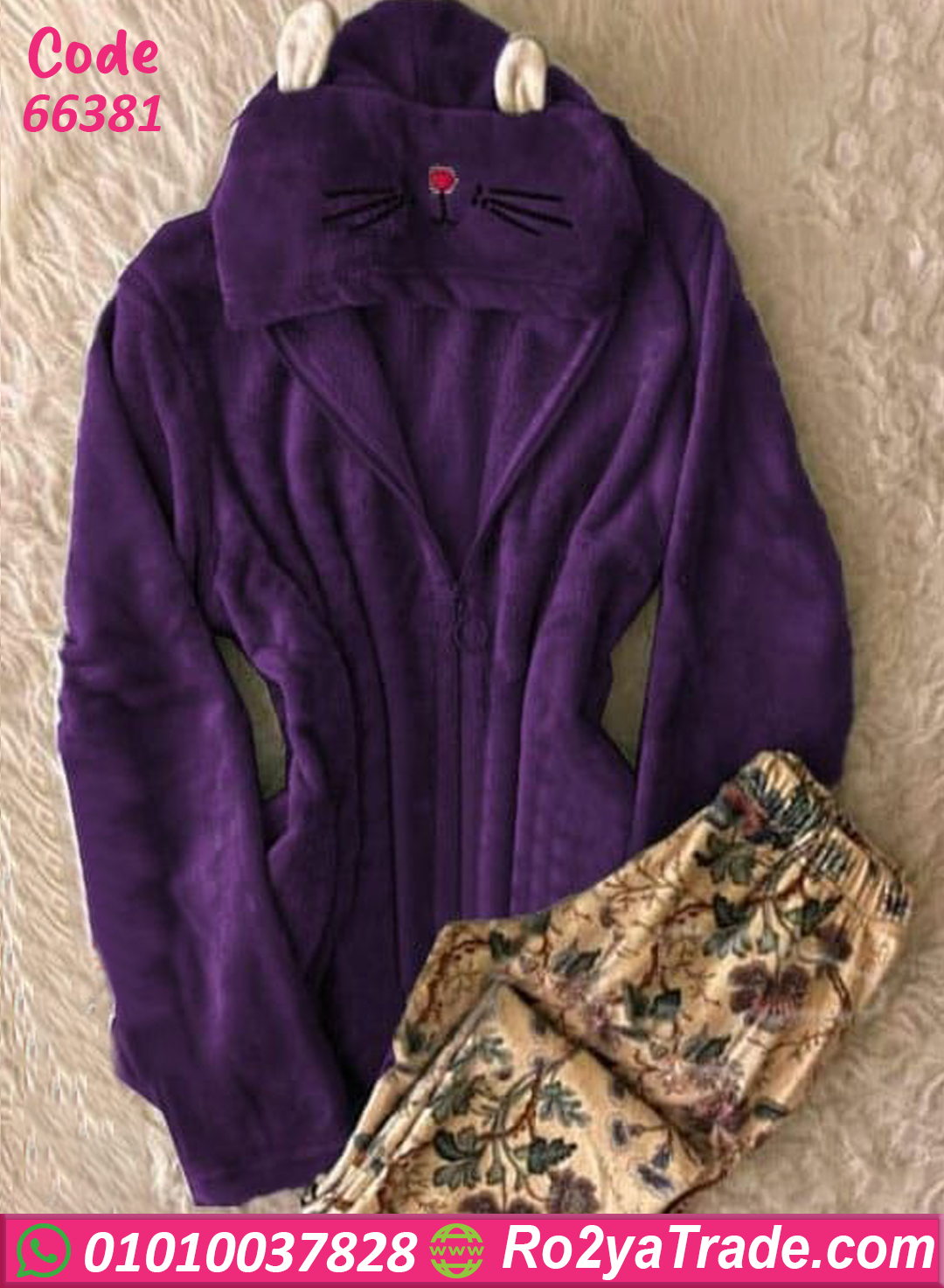 الخامة قطيفة سوفت عالية الجودة، ناعمة جدًا على البشرة، والجاكت فيه سوستة كاملة مع كاب بكَرفات شكل قطة بتدي لمسة كيوت وجذابة 😍