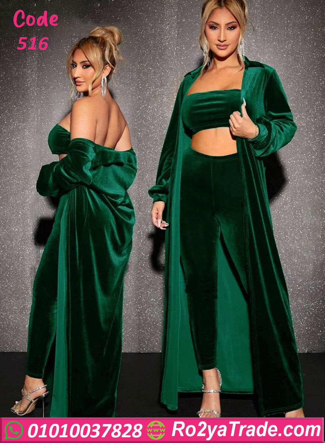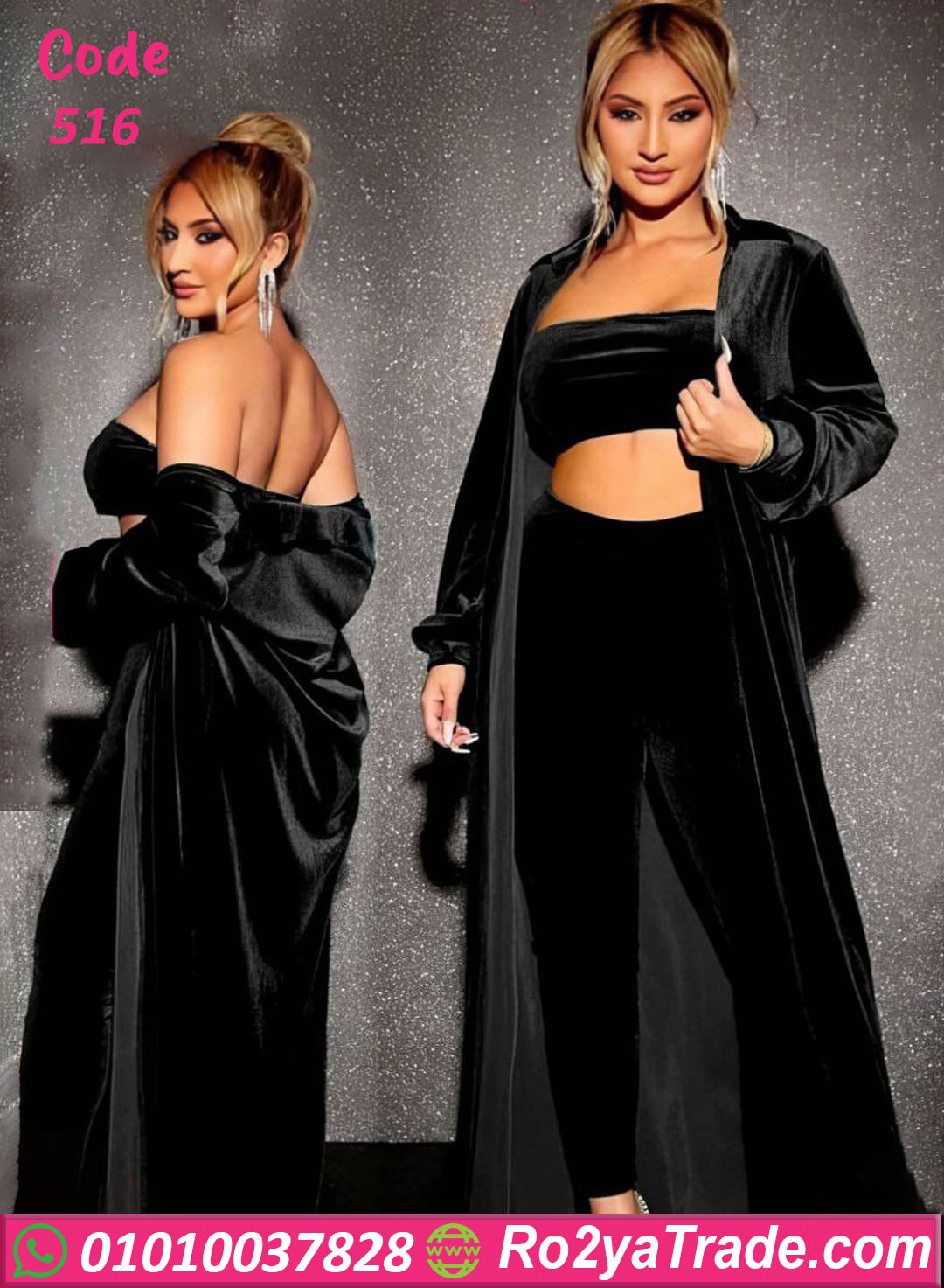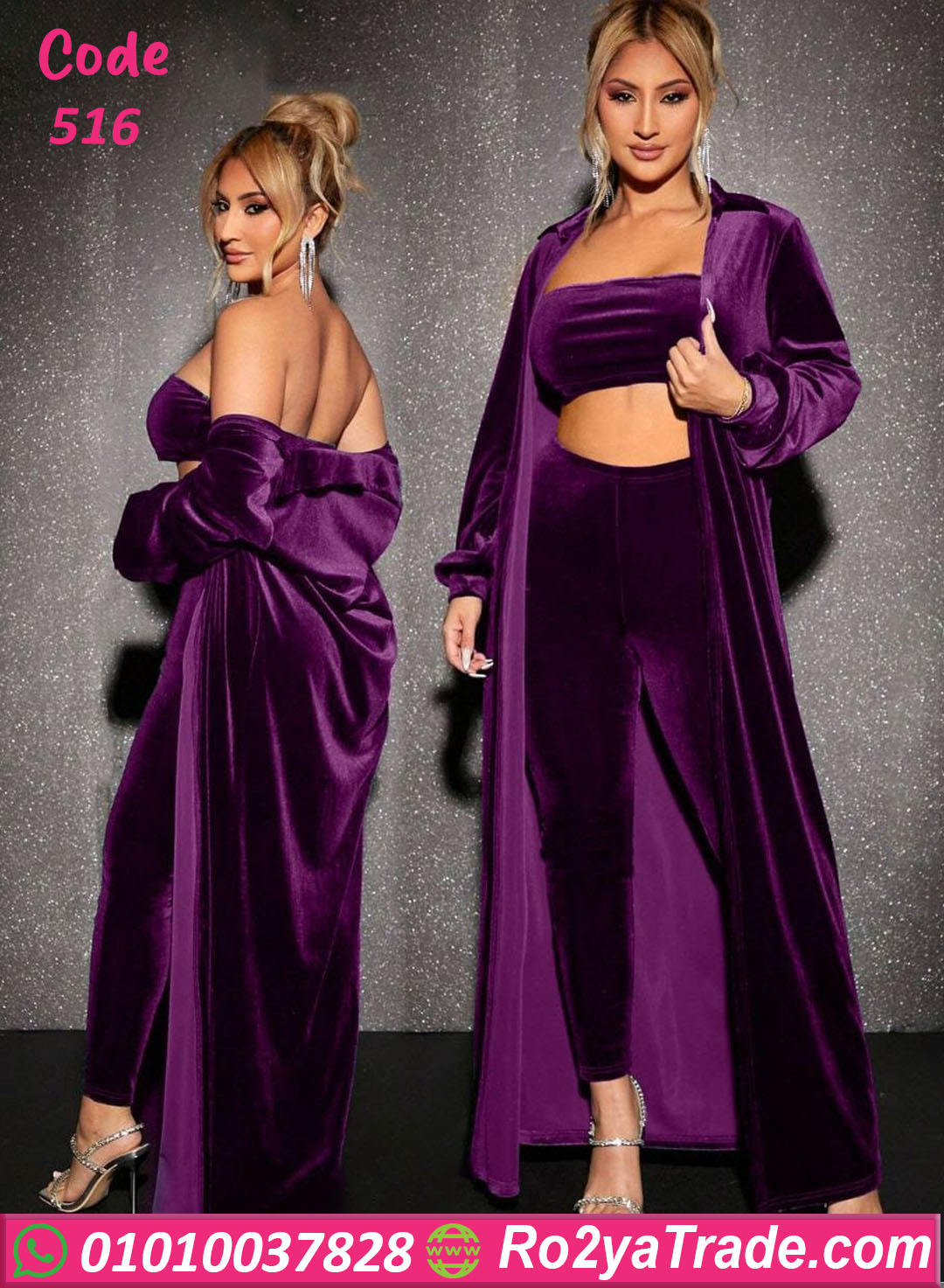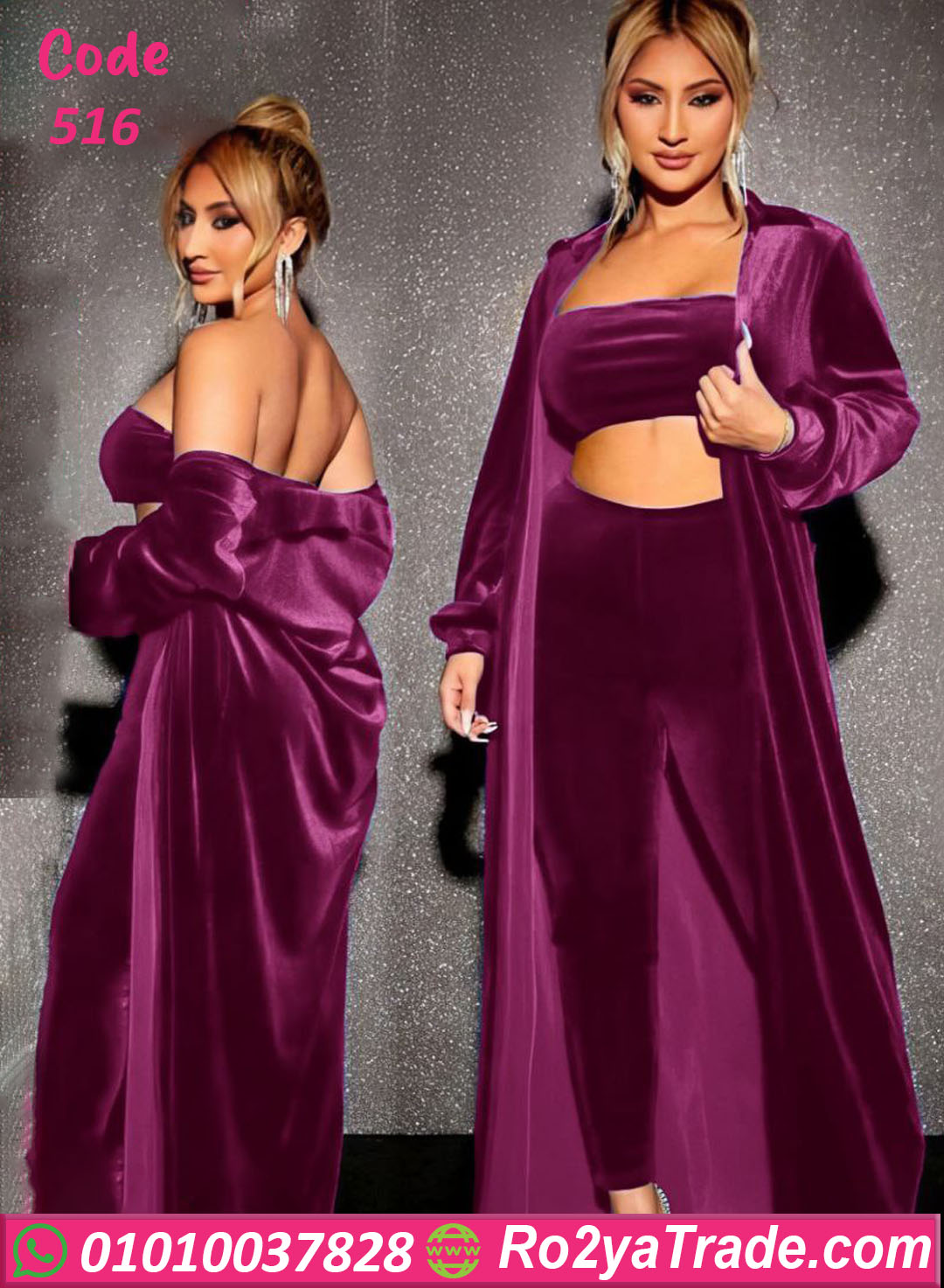 الطقم مصنوع من خامة القطيفة اللامعة اللي بتديكي إحساس بالدفا والفخامة في نفس الوقت. مكوَّن من 3 قطع أنيقة: كروب توب ناعم، بنطلون هاي ويست بستايل جذاب، وروب طويل انسيابي بيكمل الإطلالة بكل أناقة.