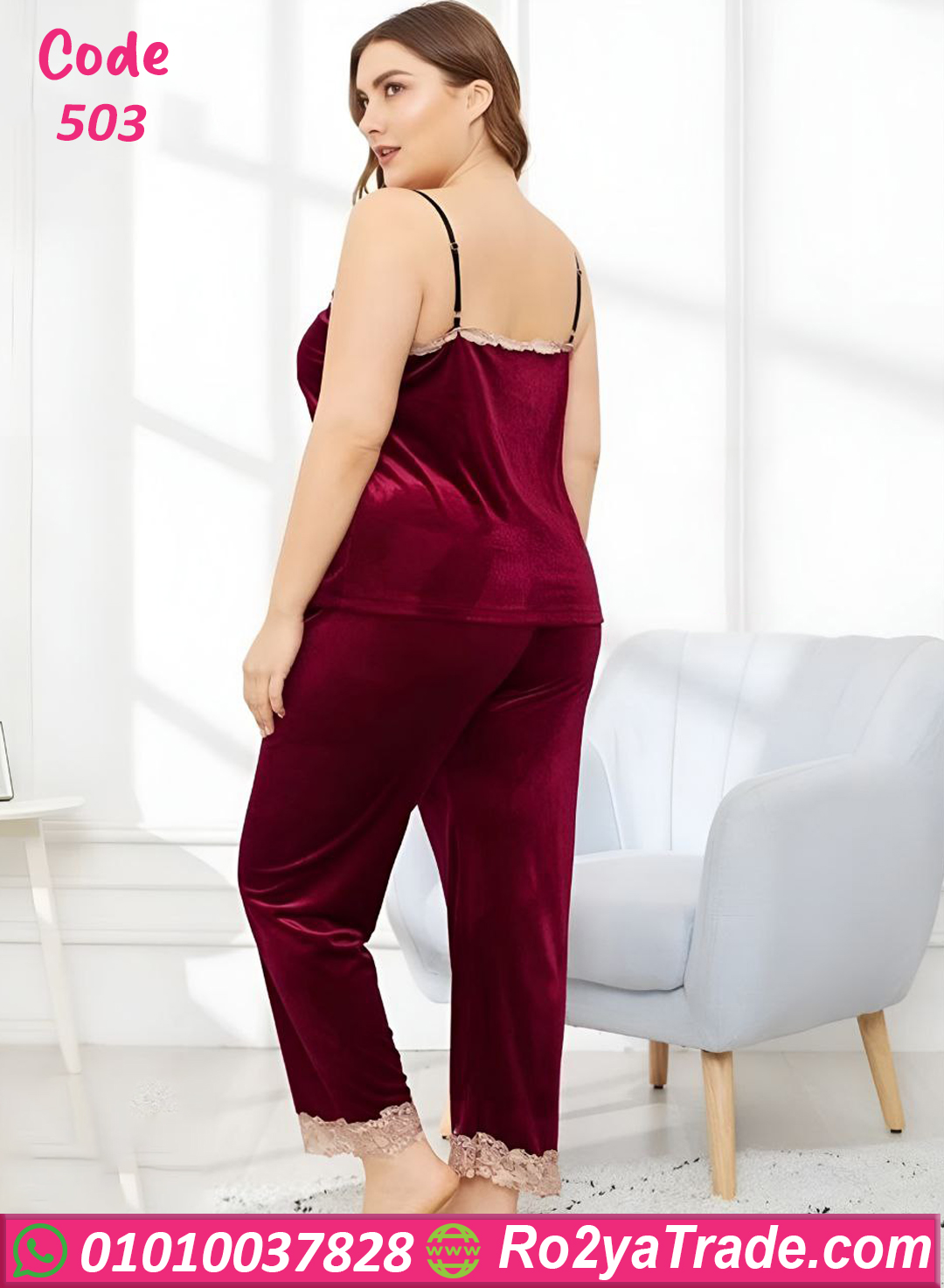مصنوع من خامة مخمل فاخرة ناعمة جدًا على البشرة، تديكي إحساس دفا ورفاهية في نفس الوقت. التصميم أنثوي وراقي بلمسات دانتيل شيك عند الأكمام والياقة وأسفل البنطلون، علشان تكوني جذابة وأنيقة في البيت بأقل مجهود.