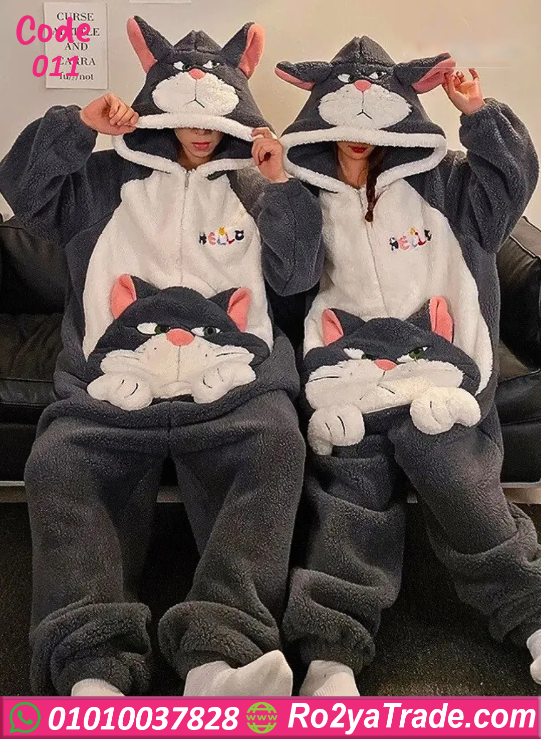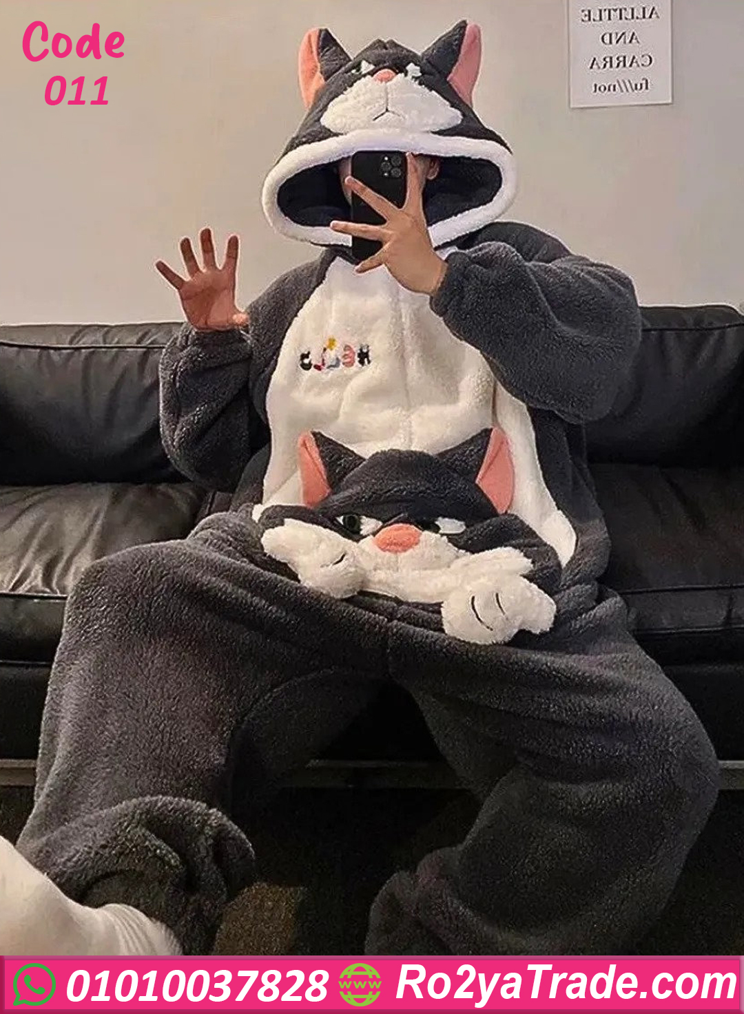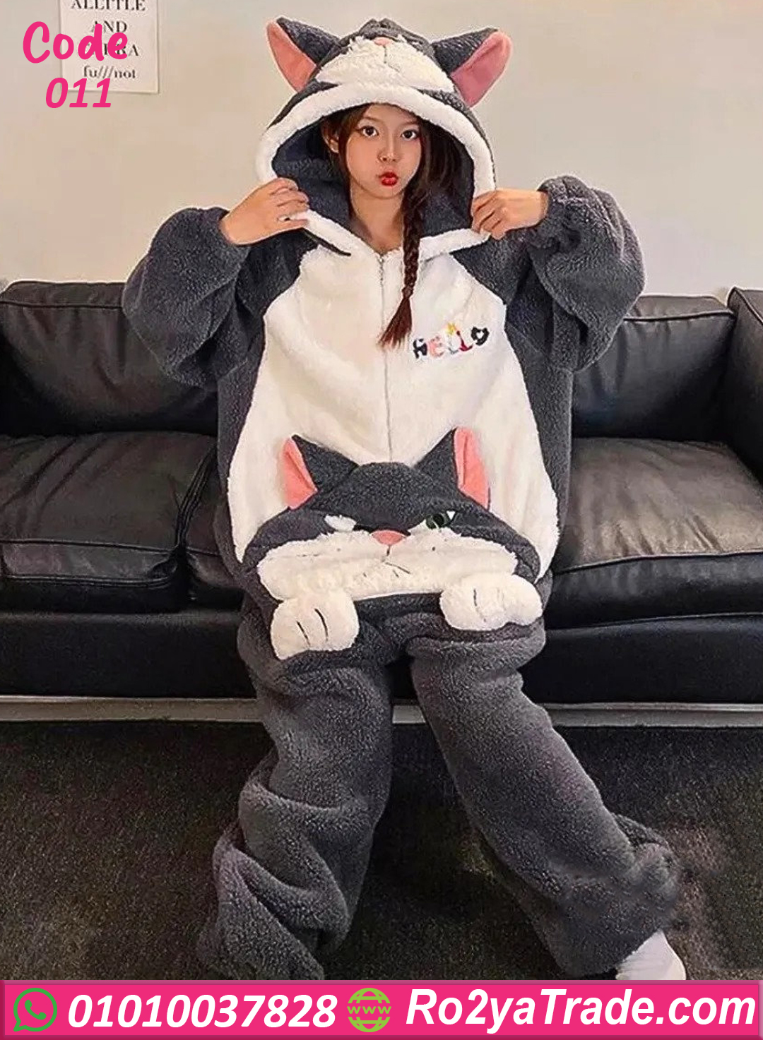 جمبسوت شتوي ناعم بخامة قطيفة فرو سميكة تدفي في البرد، بتصميم كارتوني لطيف على شكل قطة بخوذة هودي وأكمام واسعة، بيجمع بين الراحة والمرح في اللبس 🐱✨