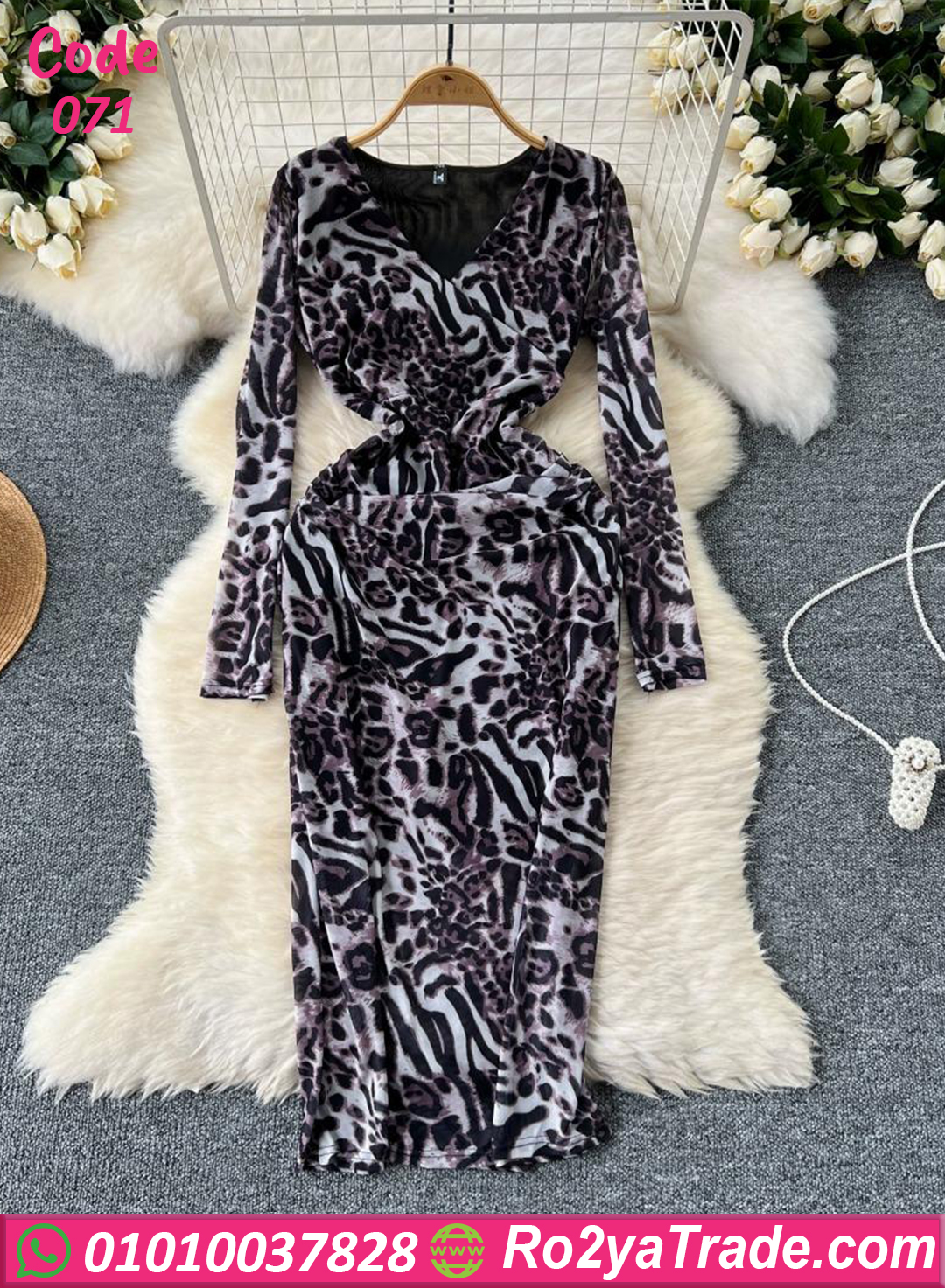 الدريس مصنوع من خامة خفيفة مطّاطه ومريحة جدًا في اللبس، بتاخد شكل الجسم بطريقة أنيقة ومغرية. النقشة التايجر بالدرجات الرمادي والأسود بتدي لمسة فخامة وشياكة، والكم الطويل بيكمل اللوك الراقي في الصيف والربيع.
