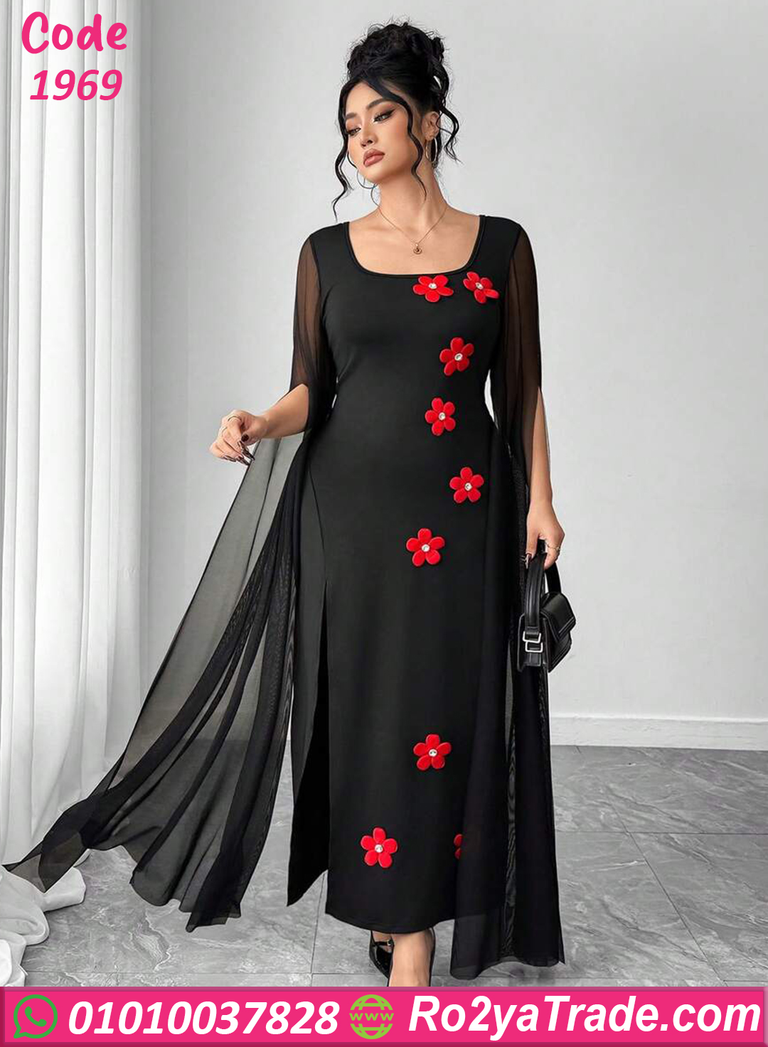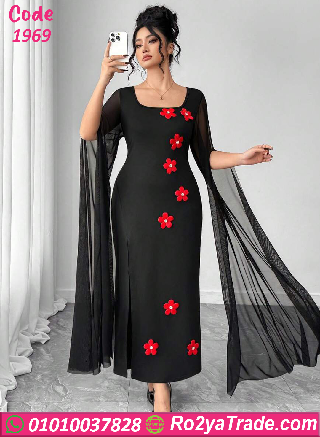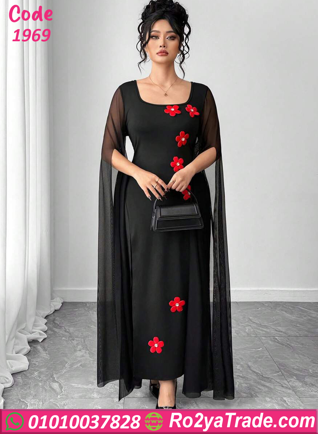 يأتي التصميم بقصة طويلة مستقيمة تعطي مظهرًا راقيًا، مع أكمام شفافة واسعة تضيف لمسة أنيقة ومميزة للحركة. كما تضيف الزهور المزخرفة على الفستان لمسة أنثوية جذابة تجعل التصميم مختلفًا ومميزًا.