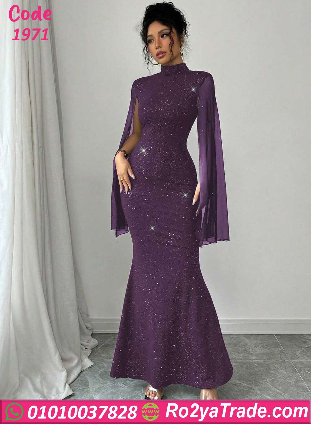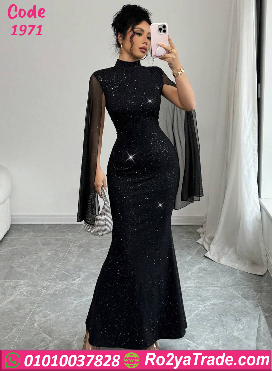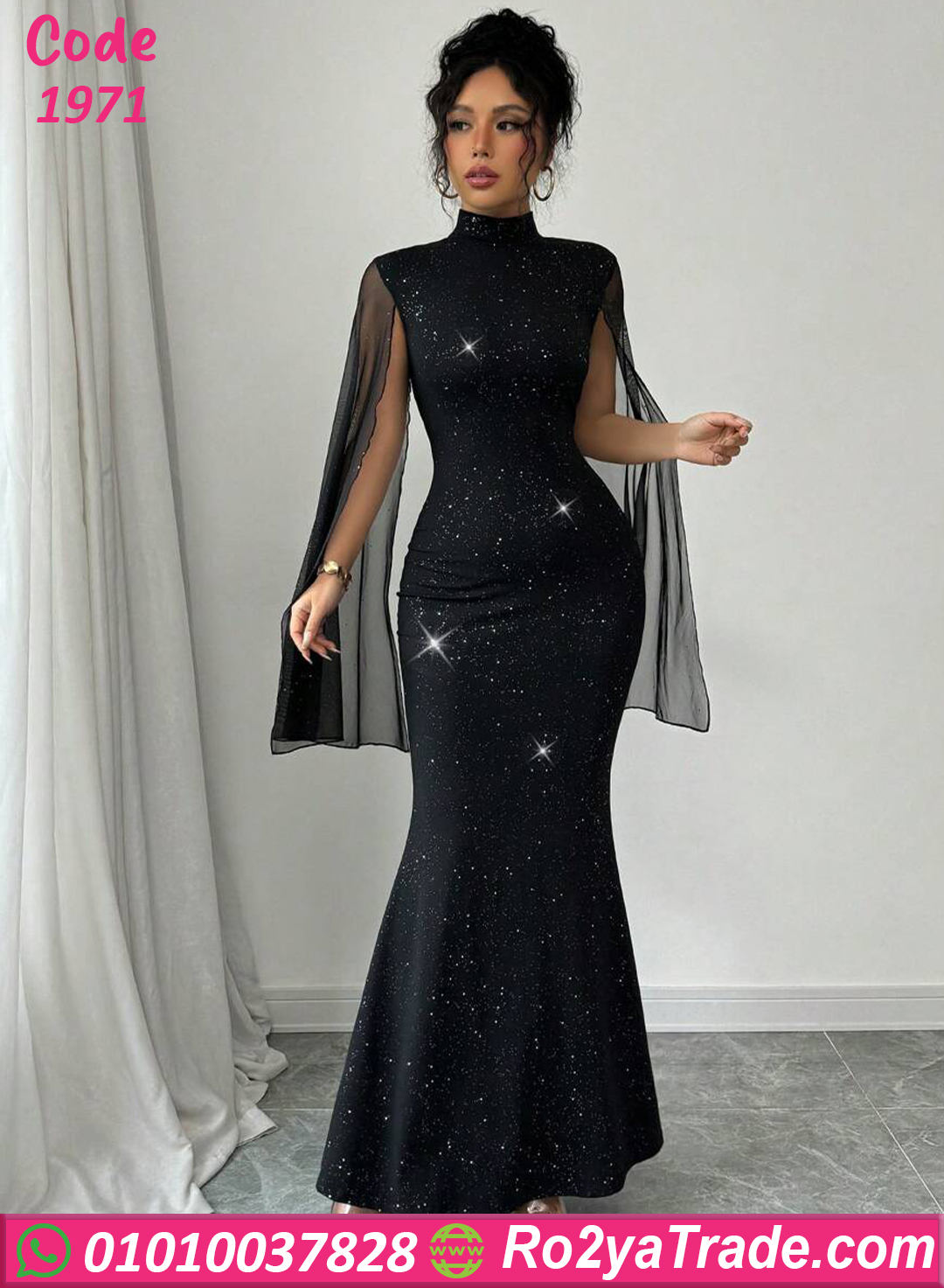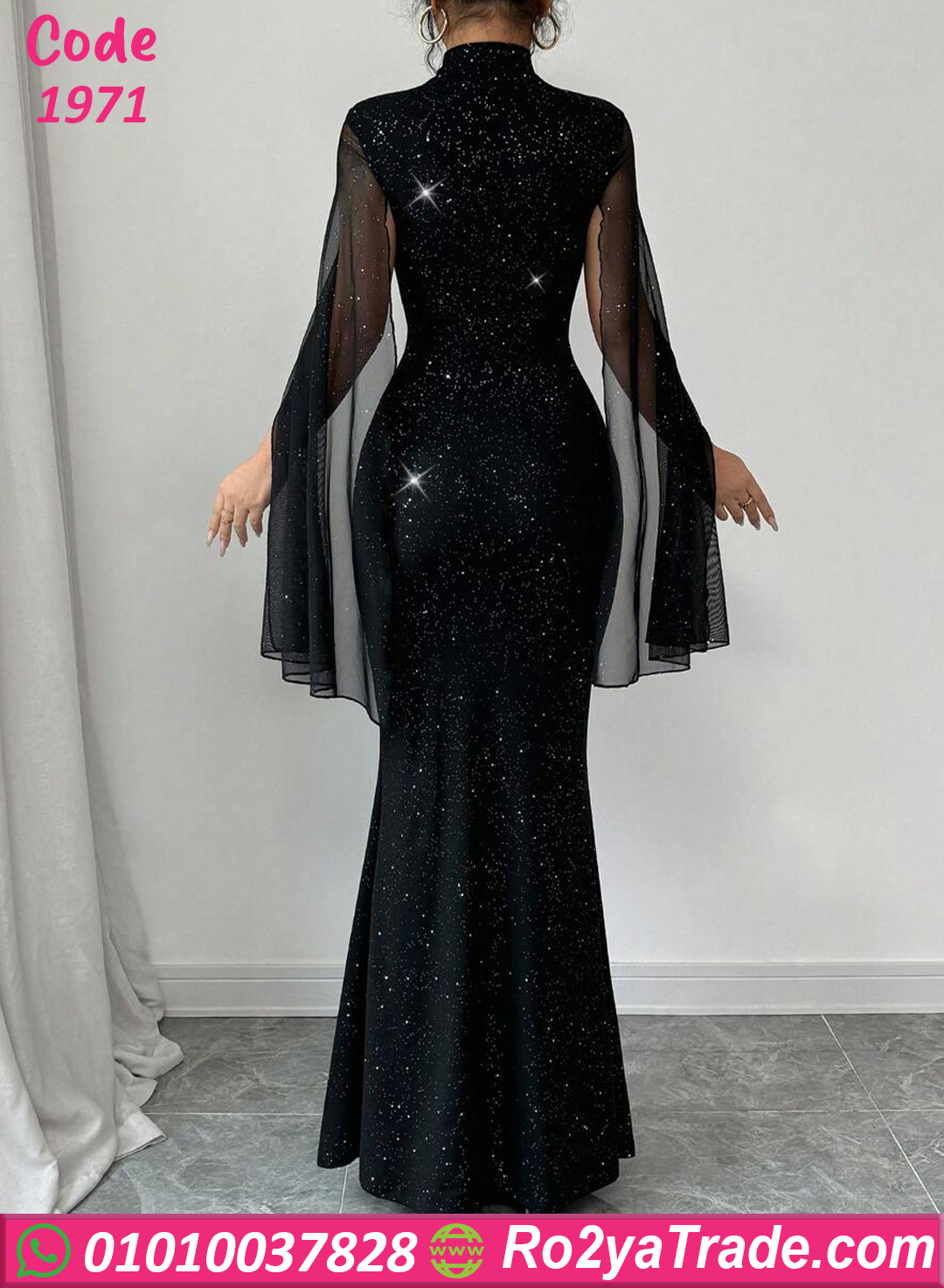 يأتي التصميم برقبة عالية أنيقة تضيف لمسة راقية، مع أكمام شفافة واسعة تعطي حركة أنيقة ومظهرًا فخمًا. كما أن التفاصيل اللامعة المنتشرة على الفستان تمنح التصميم بريقًا جذابًا يجعله مناسبًا للسهرات والمناسبات.