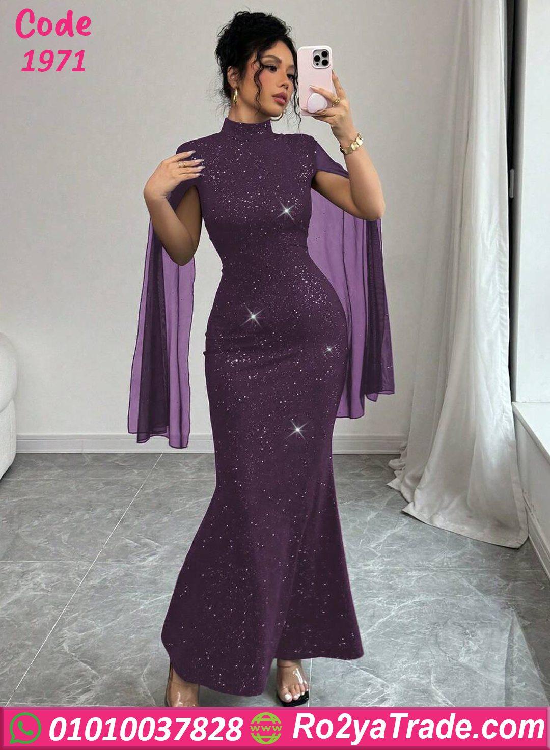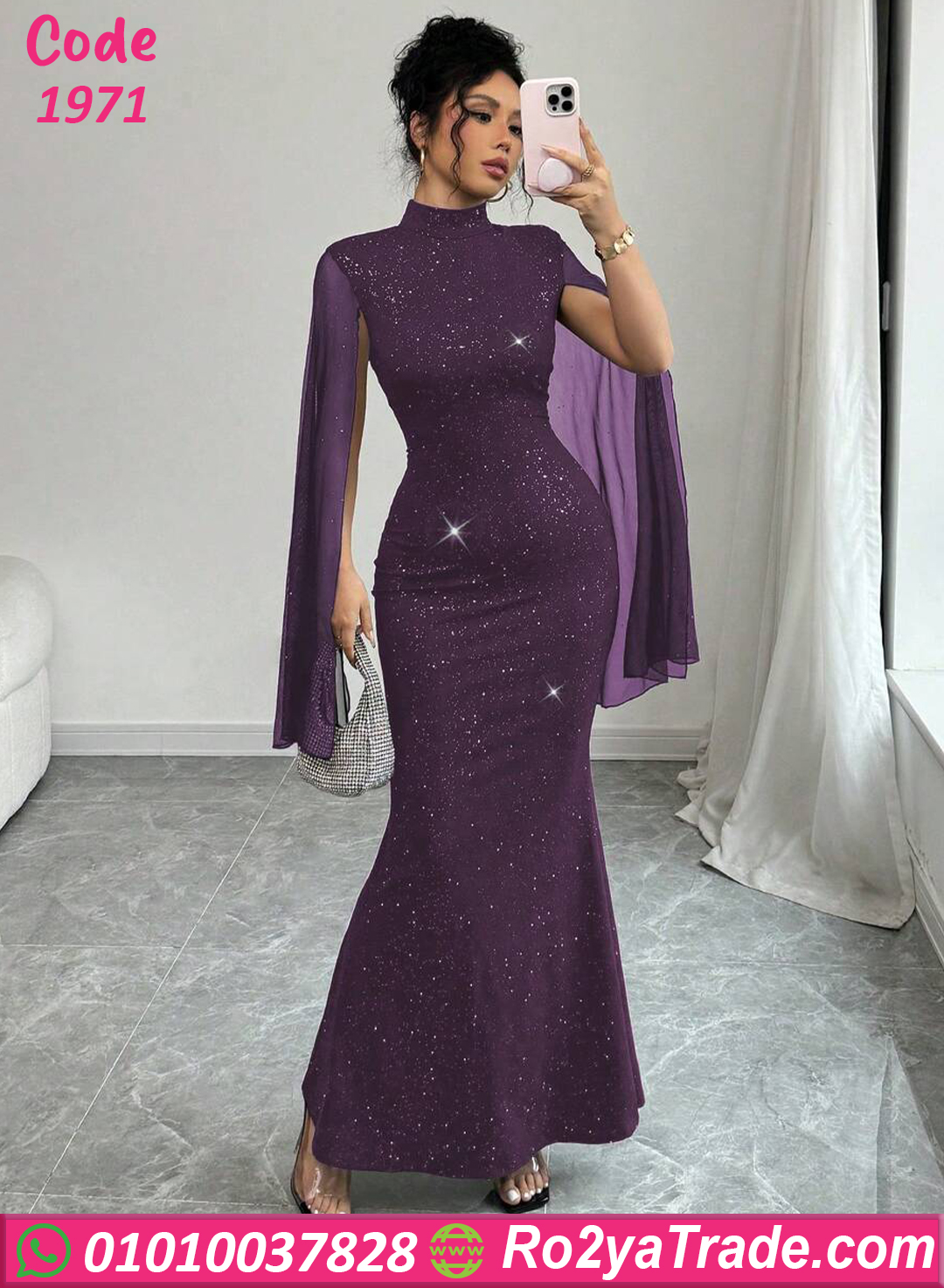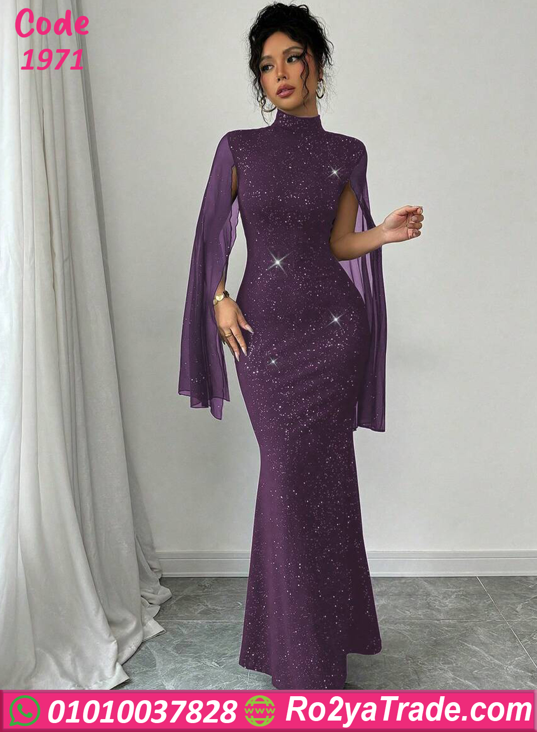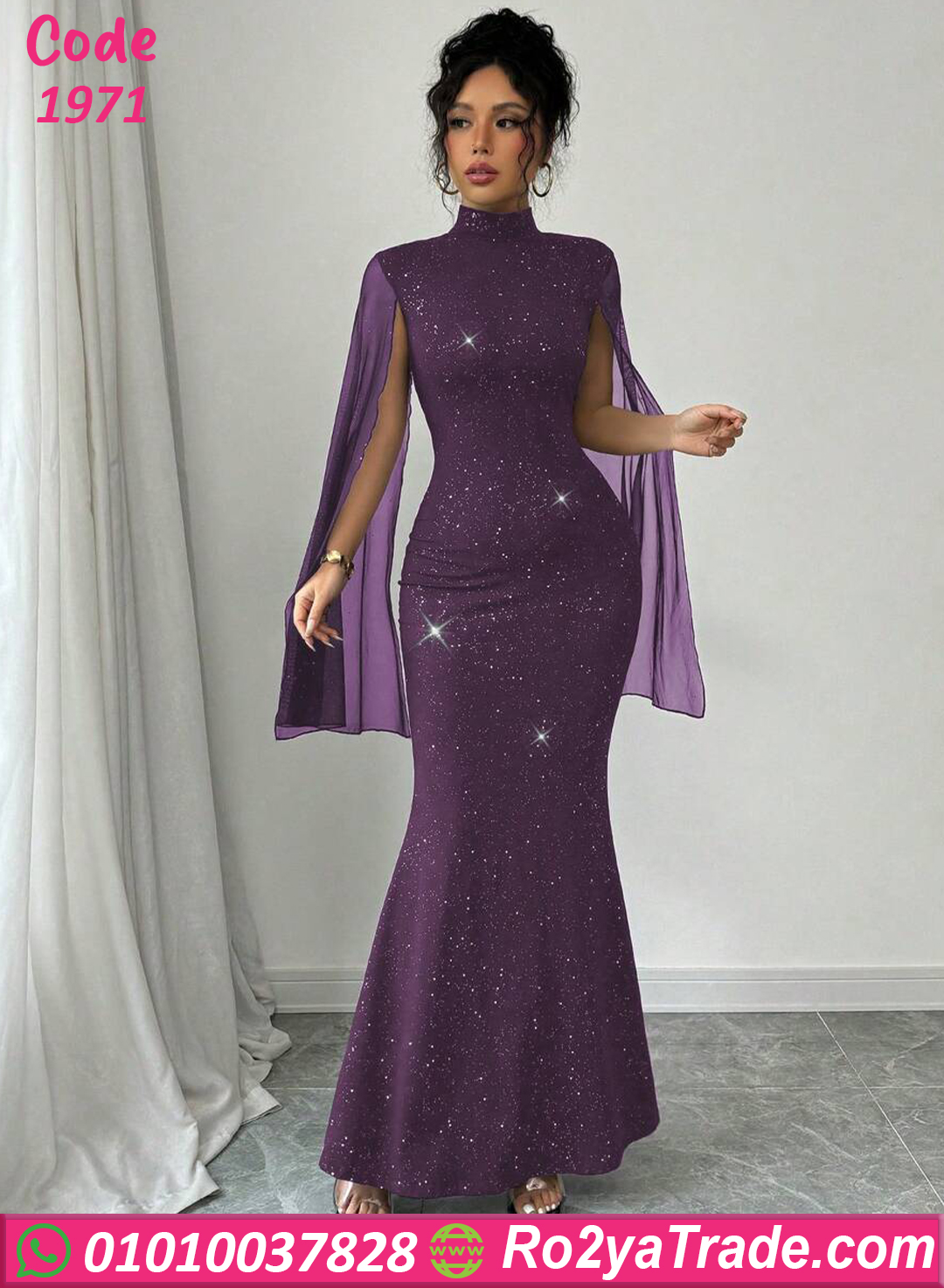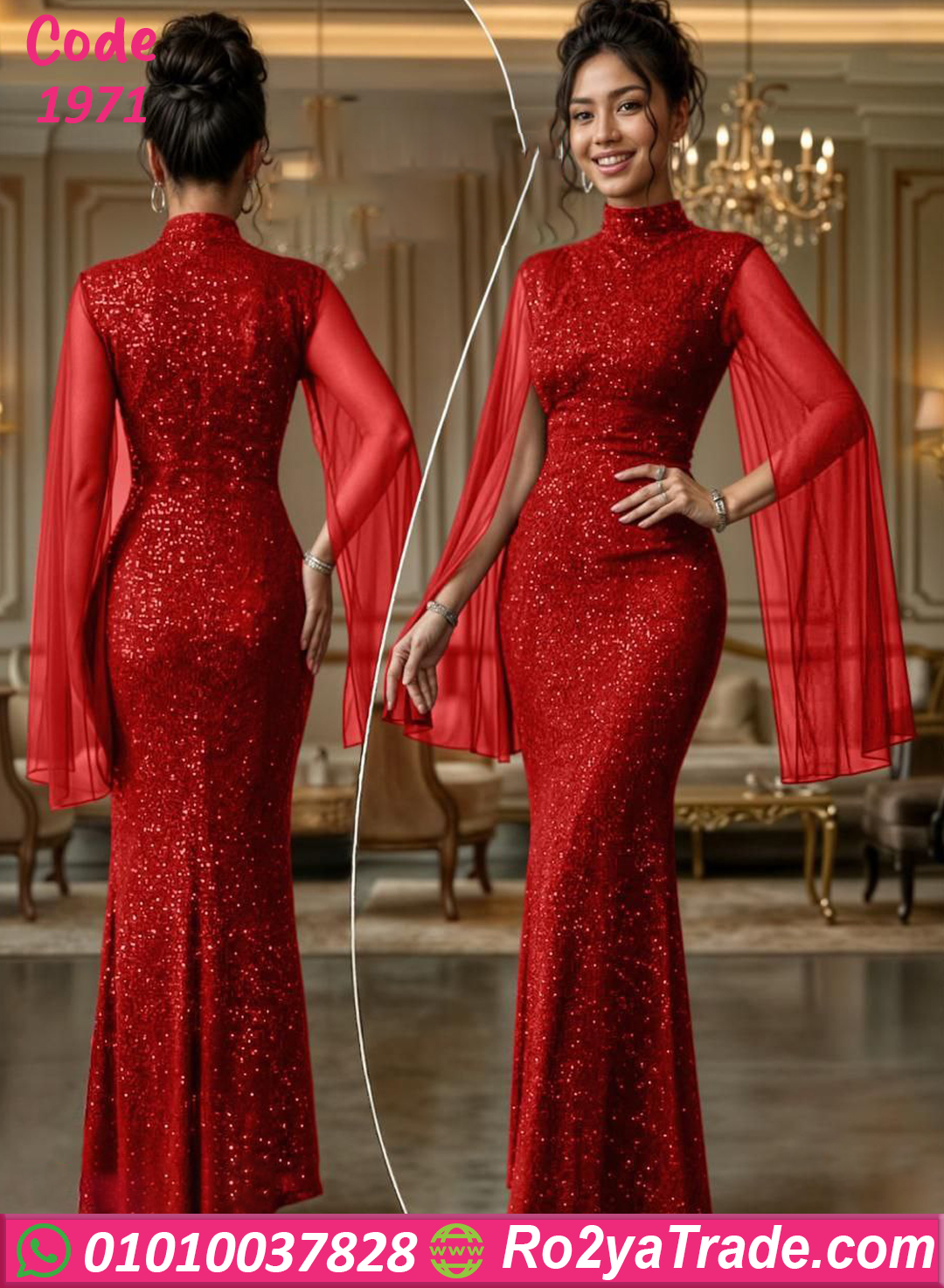 يأتي التصميم برقبة عالية أنيقة تضيف لمسة راقية، مع أكمام شفافة واسعة تعطي حركة أنيقة ومظهرًا فخمًا. كما أن التفاصيل اللامعة المنتشرة على الفستان تمنح التصميم بريقًا جذابًا يجعله مناسبًا للسهرات والمناسبات.