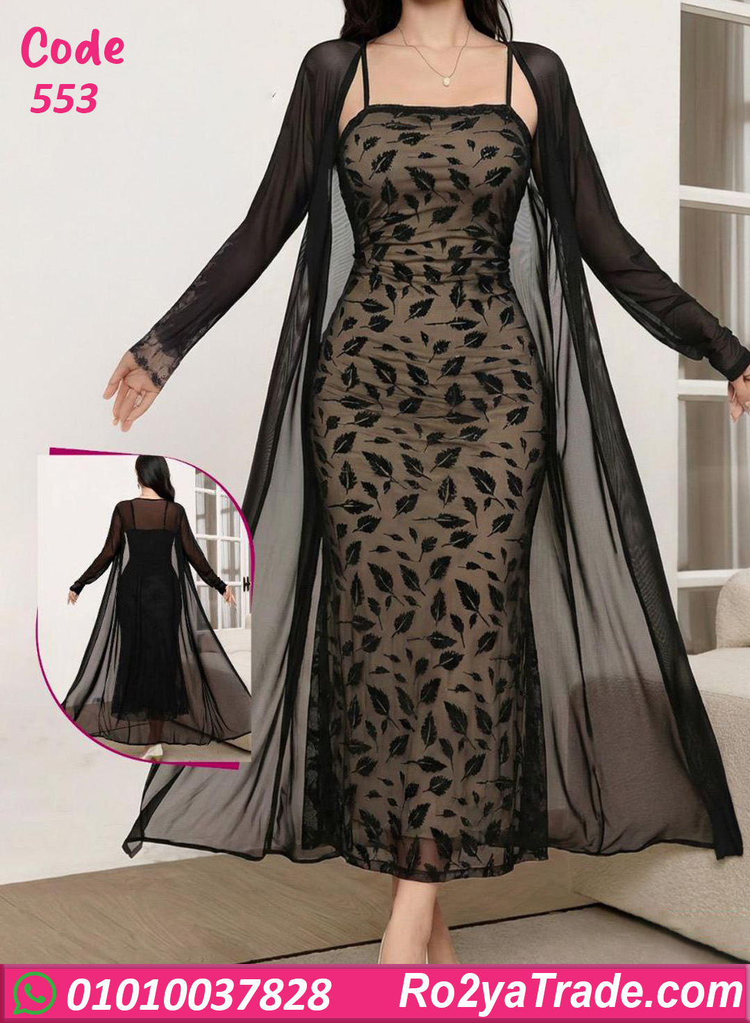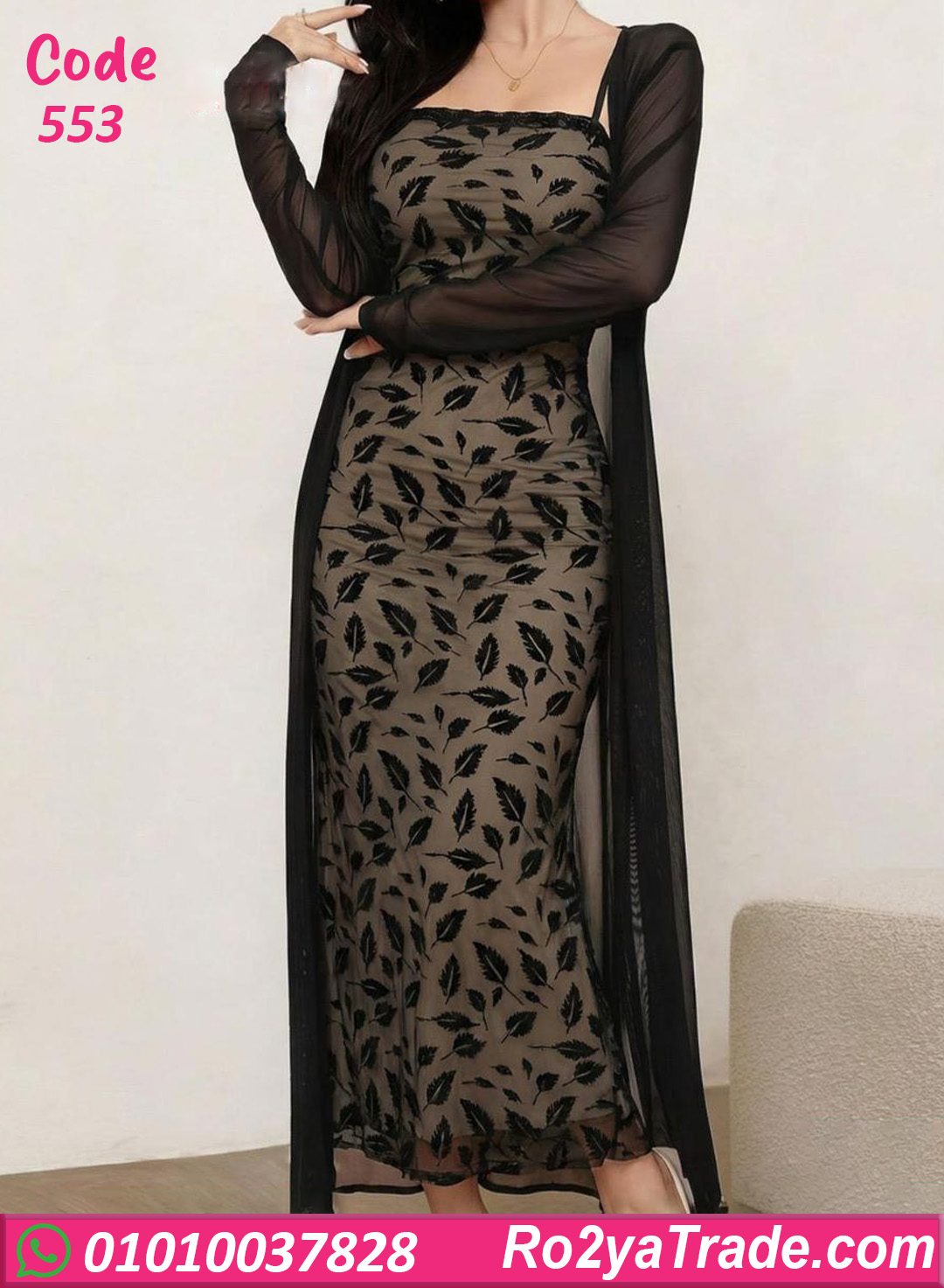 لو بتدوري على دريس صيفي طويل يجمع بين البساطة والأناقة، فالموديل ده اختيار موفق جدًا. التصميم طويل ومجسم بحمالات رفيعة مع طبقة شبك شفافة بأكمام طويلة بتدي لمسة شياكة مختلفة. نقشة الورق المميزة بتضيف شكل ناعم وأنثوي من غير مبالغة، وبتبرز القوام بشكل جذاب وراقي.