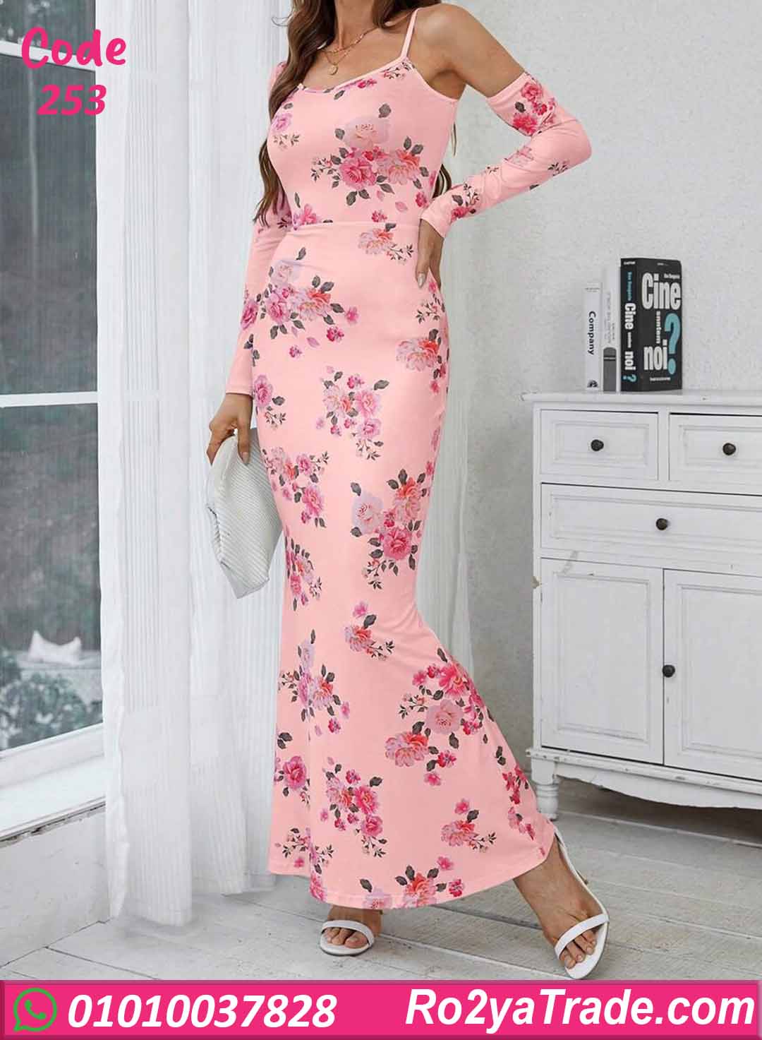 دريس صيفي طويل كود 253 بتصميم أنيق بطبعة ورد هادئة مع قصة شيك