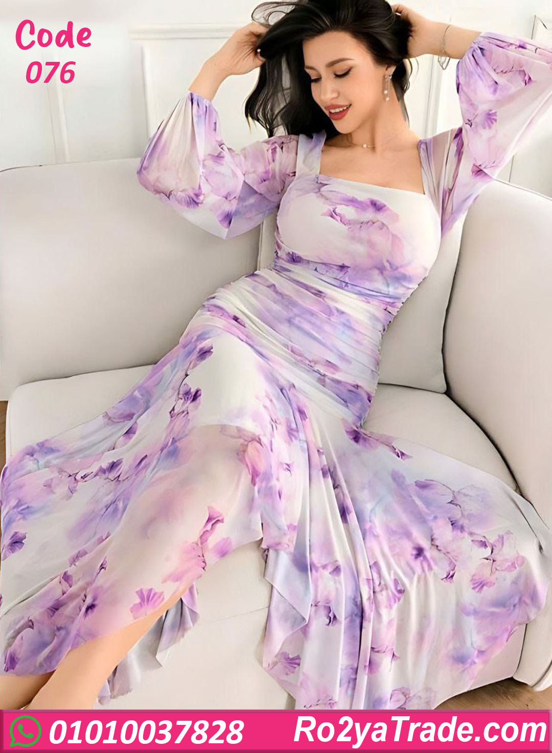 دريس صيفي طويل بتصميم شيك ومميز، خامته خفيفة وناعمة على الجسم ومناسبة للحر. النقشة الموف الهادية مع
